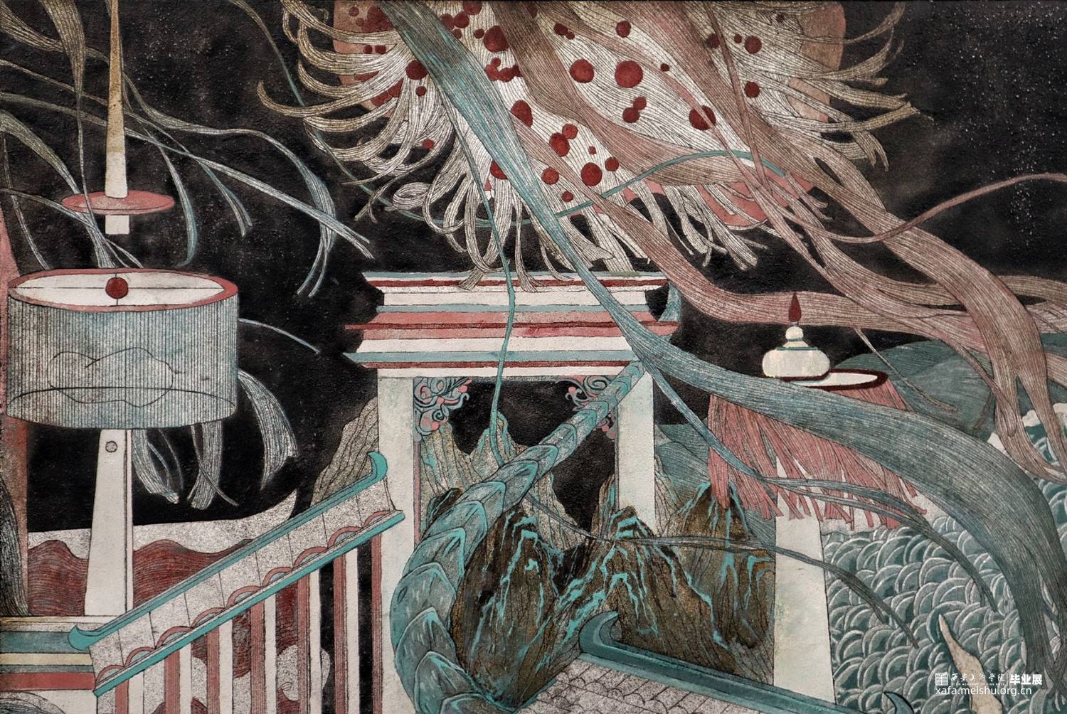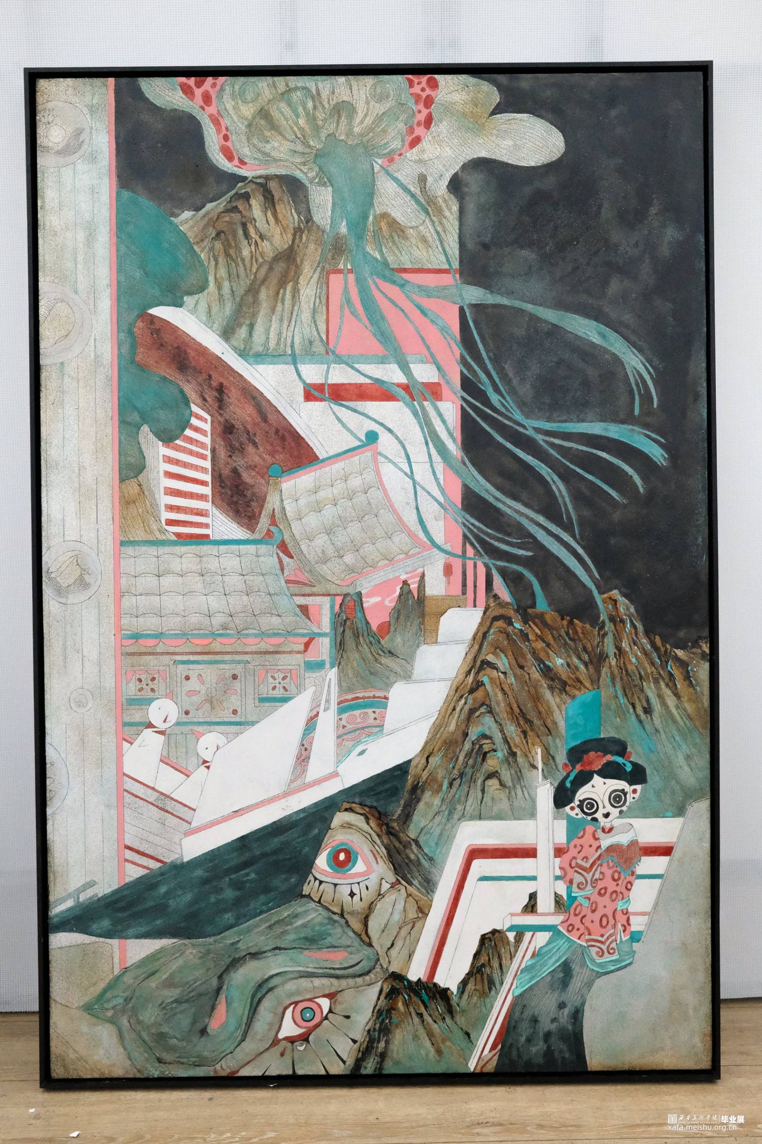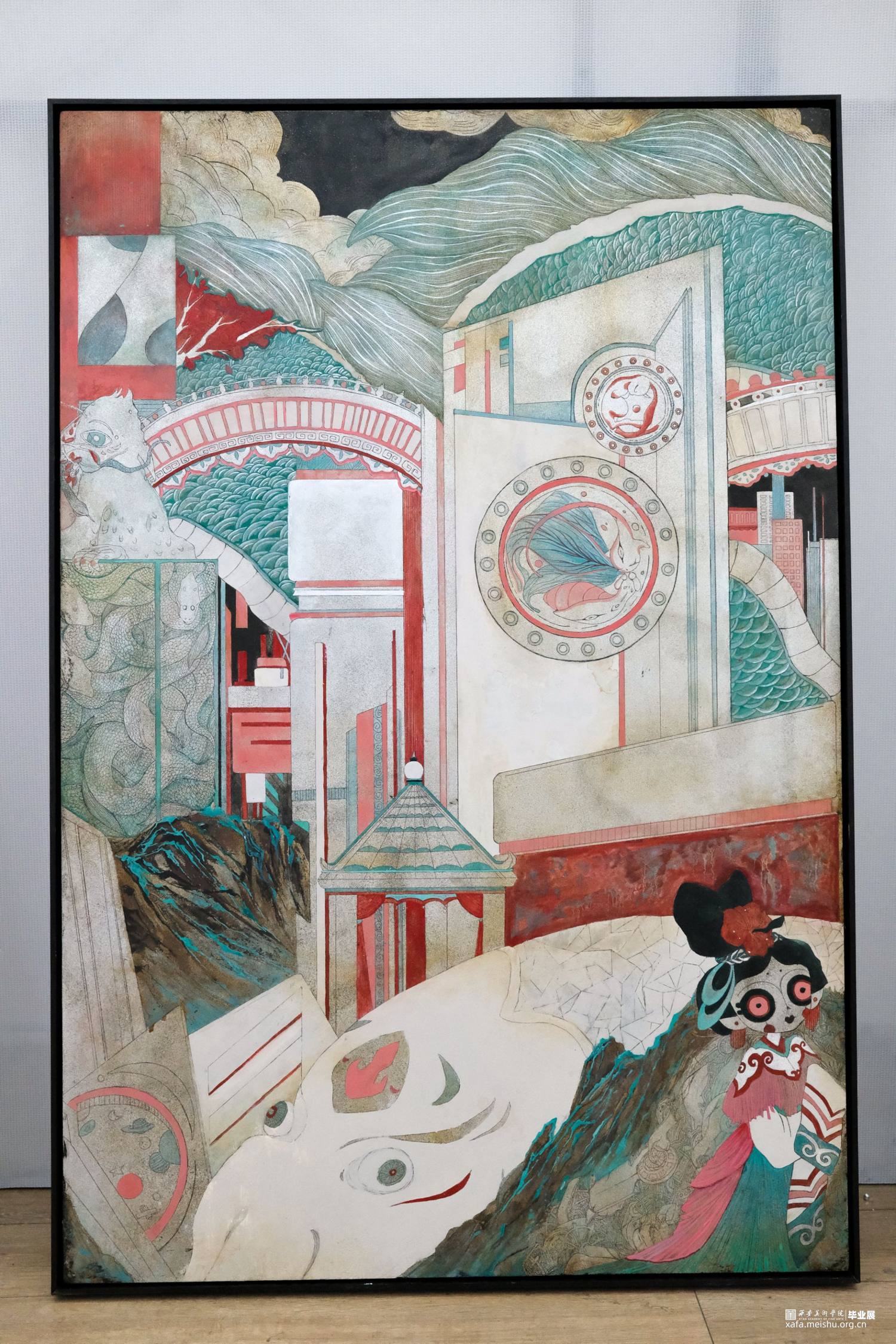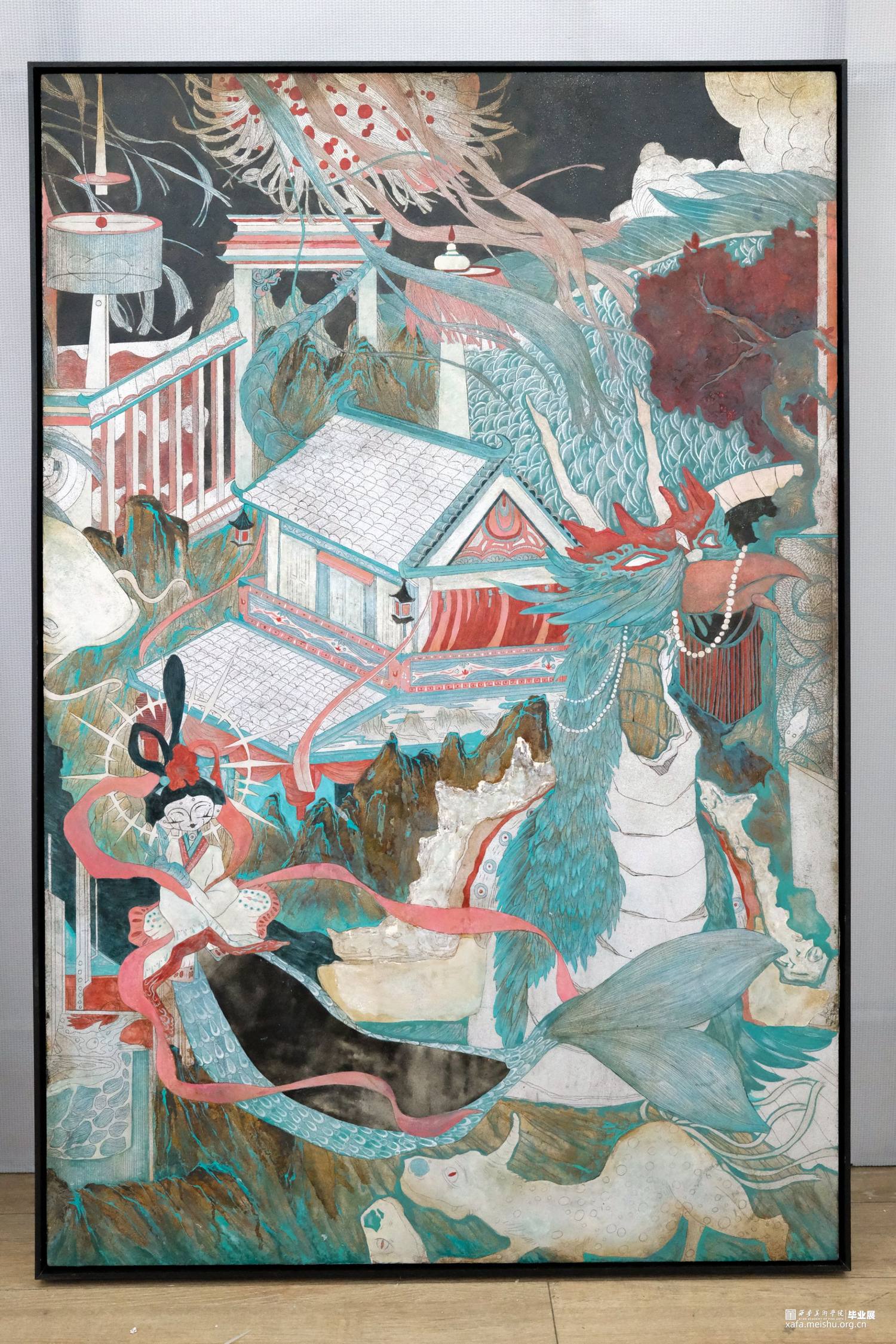 作品的画面故事讲述了未来世界的人们渴望创造出一个满足欲望的虚无世界,妙喜世界本是虚无的,由他们创造的妙喜世界便是归墟。作品中的异兽造型参考于山海经中对于部分异兽的描述,异兽大部分用作建筑房屋的装饰主体,在这之上加以饰品装饰。作品材料是由大漆制作的漆画,表面运用了铝箔粉制作出壁画肌理。整体画面色调以中国传统古典色调红绿为基调,点缀了粉与大漆颜色西安白为辅,多以绿色为主渲染素雅的画面色调。最终画面呈现出素雅却磅礴的世界。