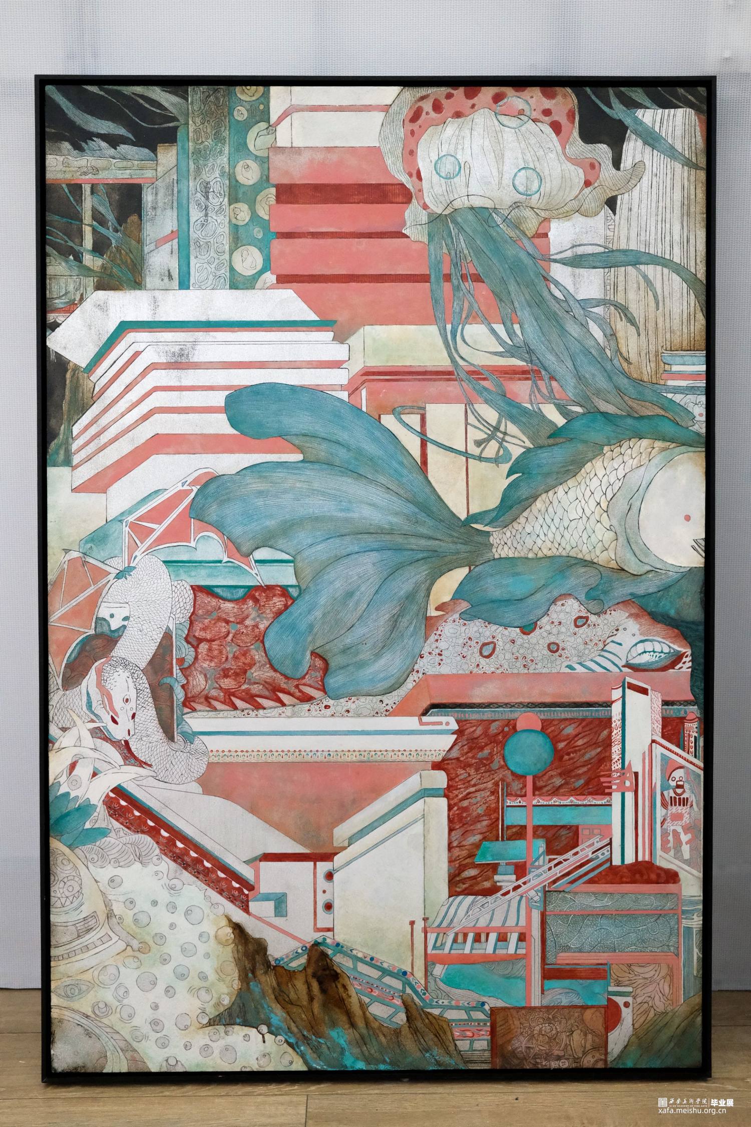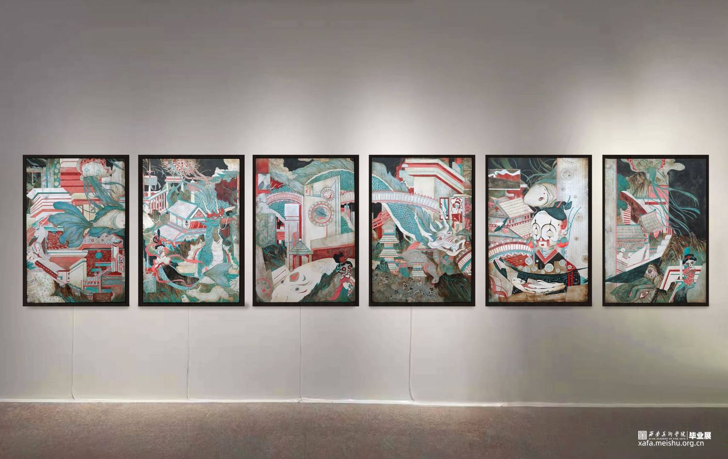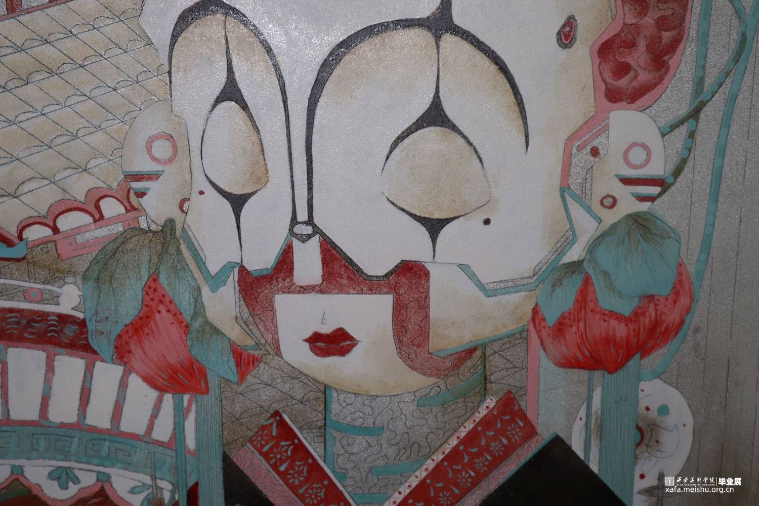 作品的画面故事讲述了未来世界的人们渴望创造出一个满足欲望的虚无世界,妙喜世界本是虚无的,由他们创造的妙喜世界便是归墟。作品中的异兽造型参考于山海经中对于部分异兽的描述,异兽大部分用作建筑房屋的装饰主体,在这之上加以饰品装饰。作品材料是由大漆制作的漆画,表面运用了铝箔粉制作出壁画肌理。整体画面色调以中国传统古典色调红绿为基调,点缀了粉与大漆颜色西安白为辅,多以绿色为主渲染素雅的画面色调。最终画面呈现出素雅却磅礴的世界。