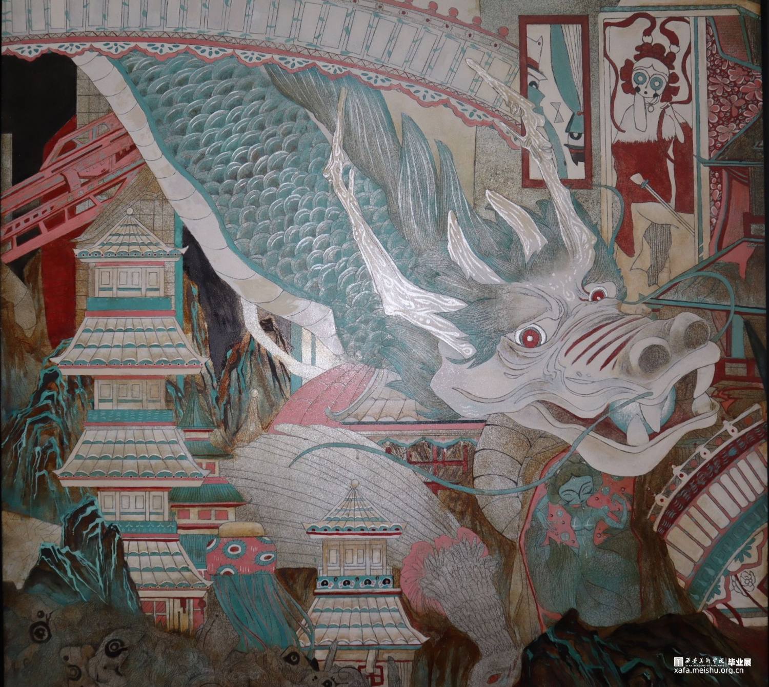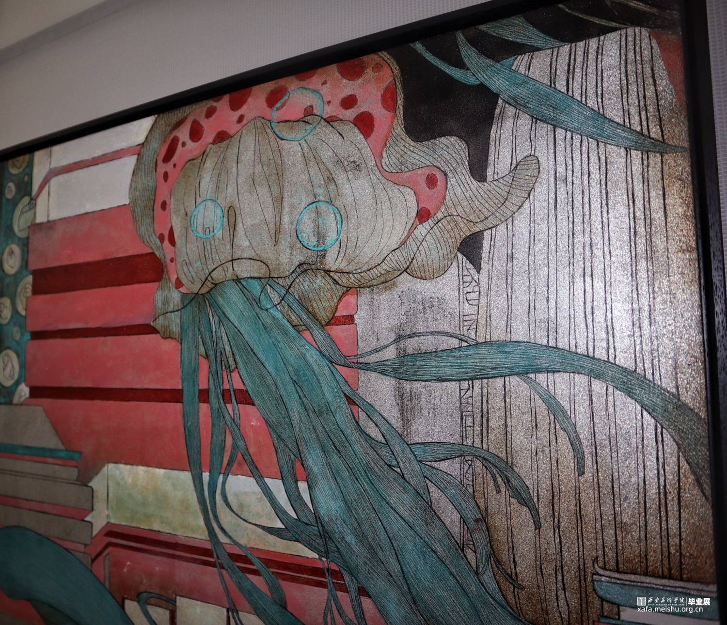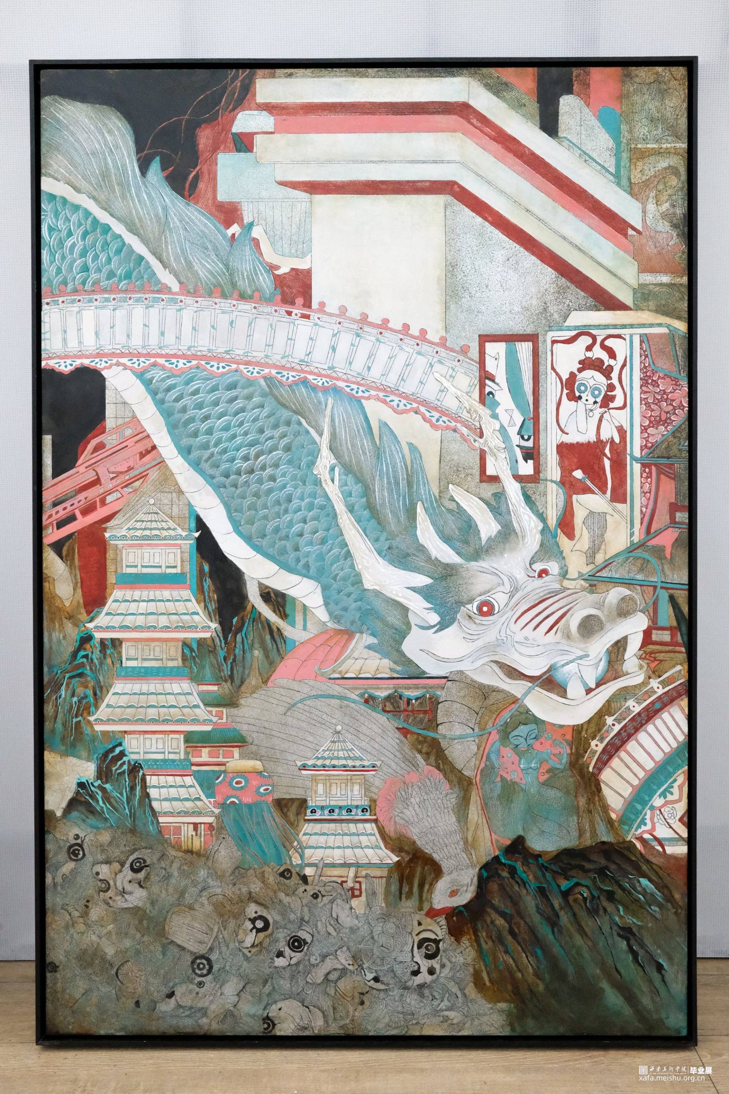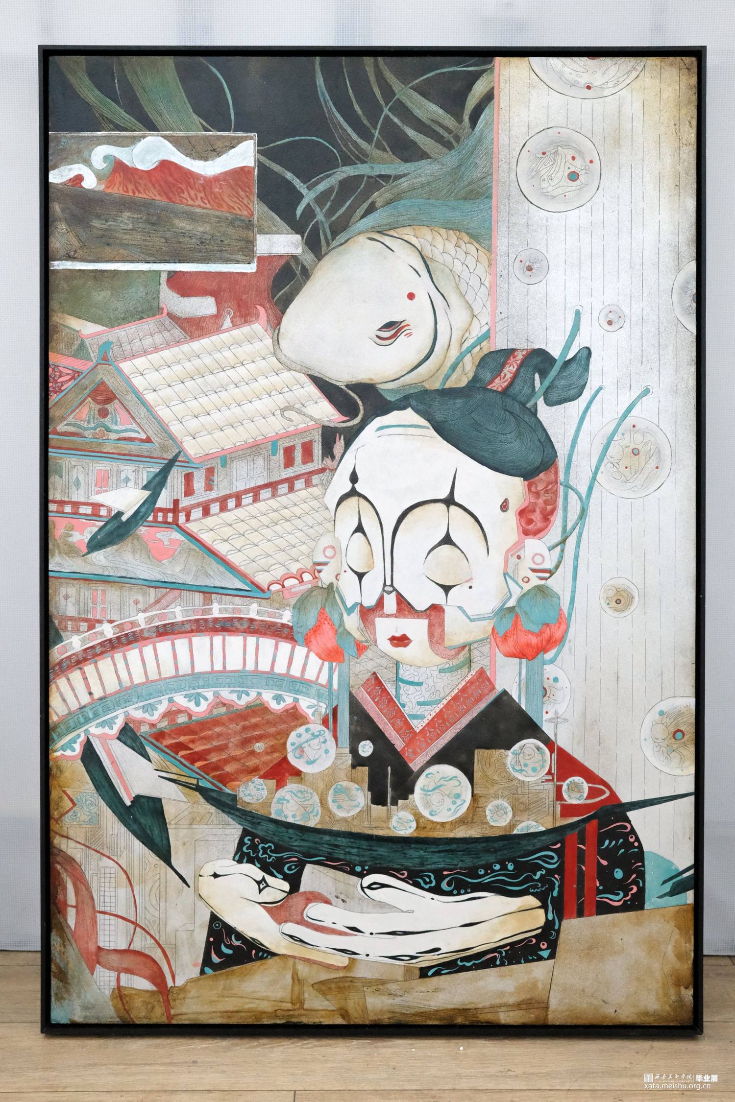 作品的画面故事讲述了未来世界的人们渴望创造出一个满足欲望的虚无世界,妙喜世界本是虚无的,由他们创造的妙喜世界便是归墟。作品中的异兽造型参考于山海经中对于部分异兽的描述,异兽大部分用作建筑房屋的装饰主体,在这之上加以饰品装饰。作品材料是由大漆制作的漆画,表面运用了铝箔粉制作出壁画肌理。整体画面色调以中国传统古典色调红绿为基调,点缀了粉与大漆颜色西安白为辅,多以绿色为主渲染素雅的画面色调。最终画面呈现出素雅却磅礴的世界。