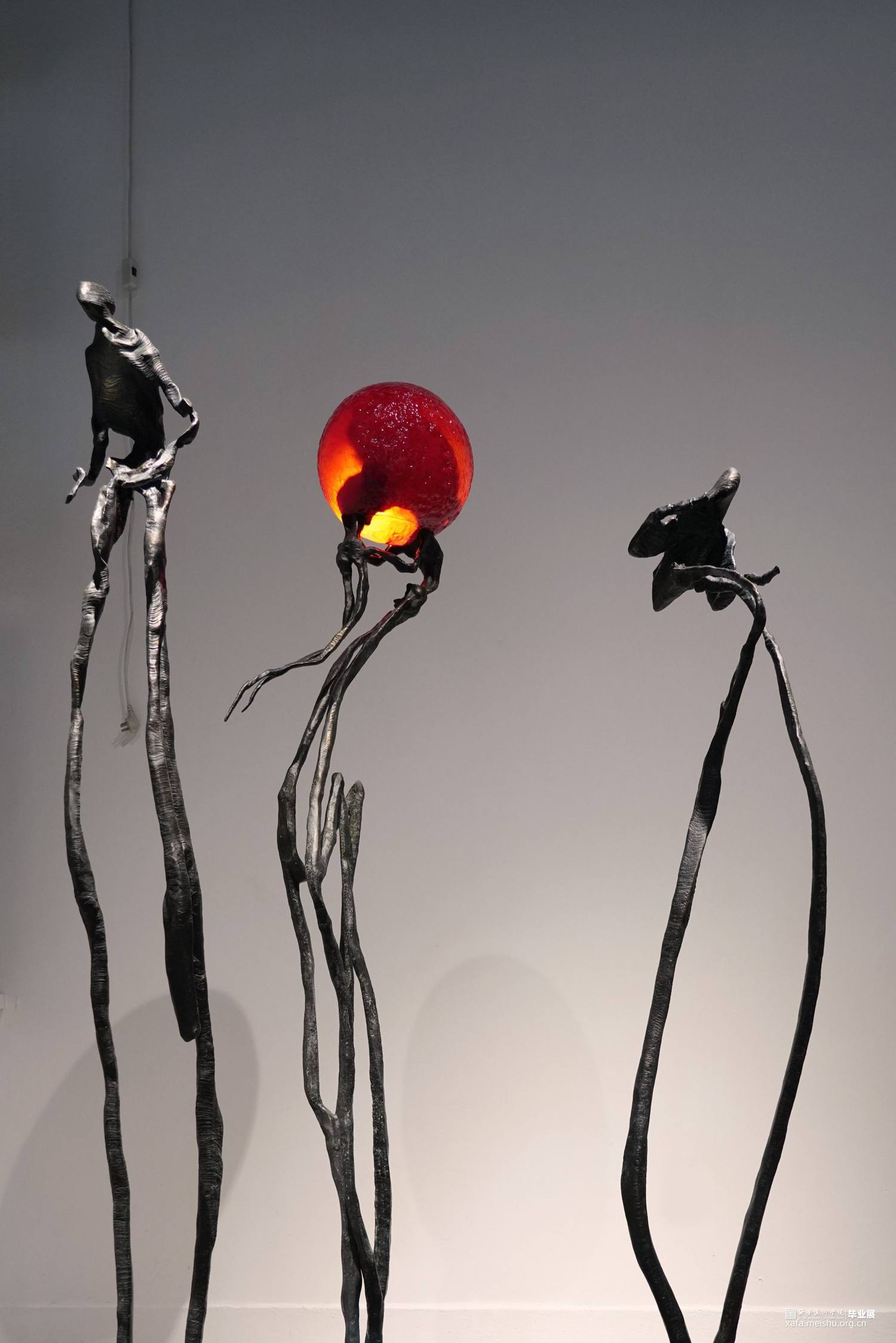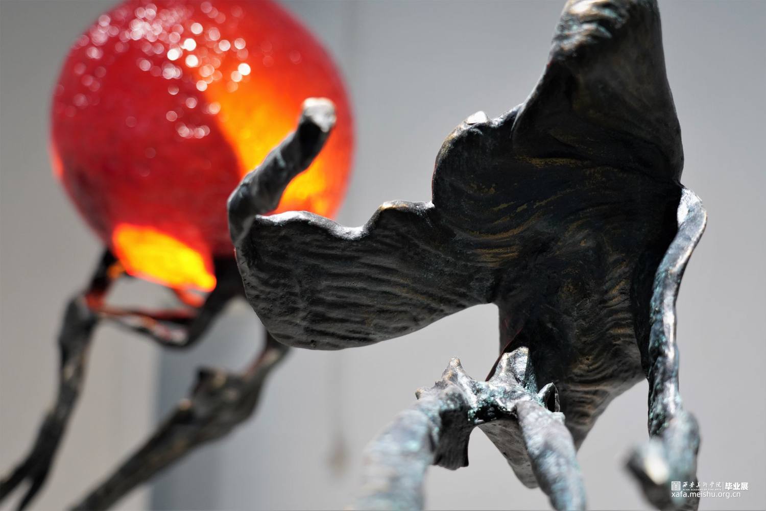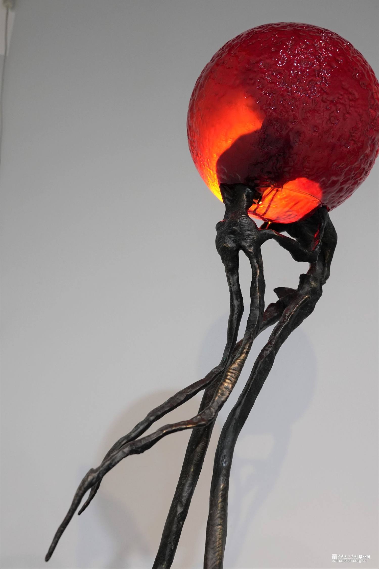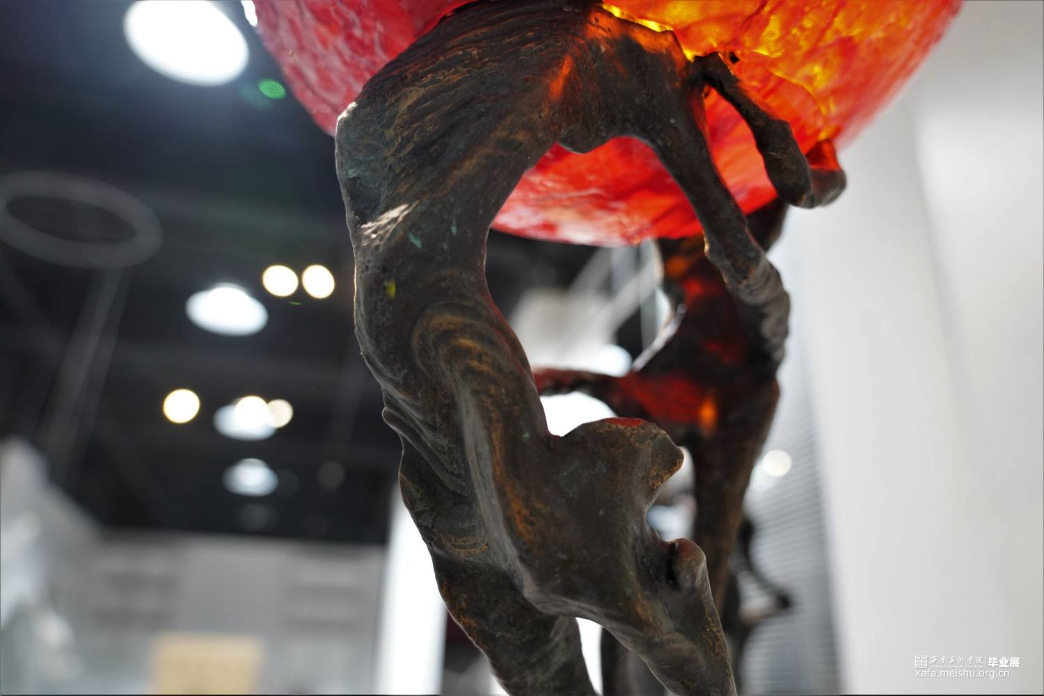 《5000万摄氏度》:作品主体部分为铜铸造,球体为透明树脂,内置红外线感应灯。整体高度为2米,宽约1.5米,长约5米。