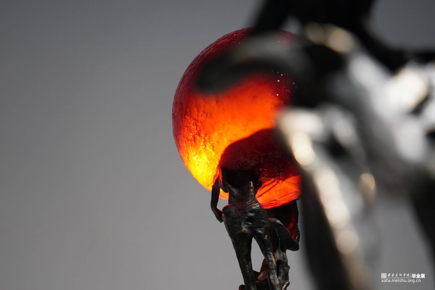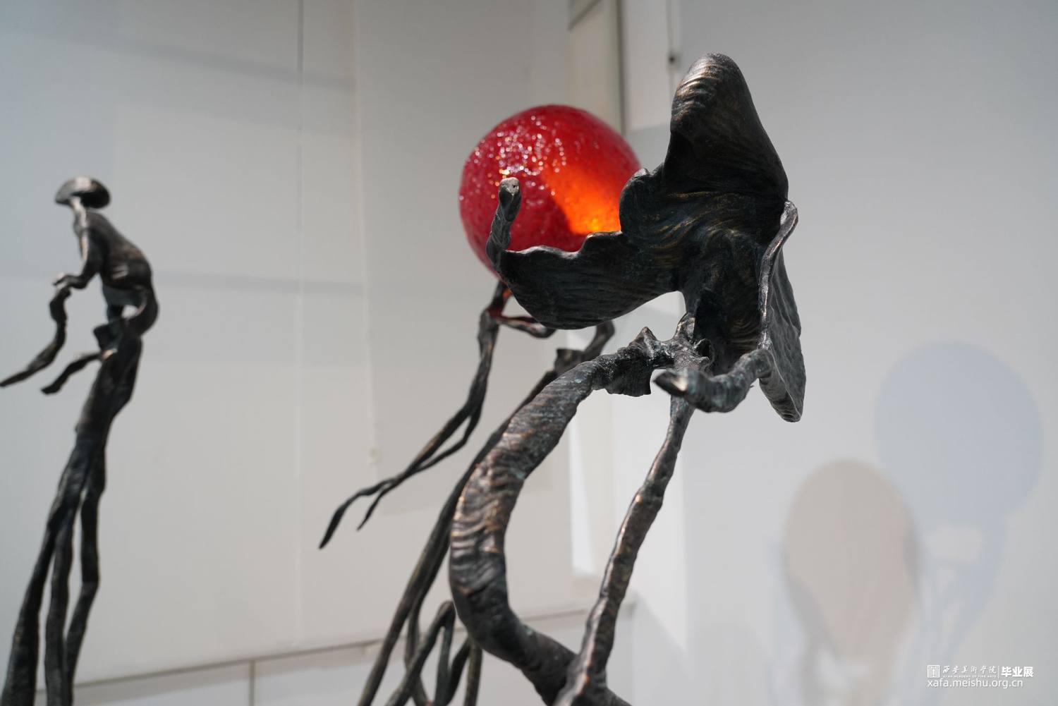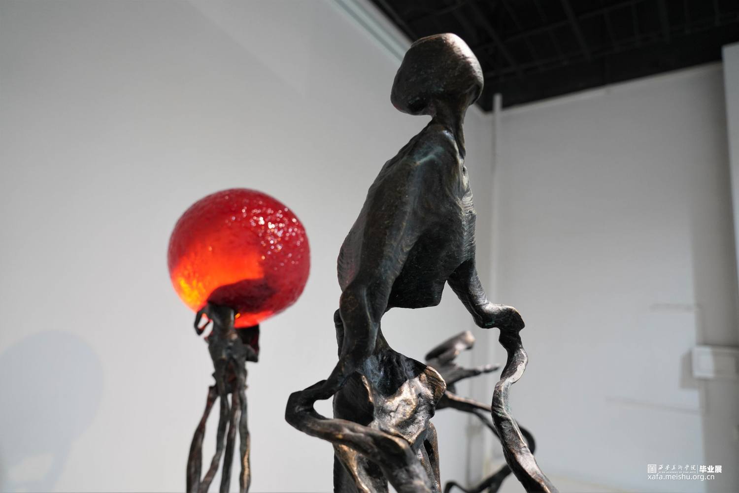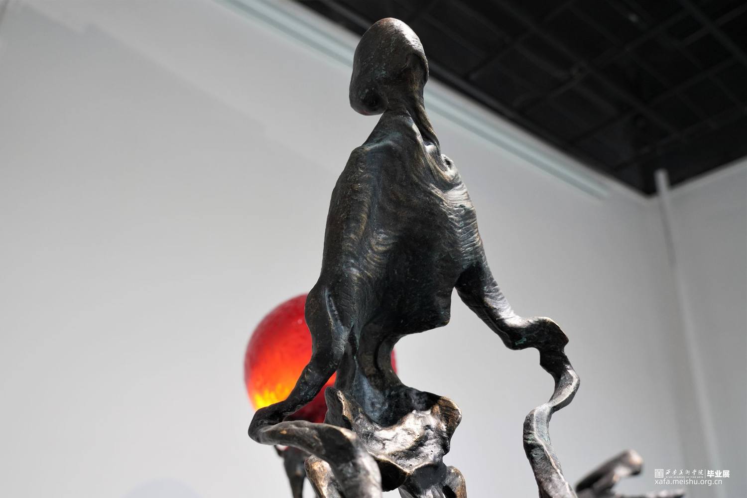 《5000万摄氏度》:作品主体部分为铜铸造,球体为透明树脂,内置红外线感应灯。整体高度为2米,宽约1.5米,长约5米。