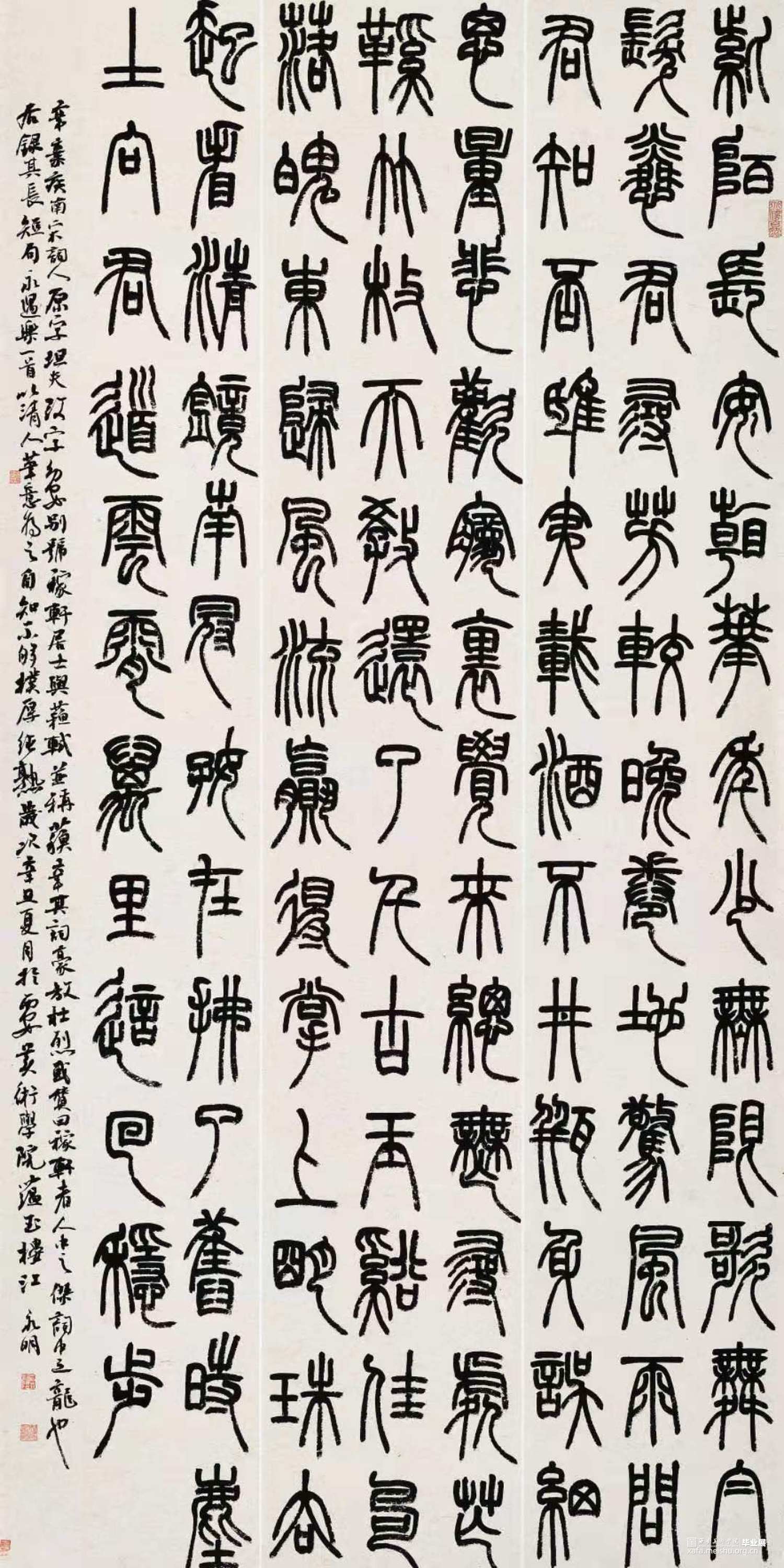 作品内容为篆书书写的辛弃疾的一首永遇乐,在完白与悲盫之间,既喜欢山人的古朴厚重,又有喜欢赵之谦的自然书写与节奏,故欲融之,但尚不完尚,落款行书借鉴鲁公与东坡。