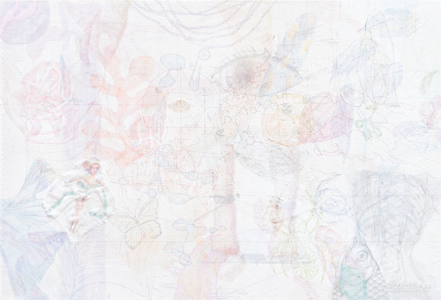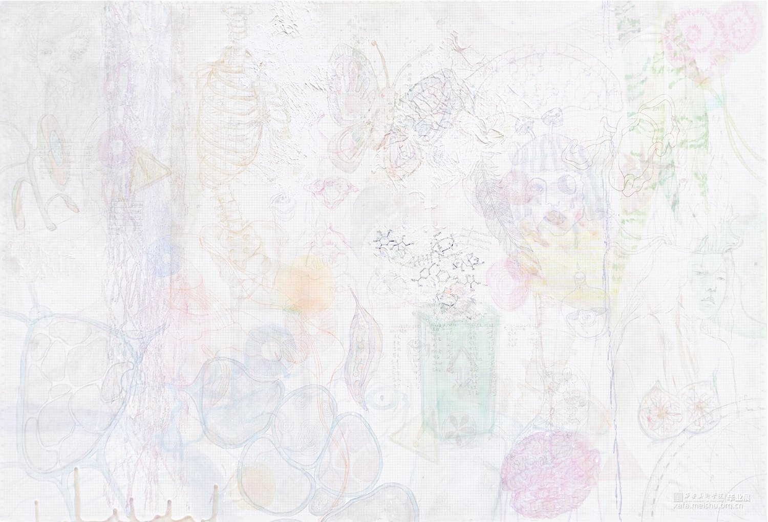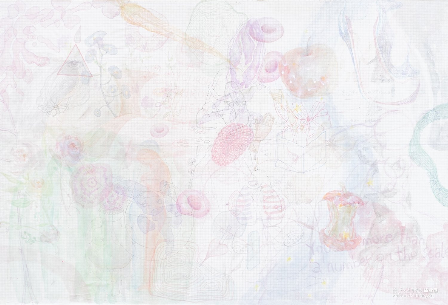《生命图式》源于个人经历,有关疾病、生命、身材焦虑。不断重复叠加的图像强调了创作的过程性和其中的心理变化,而非结果。作品以极淡的色彩绘于纸本和木板之上,“缺失”和“淡”作为一种符号表达了脆弱和生命的易逝。