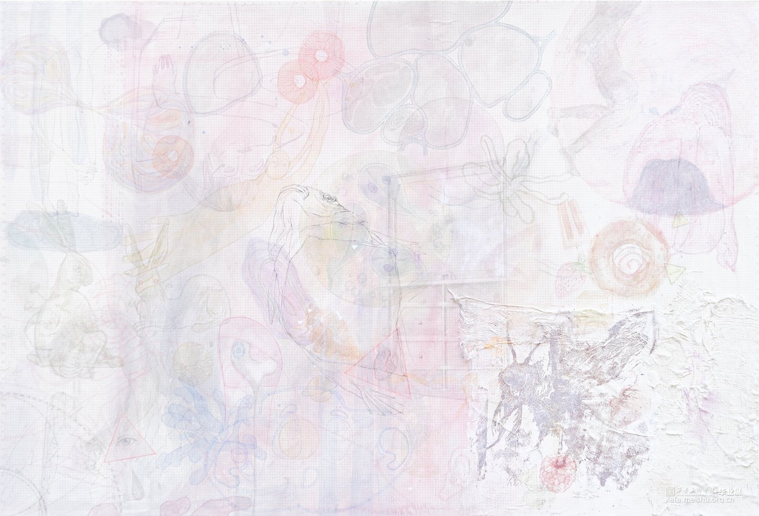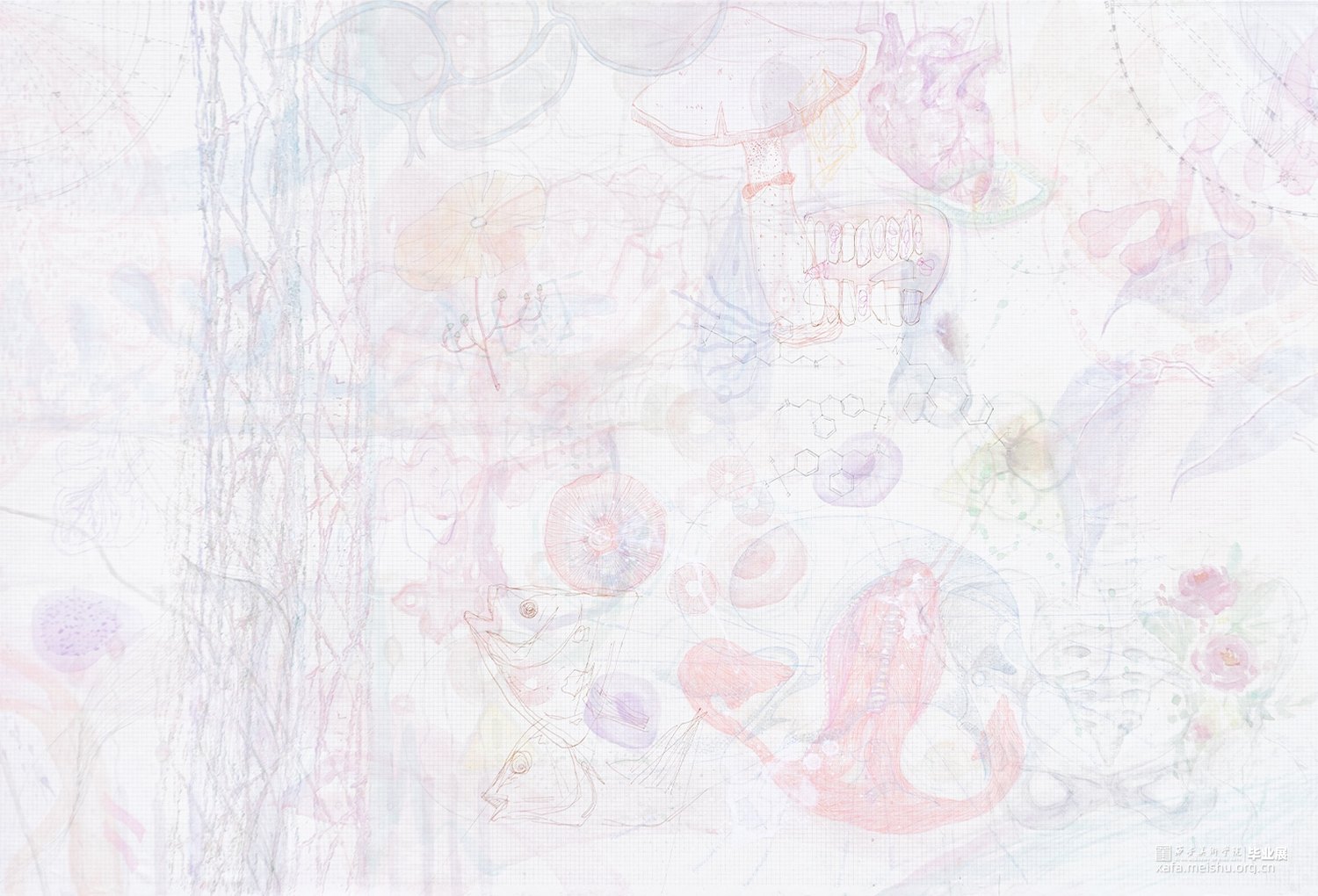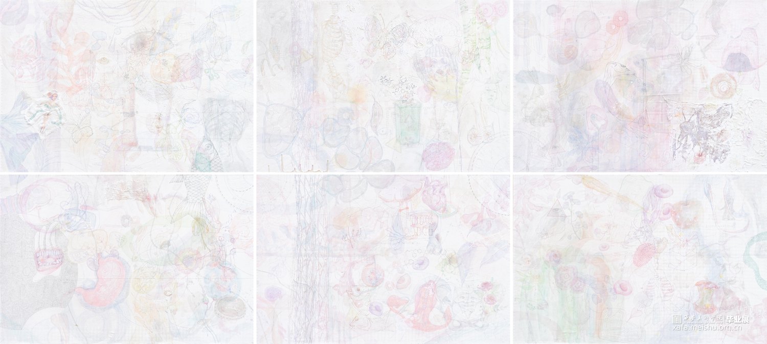 《生命图式》源于个人经历,有关疾病、生命、身材焦虑。不断重复叠加的图像强调了创作的过程性和其中的心理变化,而非结果。作品以极淡的色彩绘于纸本和木板之上,“缺失”和“淡”作为一种符号表达了脆弱和生命的易逝。