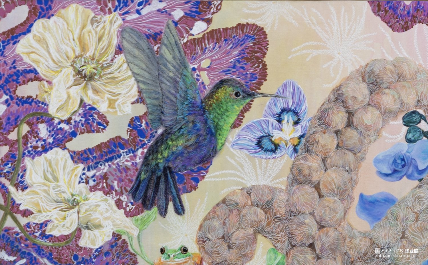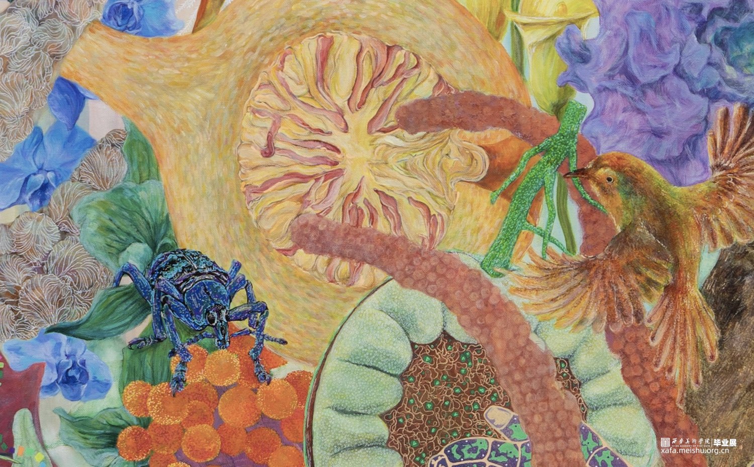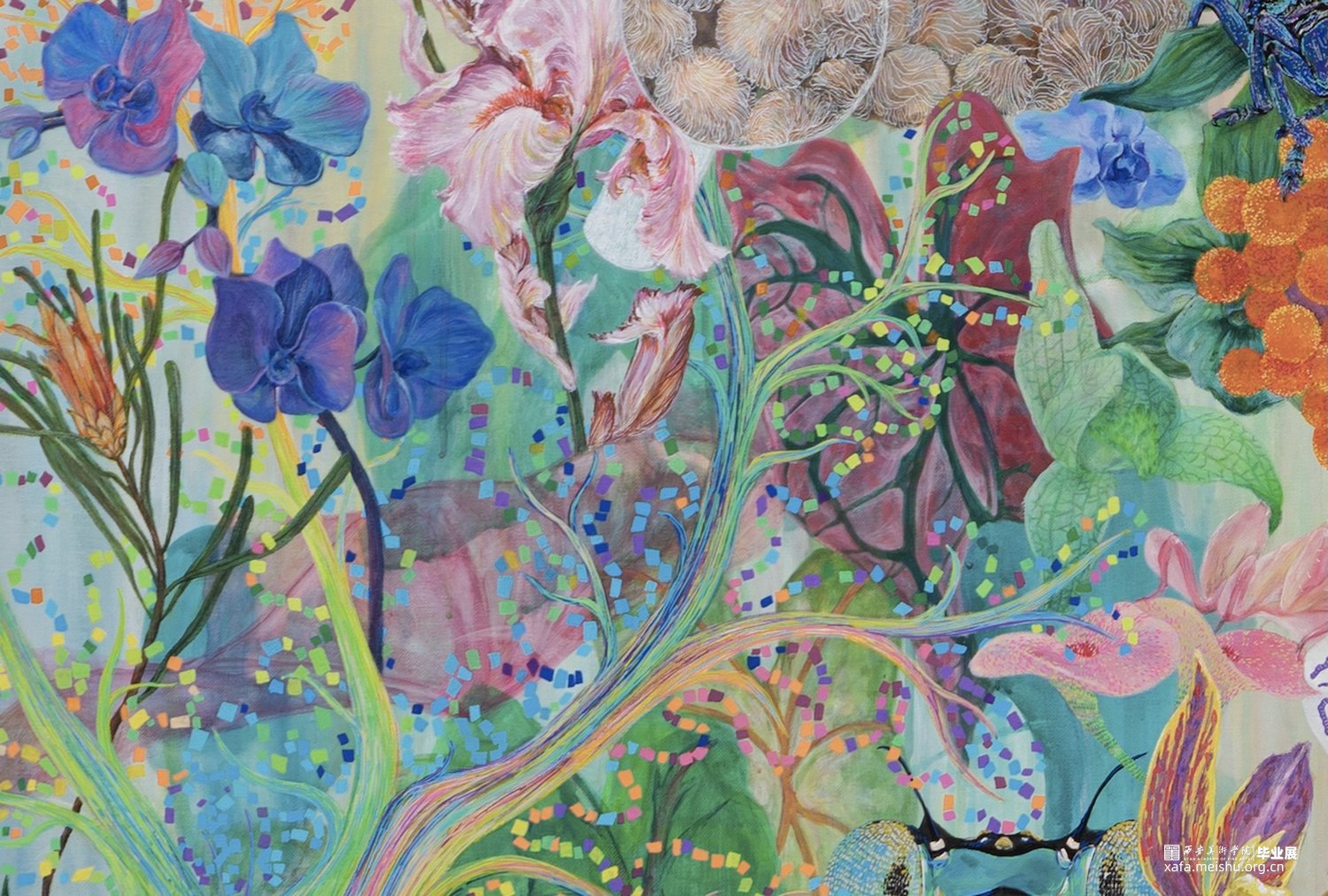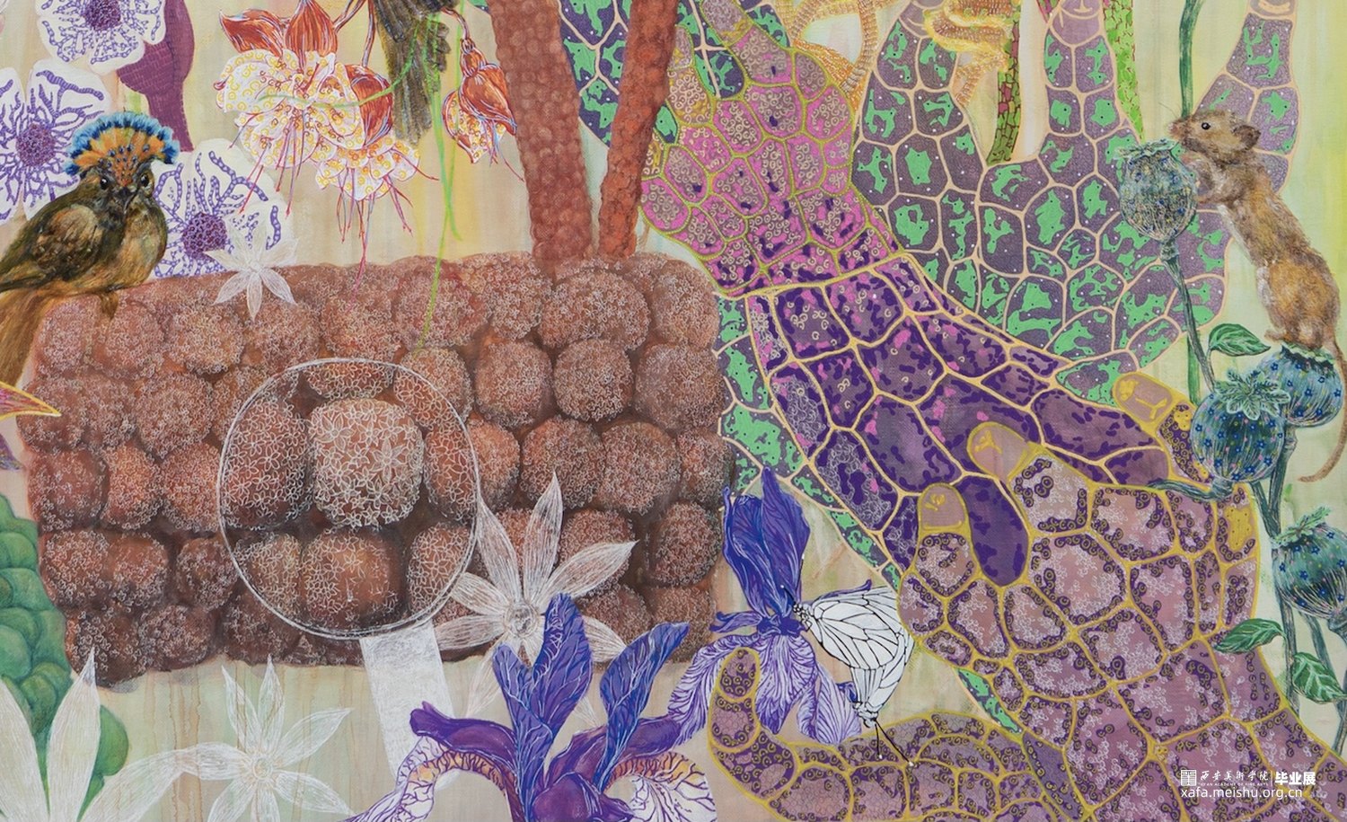 在日常生活中,我很喜欢观察身边植物的生长形态与变化,有一次翻阅手机的时候听到了植物的神奇的尖叫声,我于是对此产生了浓厚的兴趣,并发现了很多有关植物有趣的科学研究调查,让我更加觉得植物是有自己的情绪的,只是我们人类是很难直接通过自己的五官感受到,于是我想从微观视角展现植物在人类直接观测范围外的生命现象为切入点进行创作。希望可以用这种表现形式将植物奇妙有趣的现象传达给观众的同时可以启发观众对于植物产生更高的关注度。