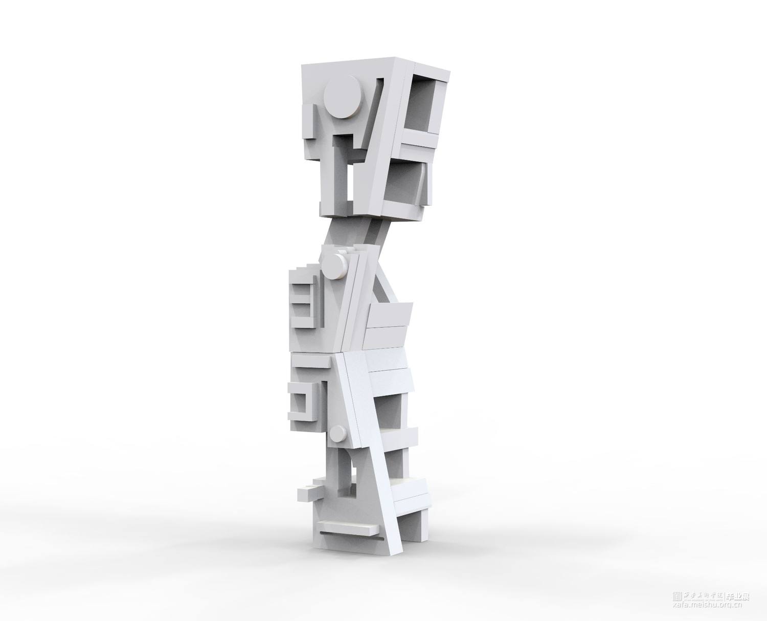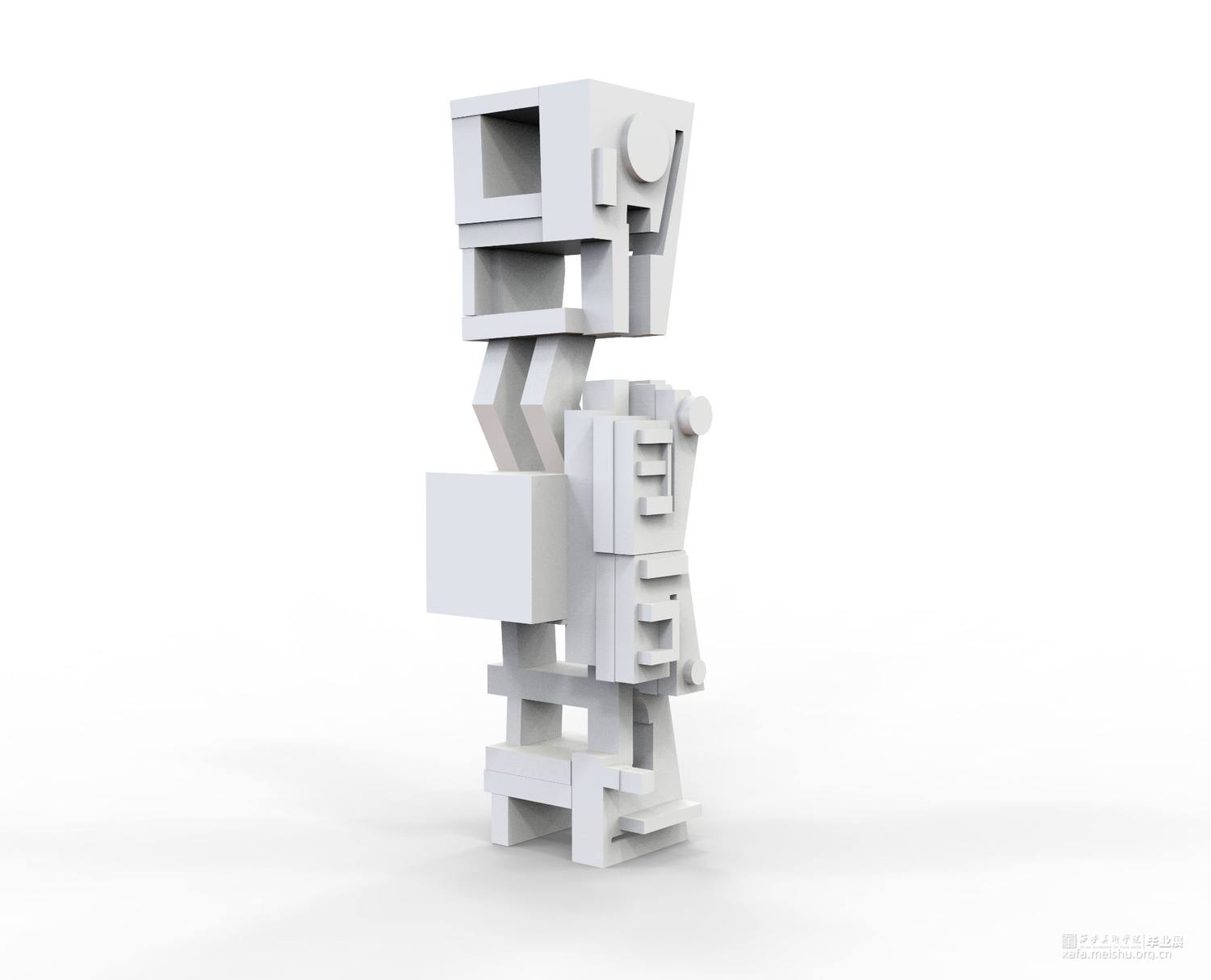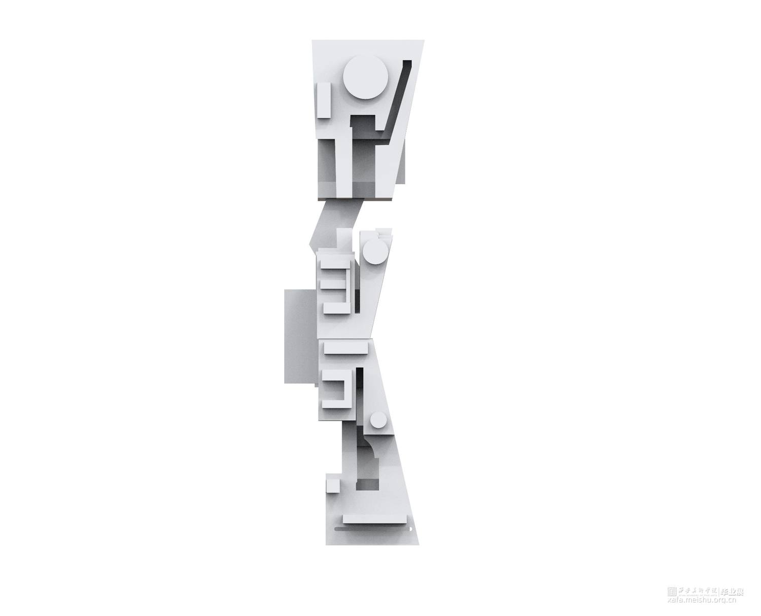 以一个老人的形状为模型,所以我想到了高科技产品下老人的形态,每个零件也代表了老人身体的某个部位及供身体所需的零件。人的生命是短暂的,但可以靠科技的威力得以修复及维护,但高科技同时也给我们带来了危机,高科技的低生活之感,与对未来科技的担忧向往及迷茫。