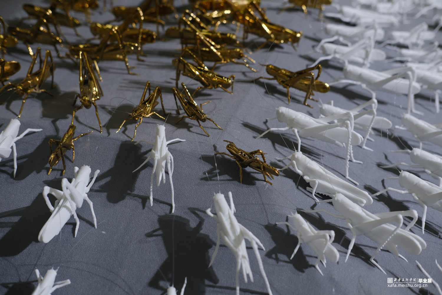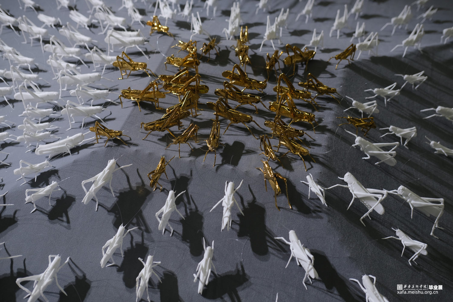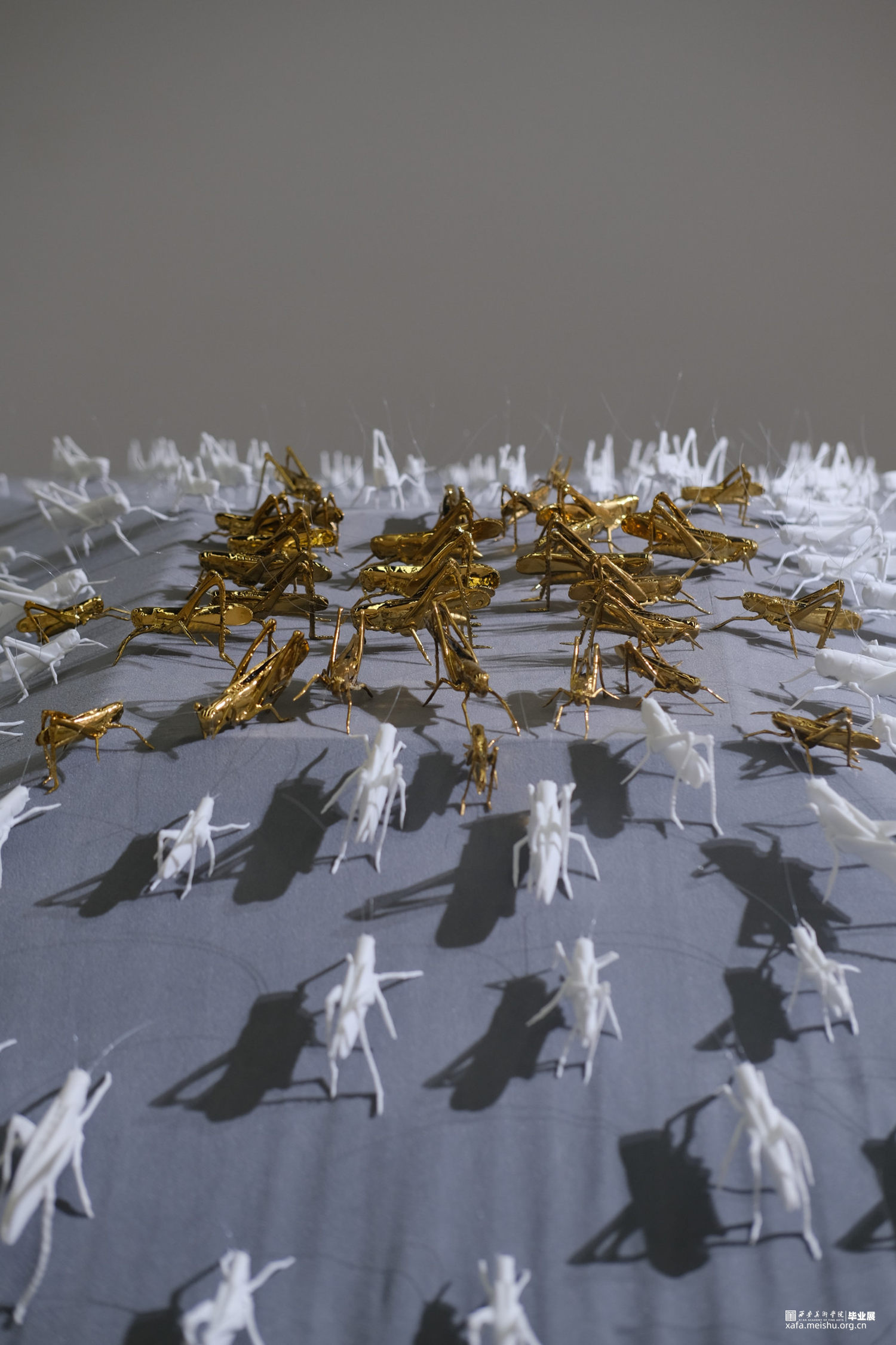作品说明:蜂拥的蝗虫仿佛密集人群,带着侵略和扩张尽情肆虐,目光所及,皆是欲望。作品采用绒布架构出高低落差式展台,蝗虫个体以薄胎陶瓷制作,虫群以朝着最高点的趋势聚拢,向上的过程拥挤激烈。攀至顶点的蝗虫,以镀金展示。绒布之下,覆盖以虫卵堆积而成的立方体声音装置,音频由星星点点的蝗虫声逐渐高涨,如欲望无止境,虫声夹杂窃窃私语声表达内心深处的躁动。蝗虫在灯光照耀下拉长变形的投影,表达每一个光鲜亮丽背后充斥着内在需求,越临近顶点背后的投影越多。暗示了当下社会人们追逐欲望的内心状态。