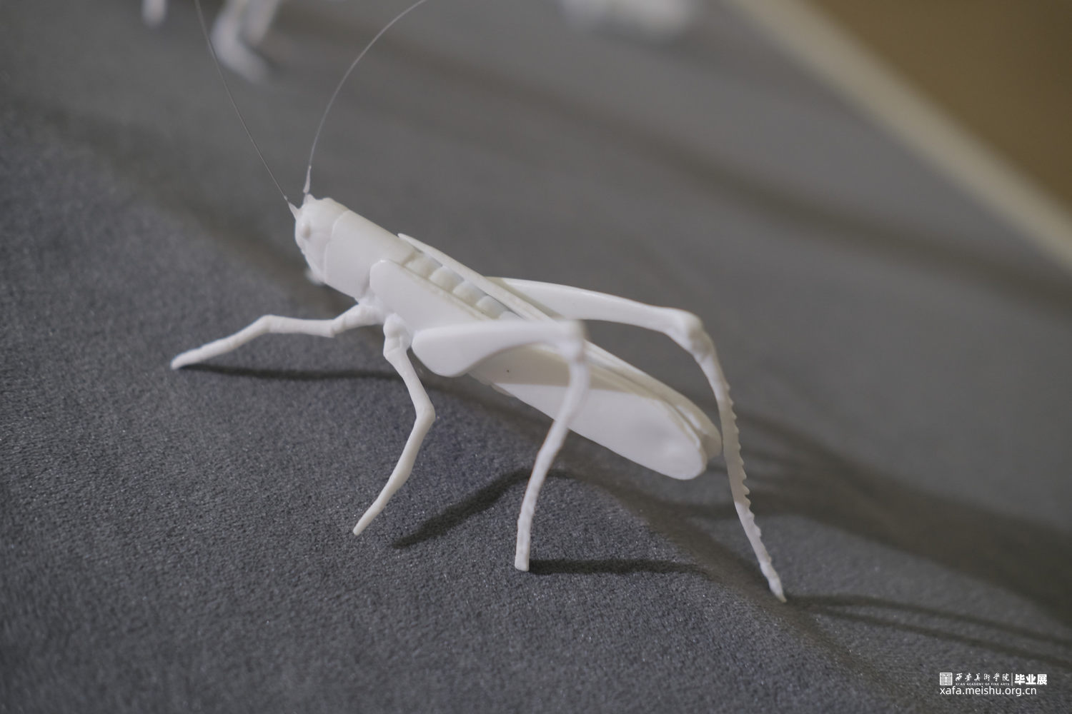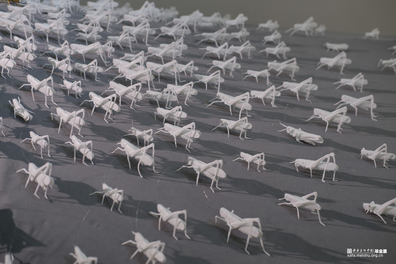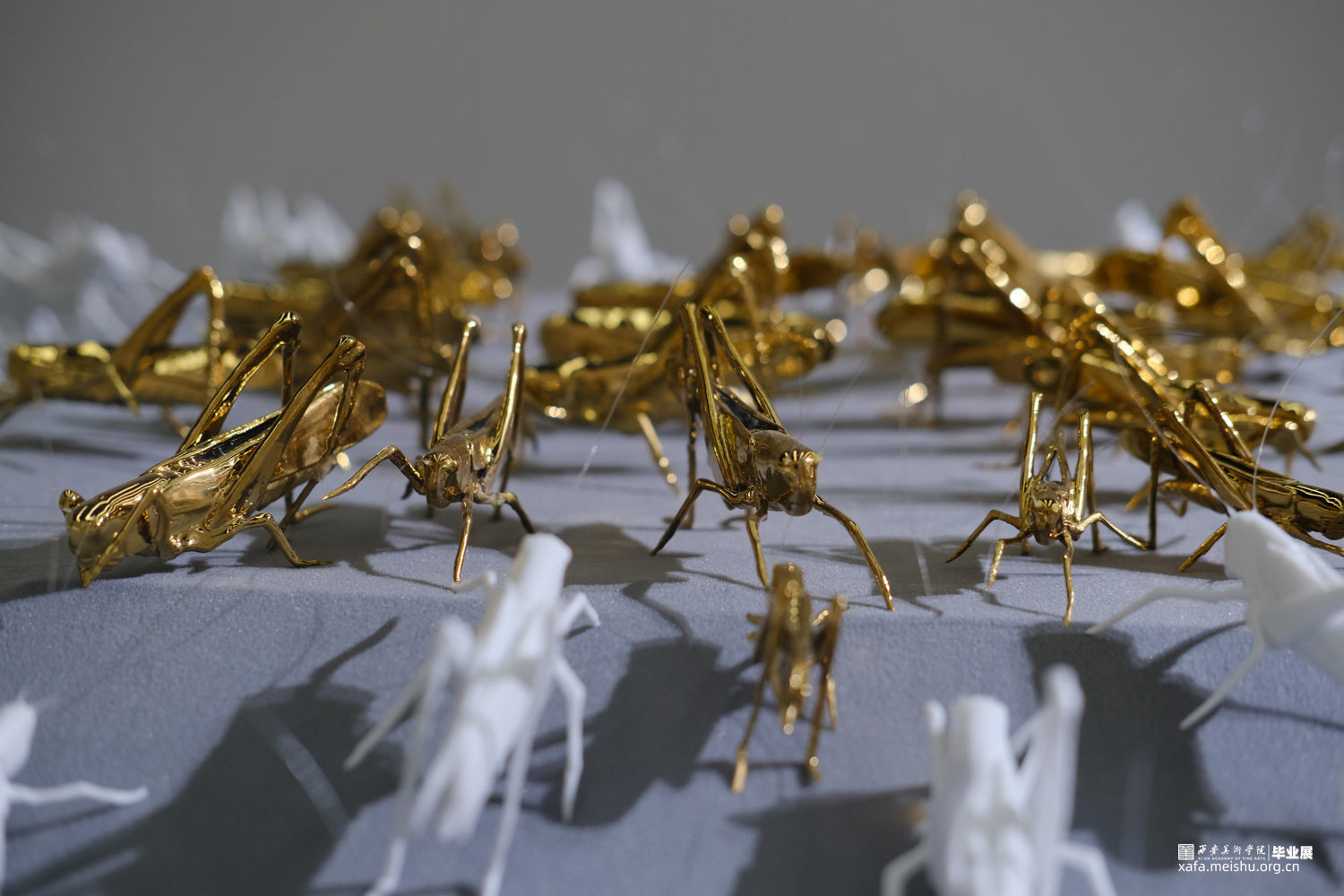 作品说明:蜂拥的蝗虫仿佛密集人群,带着侵略和扩张尽情肆虐,目光所及,皆是欲望。作品采用绒布架构出高低落差式展台,蝗虫个体以薄胎陶瓷制作,虫群以朝着最高点的趋势聚拢,向上的过程拥挤激烈。攀至顶点的蝗虫,以镀金展示。绒布之下,覆盖以虫卵堆积而成的立方体声音装置,音频由星星点点的蝗虫声逐渐高涨,如欲望无止境,虫声夹杂窃窃私语声表达内心深处的躁动。蝗虫在灯光照耀下拉长变形的投影,表达每一个光鲜亮丽背后充斥着内在需求,越临近顶点背后的投影越多。暗示了当下社会人们追逐欲望的内心状态。