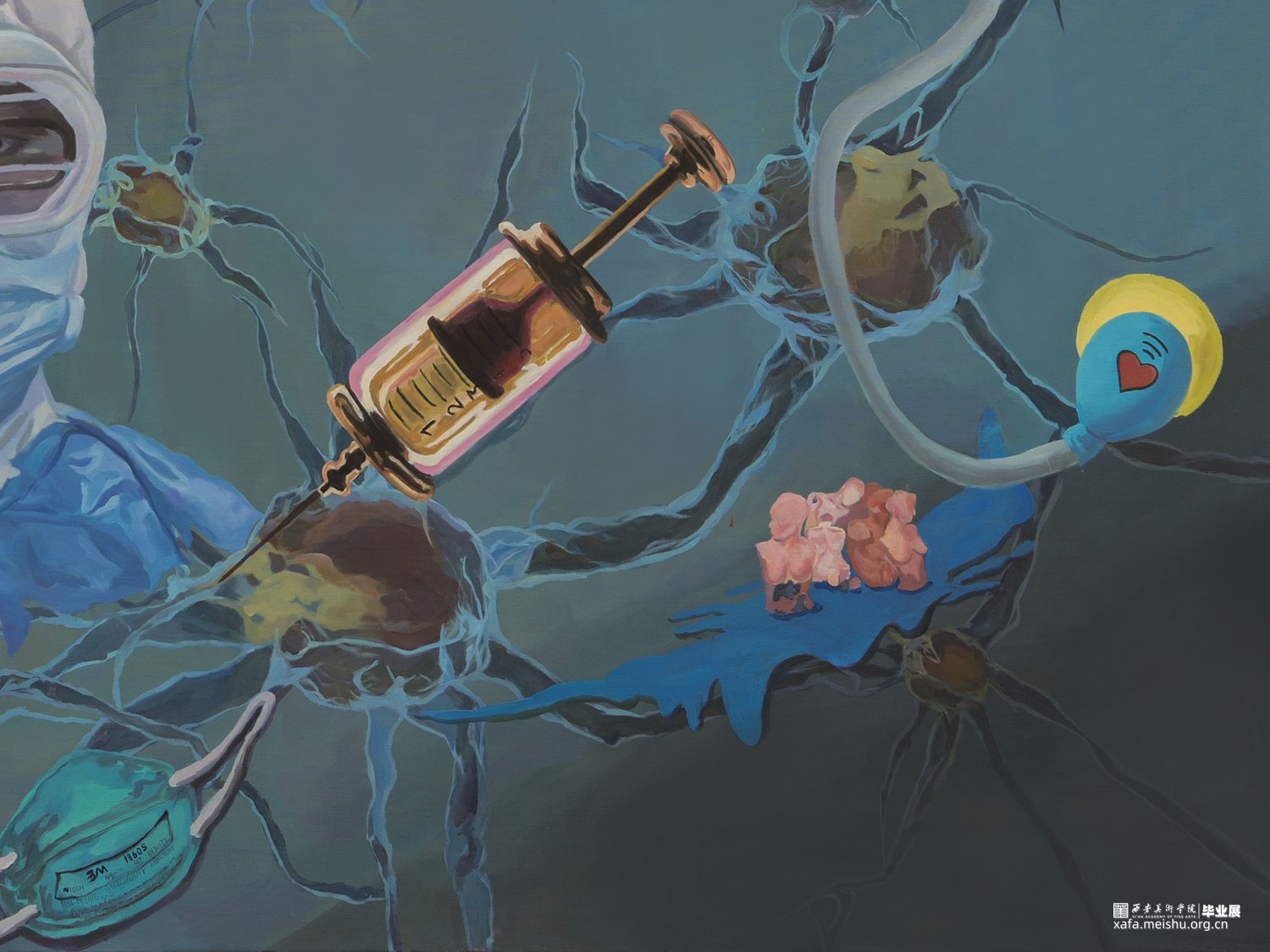 整幅画用蓝色色调的冰冷和素材中跳跃的颜色来产生视觉对比,希望用具有象征意义的物品来表现画面主题,生命与自然的主题契合当下时期的疫情形势。