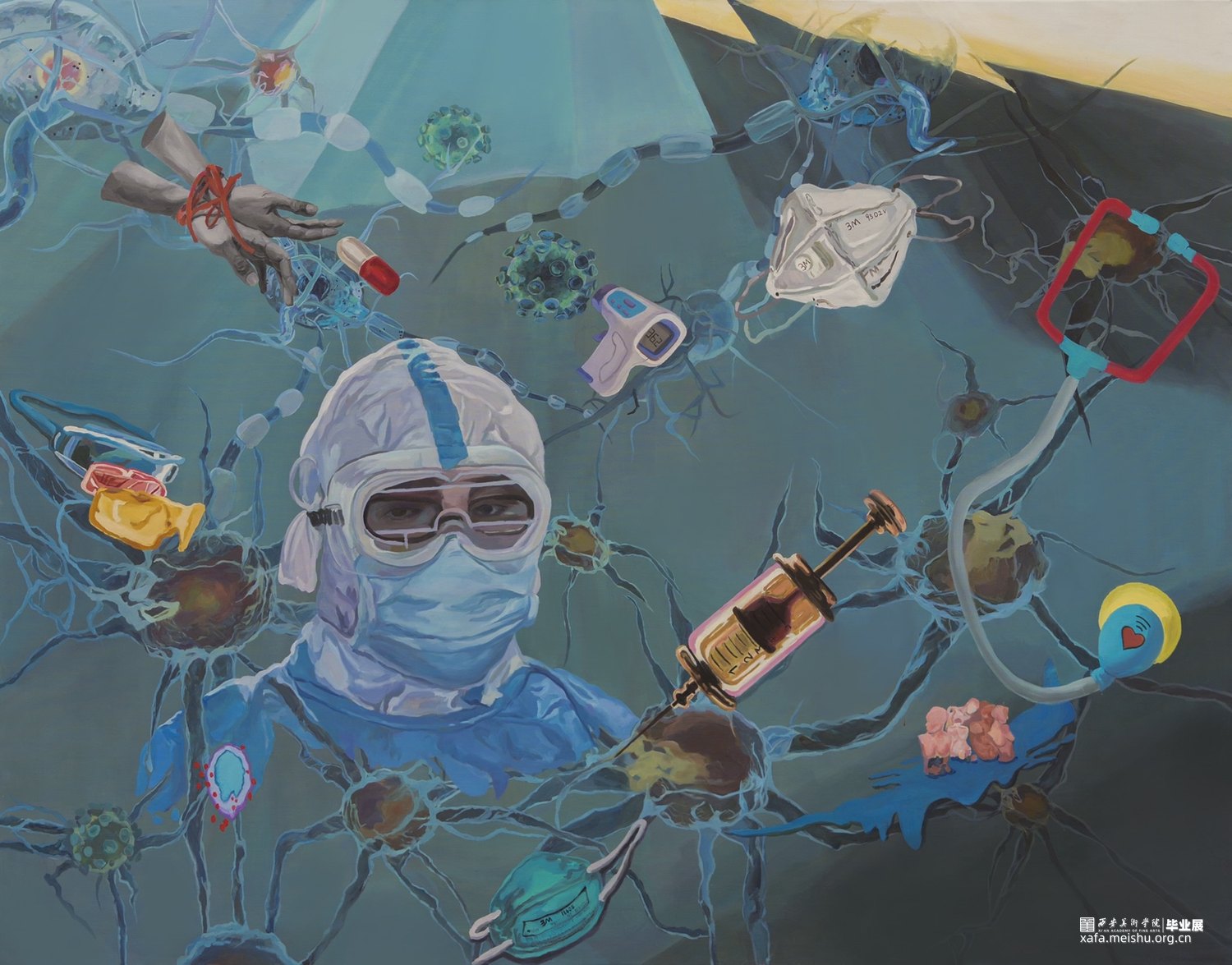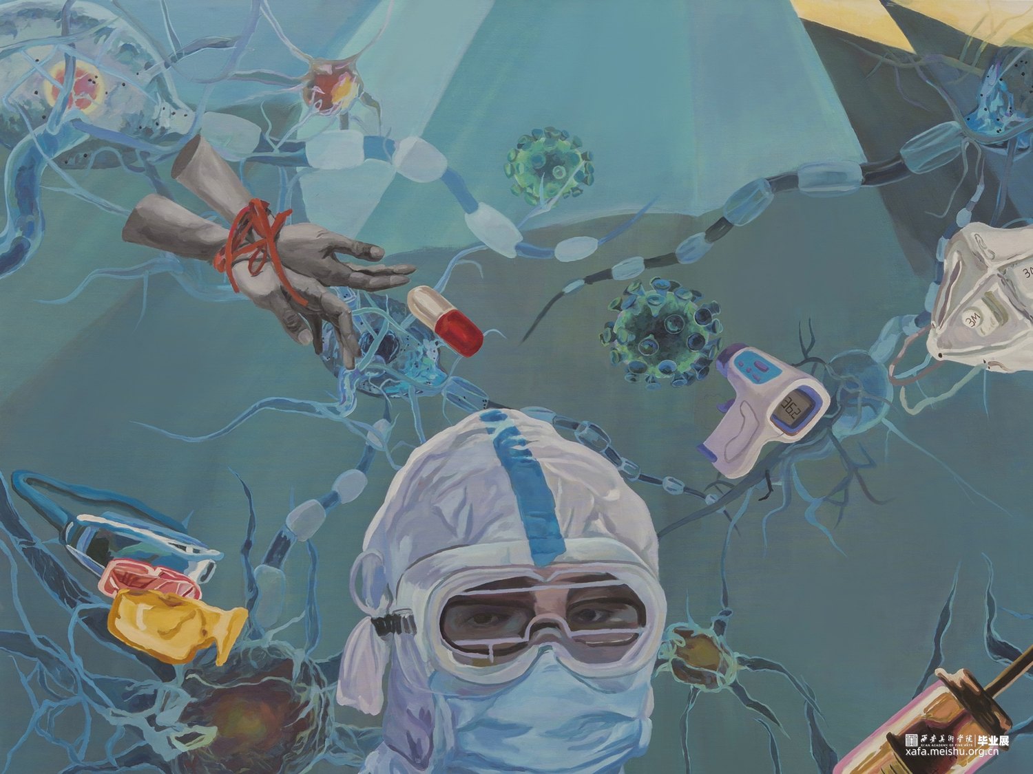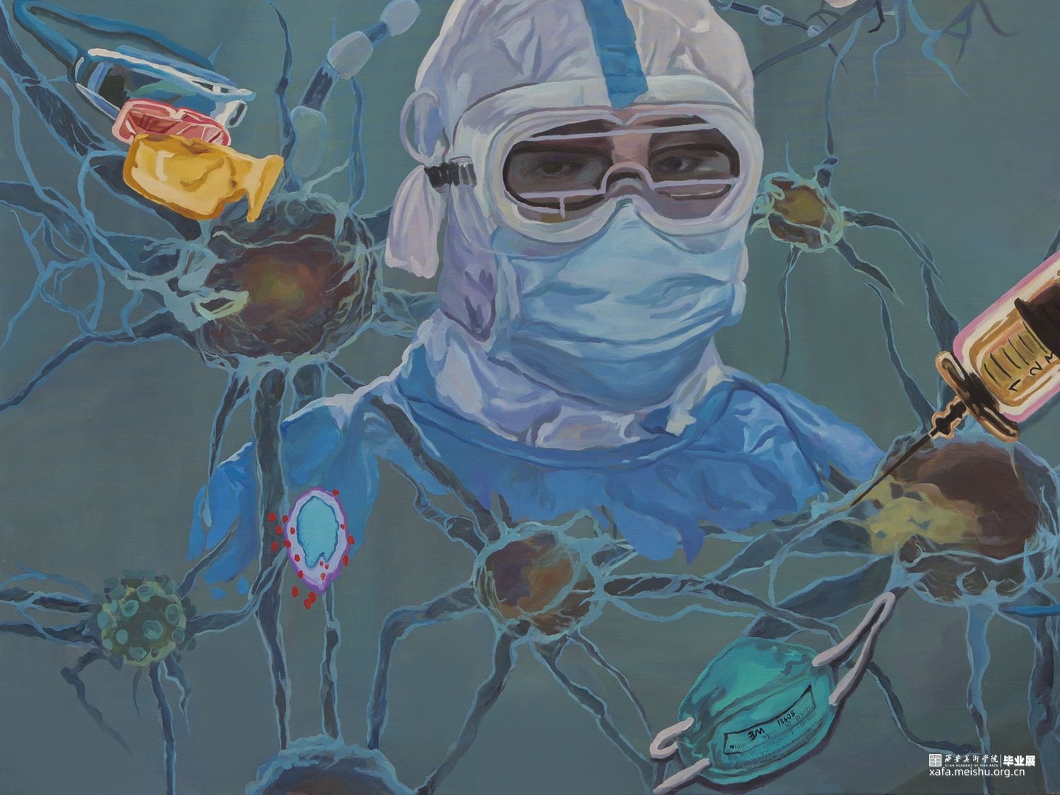 画面底层做的是细胞铺陈的效果,在底层的结构上加入了一些有关生命与自然的素材来丰富画面层次,比如红丝带,口罩,药丸,针管,等。画面中主体是全副武装的医生形象,想给到画面一个视觉中心。