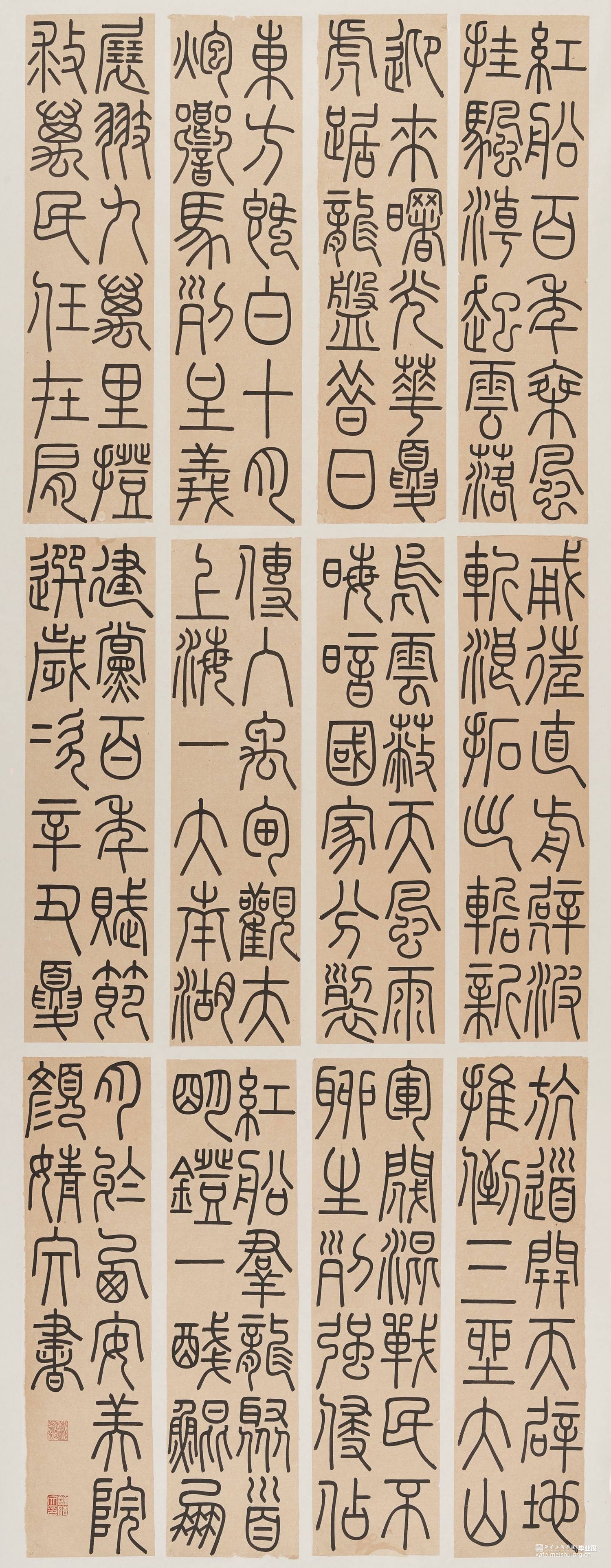 “篆,引书也。”本作品结合唐李阳冰《三坟记》与宋释梦英的《篆书千字文》的玉箸篆而创作,玉箸篆的风格不同于大篆的豪放,也不同于清篆的洒脱,它的严谨空间排布以及章法是统一的,笔笔中锋,结笔处的方圆结合结合恰到好处,篆书风格各有千秋,玉箸篆是其中一种为之温婉的,以及字形也是经过严格推敲的。