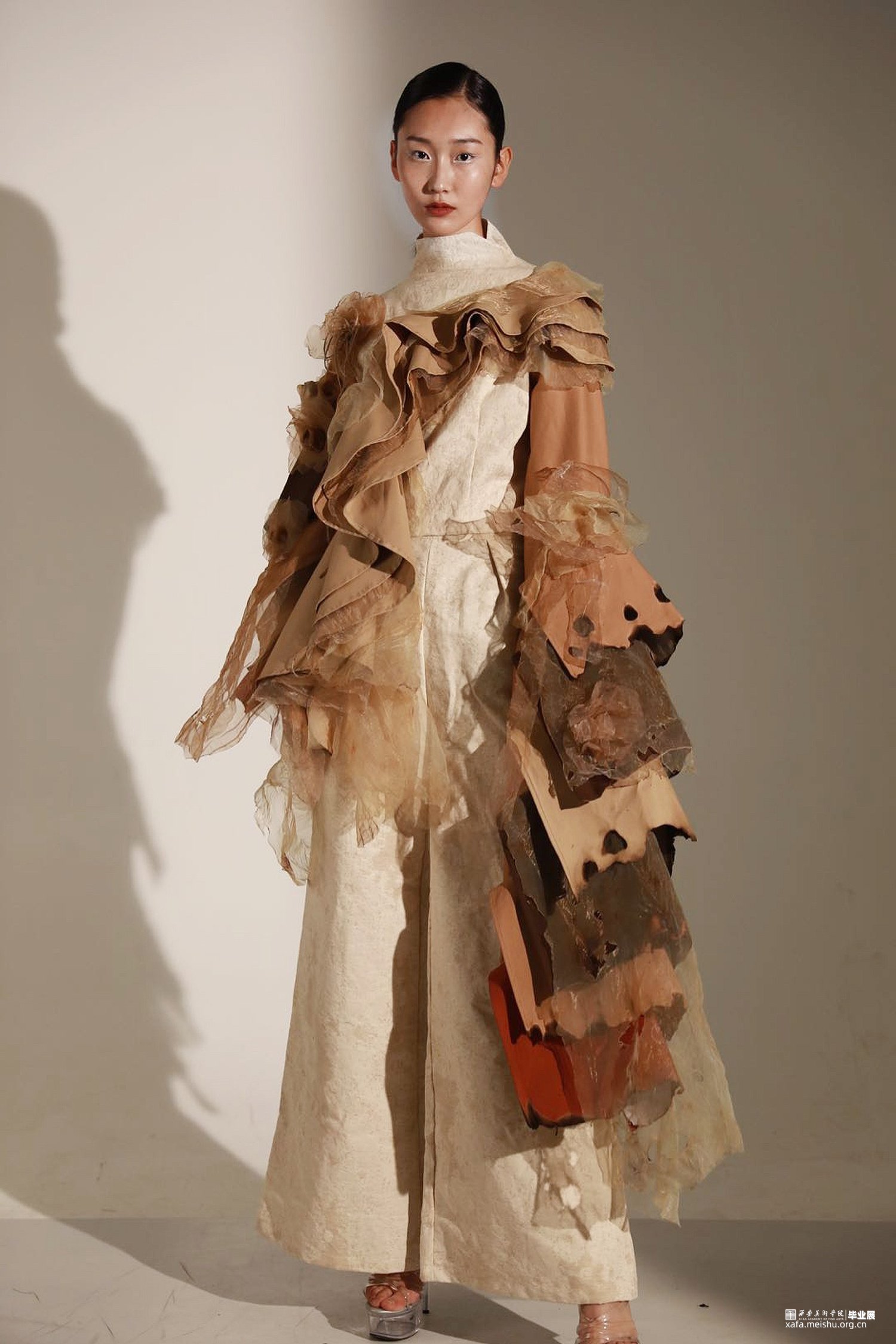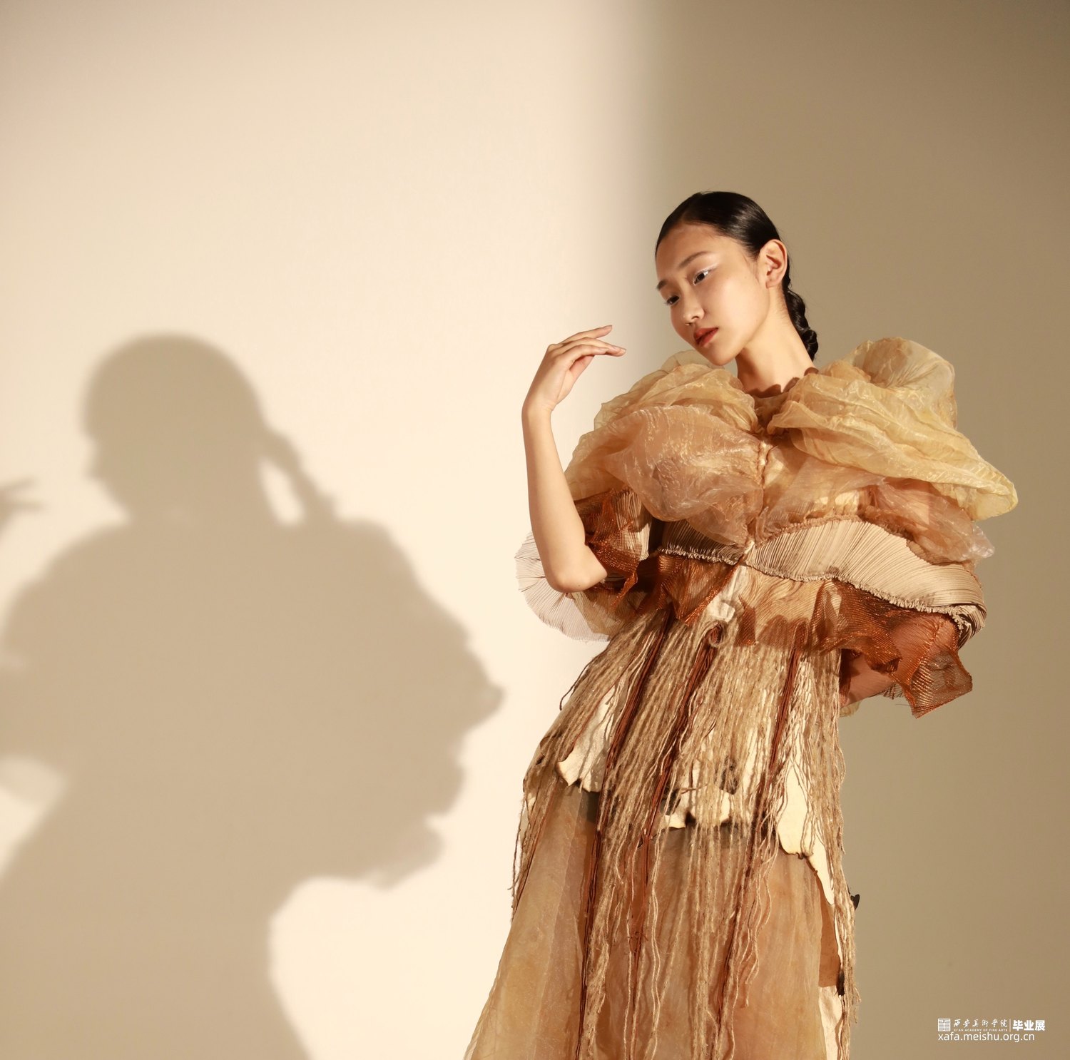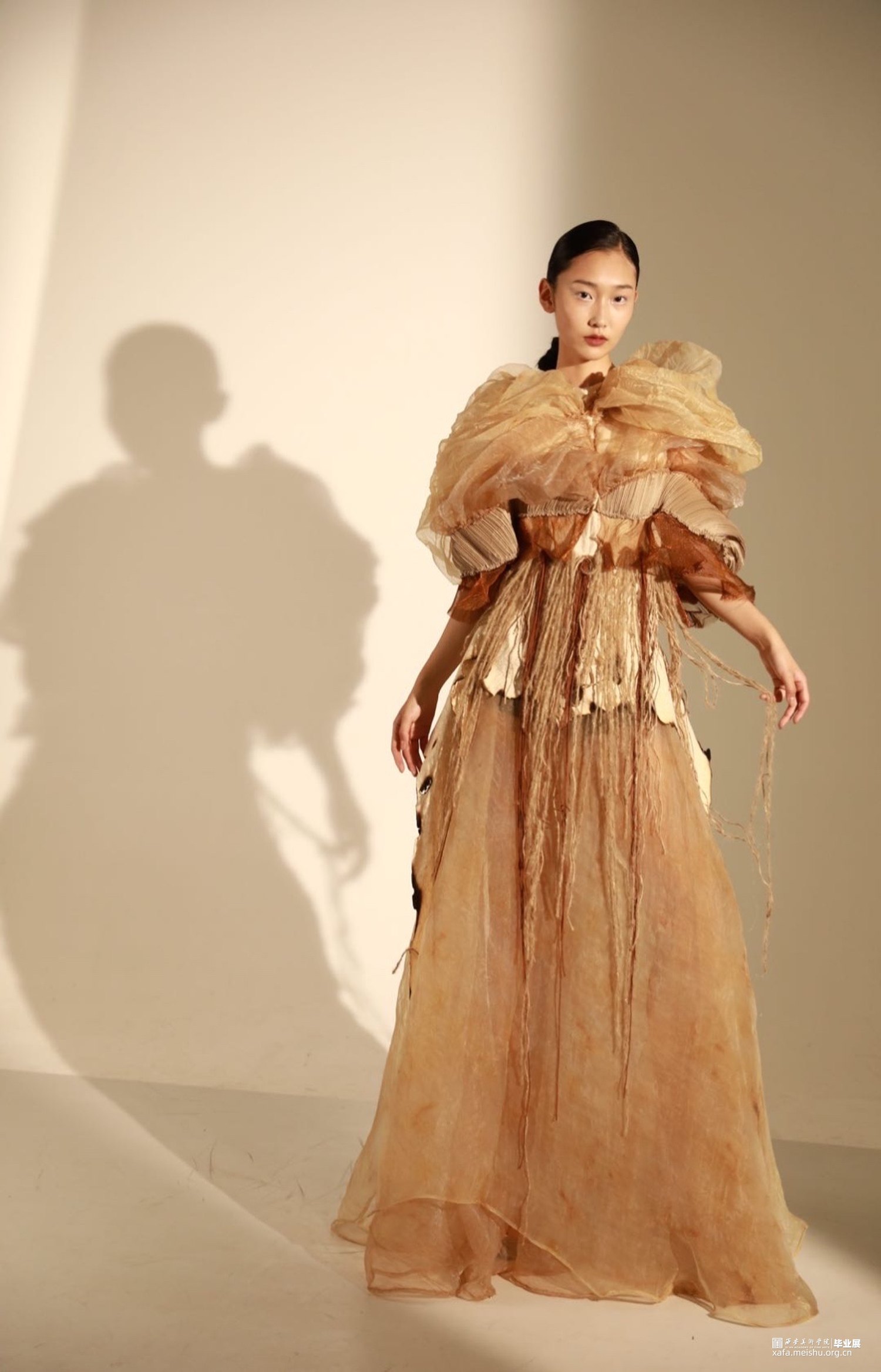 唐三彩是唐朝的代表性艺术之一,其种类丰富多样,釉色五彩斑斓,是中华历史文化长河中的一块瑰宝。本人通过对唐三彩元素的提取、整合与转换,将其运用在服装设计之中,既传承了唐朝文化的艺术审美,丰富了服装的设计语言,同时又发掘了传统文化的创新表达。在传承优秀文化的同时,赋予其新的活力与魅力。本作品主要面料为涤纶面料与网纱面料,通过对唐三彩器型的分析得到现在作品的轮廓型,通过对唐三彩的釉色分析决定作品主色为棕卡色系,面料通过大量烧的方式做出各种新的面料,将新的面料重组,使作品产生丰富的变化。其中包含大量的面料再造,在烧制的过程中,尽量根据不同面料用不同温度,不可以将面料烧得过于变形,要恰到好处。形成肌理的同时又不破坏大的形状,制作大料不同面料的烧制实验。