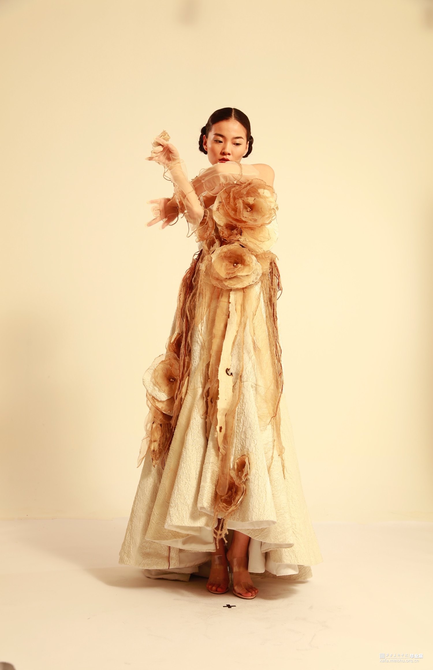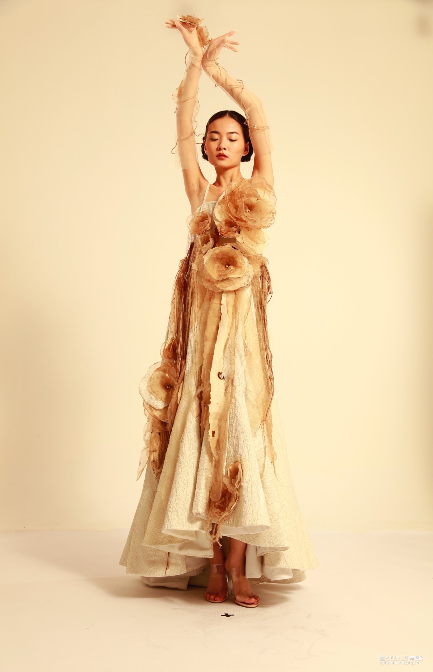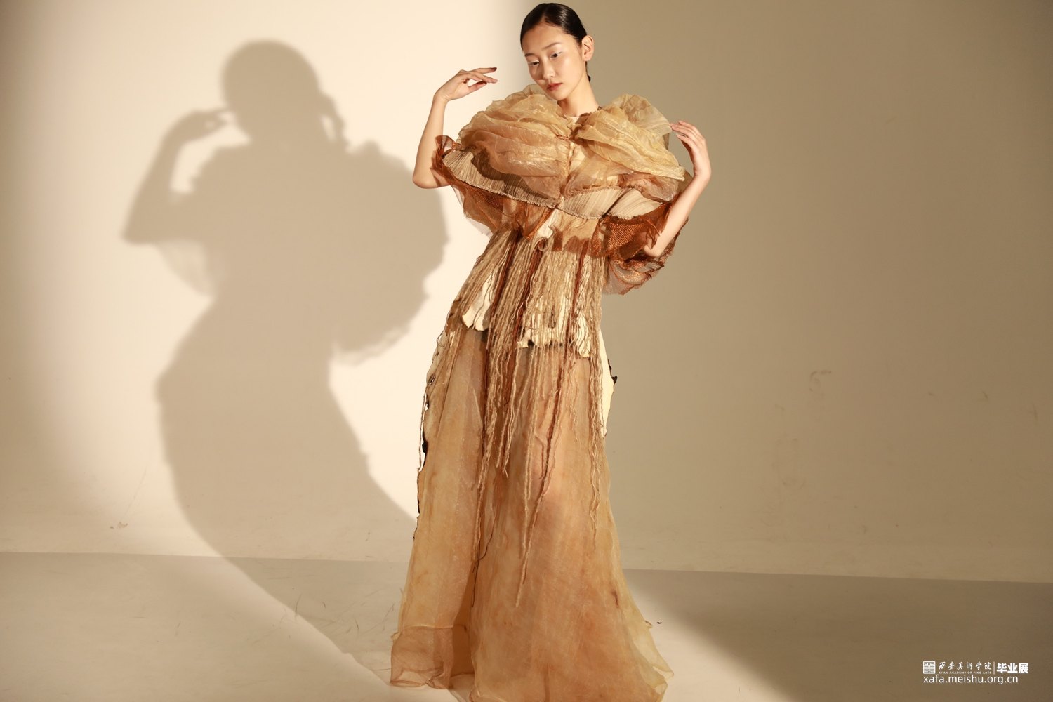 唐三彩是唐朝的代表性艺术之一,其种类丰富多样,釉色五彩斑斓,是中华历史文化长河中的一块瑰宝。本人通过对唐三彩元素的提取、整合与转换,将其运用在服装设计之中,既传承了唐朝文化的艺术审美,丰富了服装的设计语言,同时又发掘了传统文化的创新表达。在传承优秀文化的同时,赋予其新的活力与魅力。本作品主要面料为涤纶面料与网纱面料,通过对唐三彩器型的分析得到现在作品的轮廓型,通过对唐三彩的釉色分析决定作品主色为棕卡色系,面料通过大量烧的方式做出各种新的面料,将新的面料重组,使作品产生丰富的变化。其中包含大量的面料再造,在烧制的过程中,尽量根据不同面料用不同温度,不可以将面料烧得过于变形,要恰到好处。形成肌理的同时又不破坏大的形状,制作大料不同面料的烧制实验。