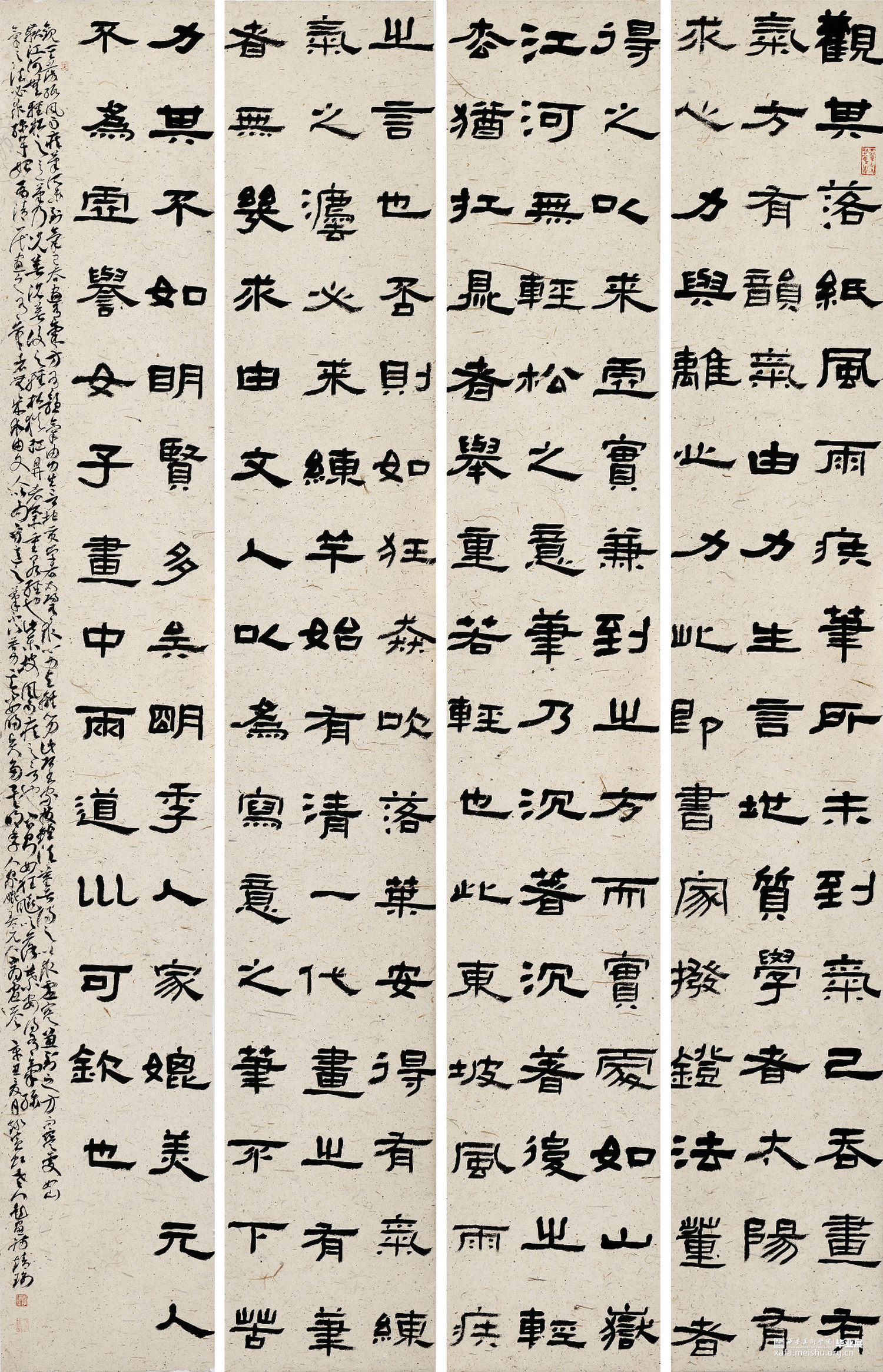 用隶书创作黄宾虹的一篇书画题跋,全文174字。落款小草释全文。
