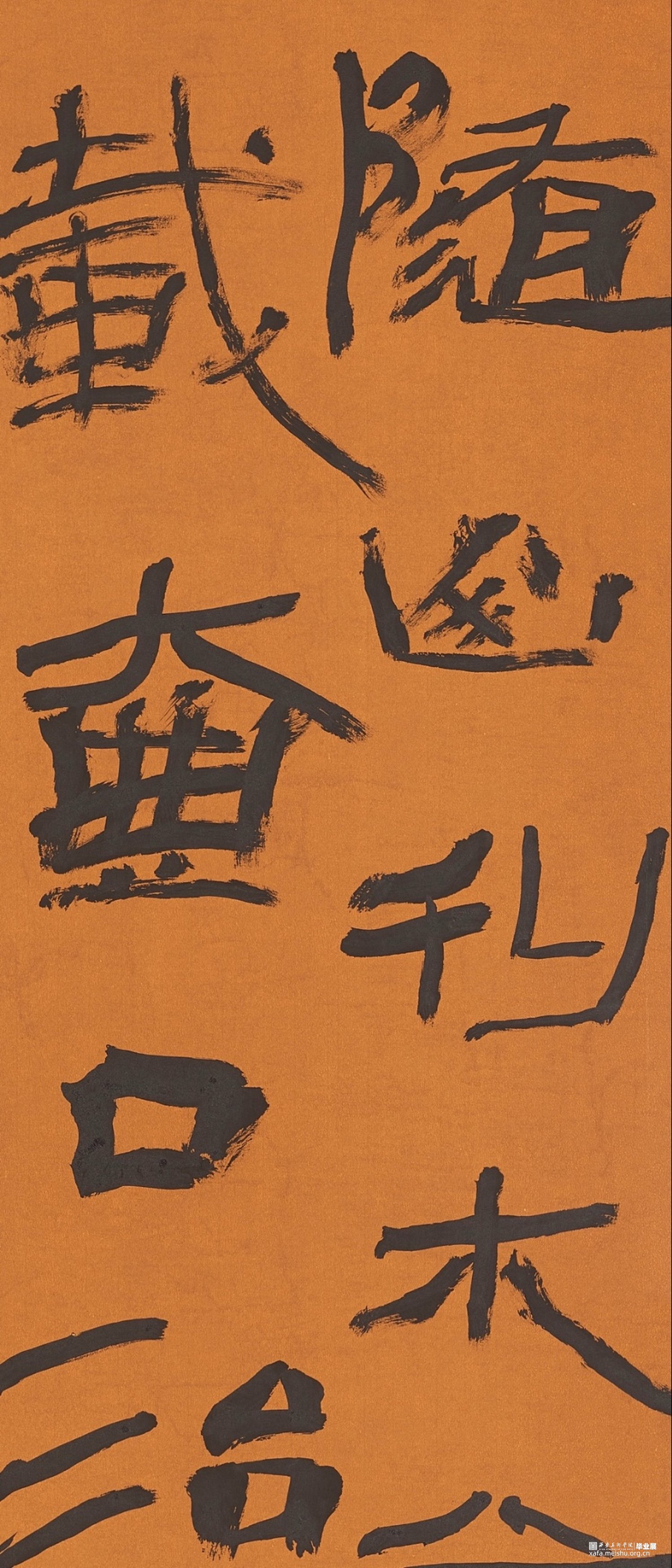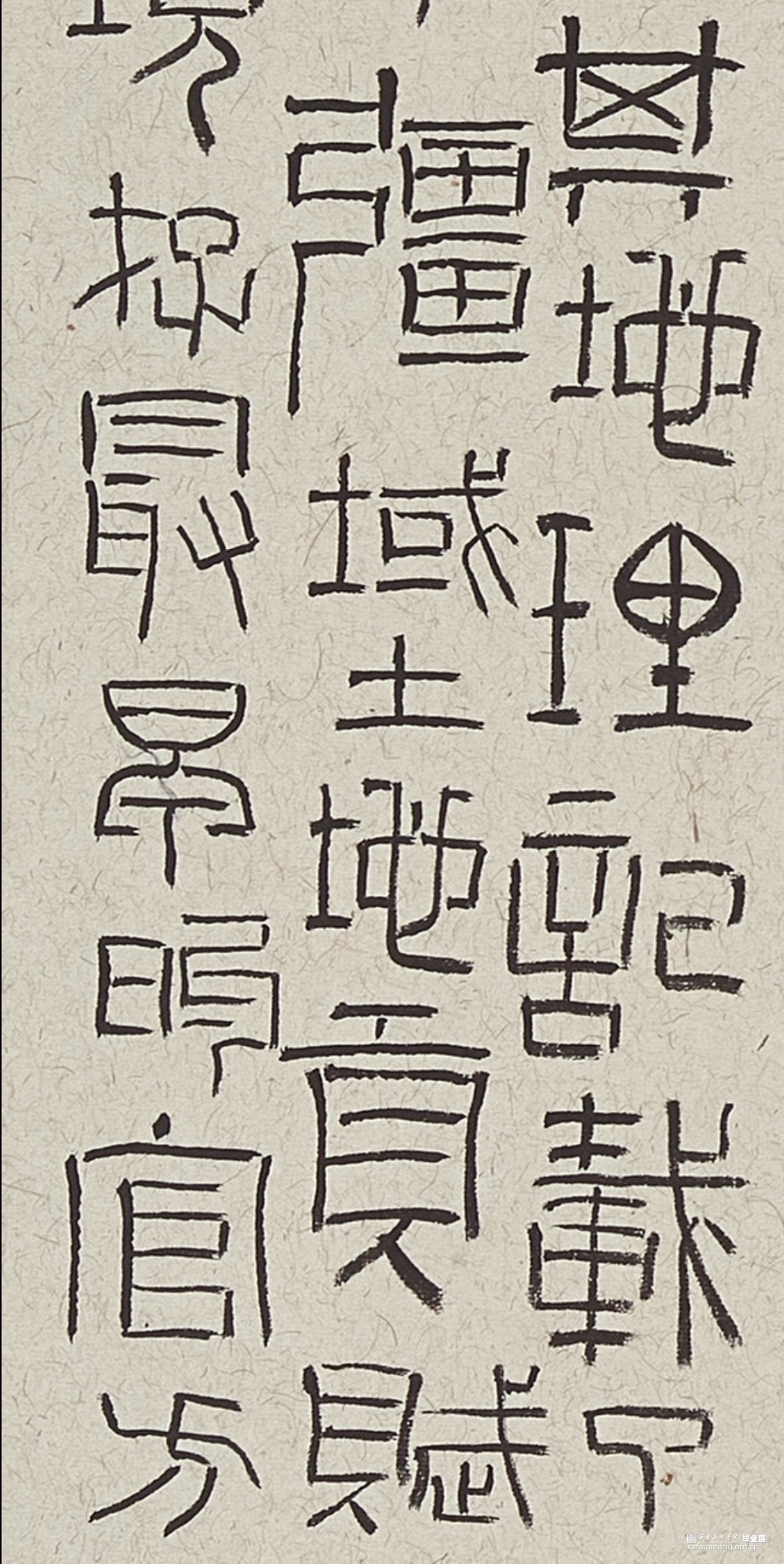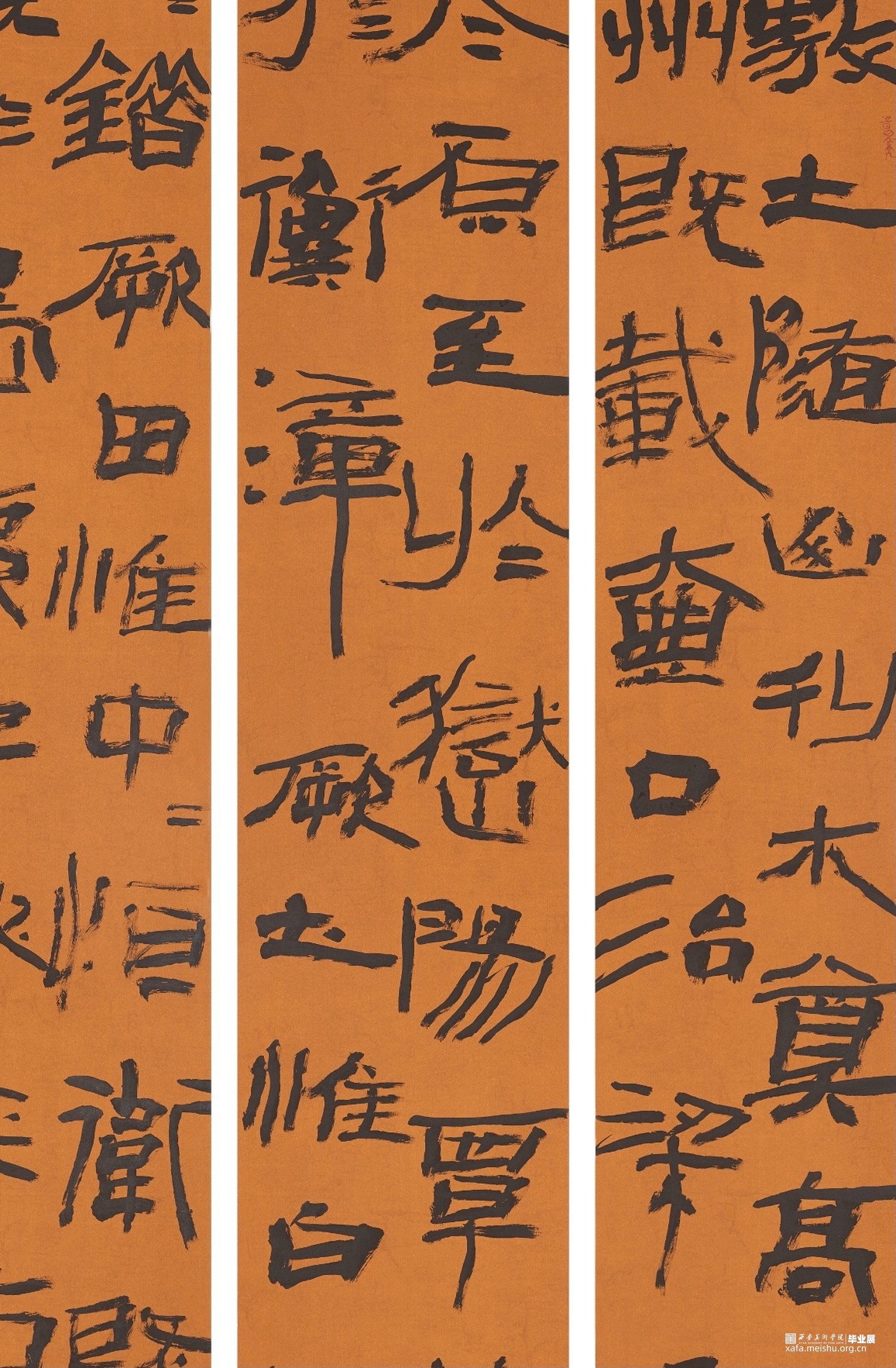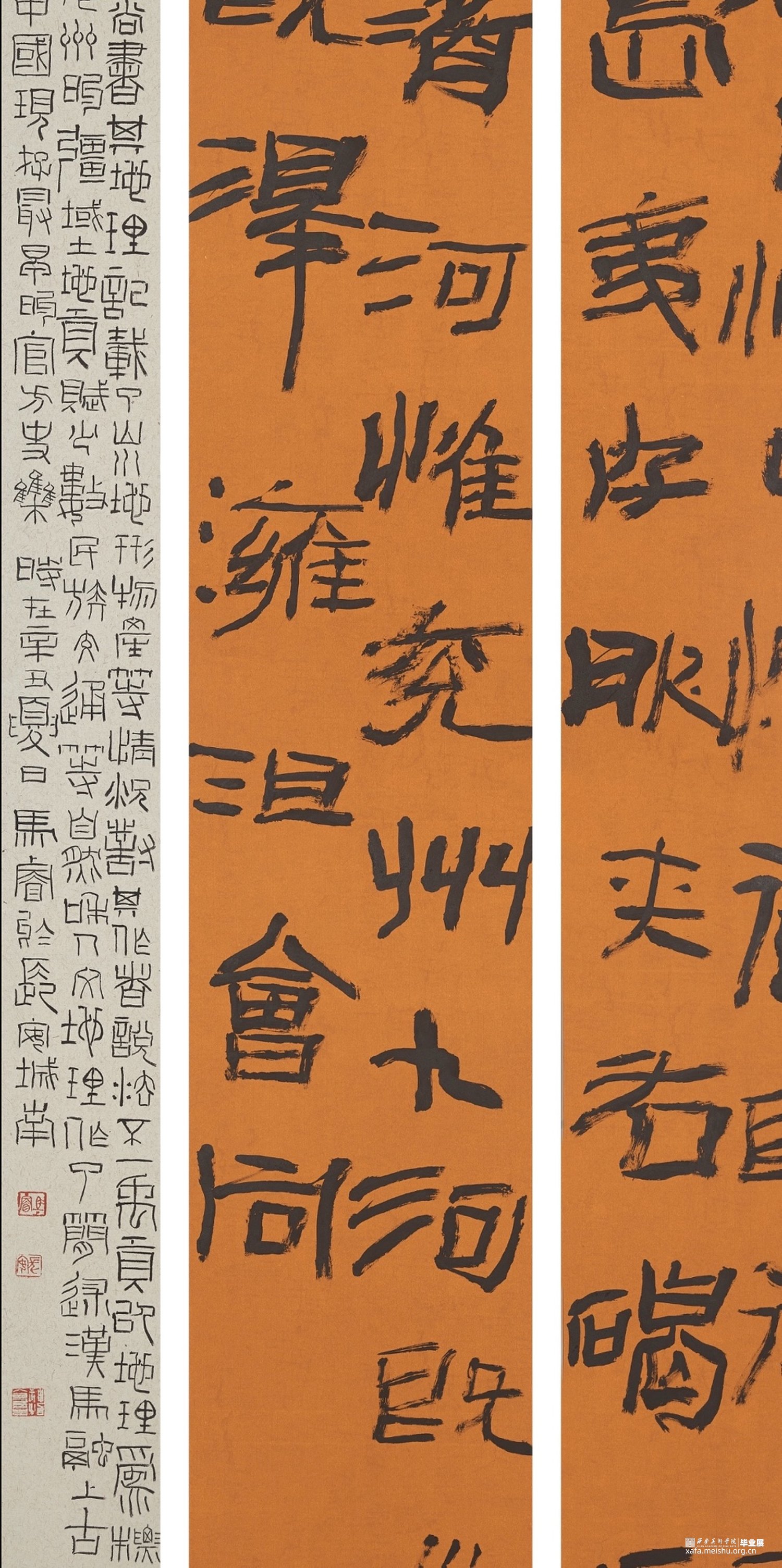 此幅作品内容为《尚书》,简称为《书》,我节录了《书》的《禹贡》,《禹贡》以山河为界将中国分为九州。我选择用隶书去表达,并求其疏野之气,心之所向,所谓自由。力求能以书写状态的纵逸去表达此作的气象。