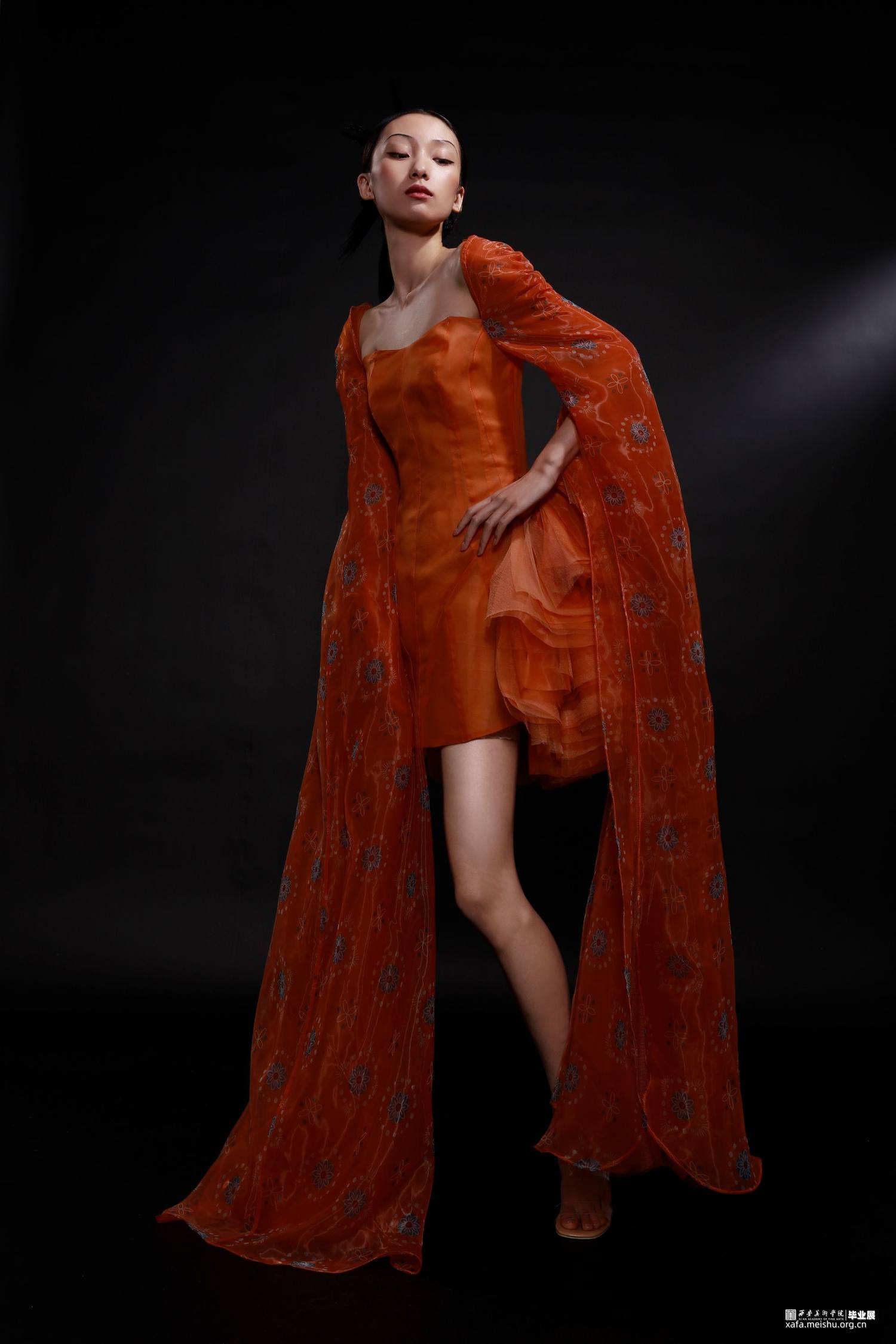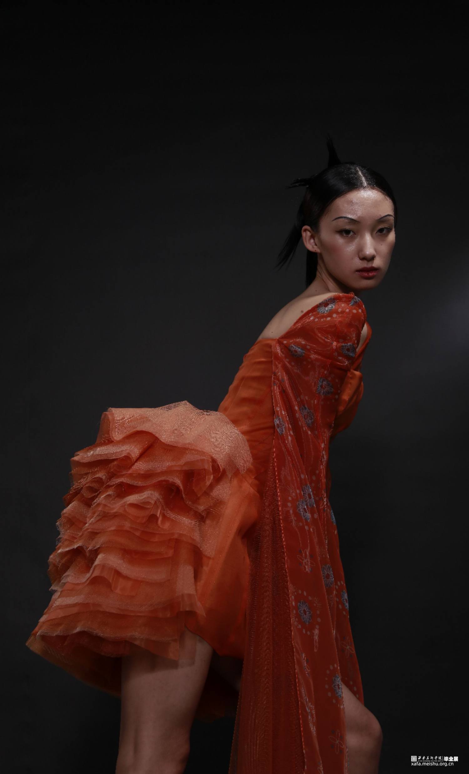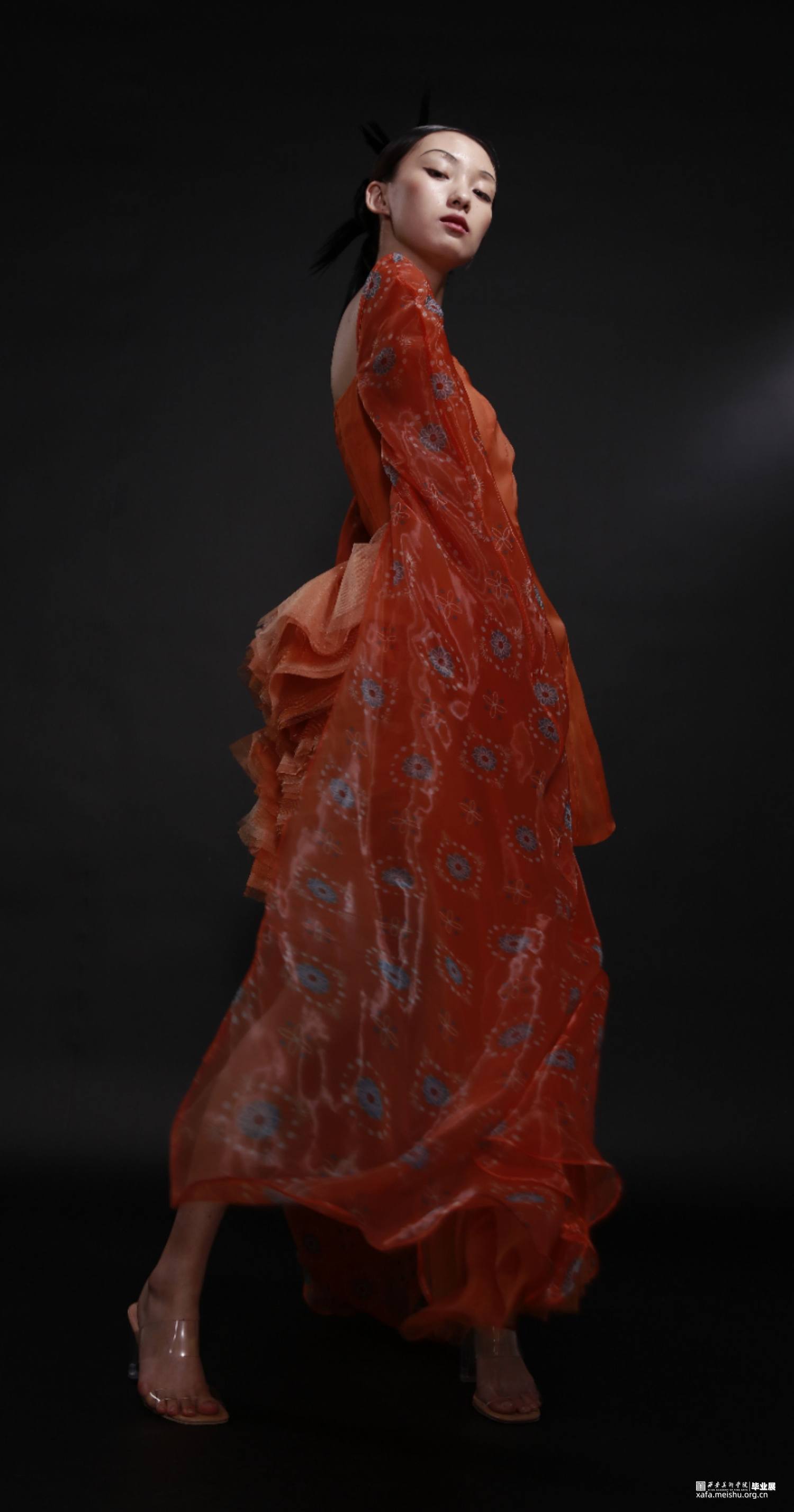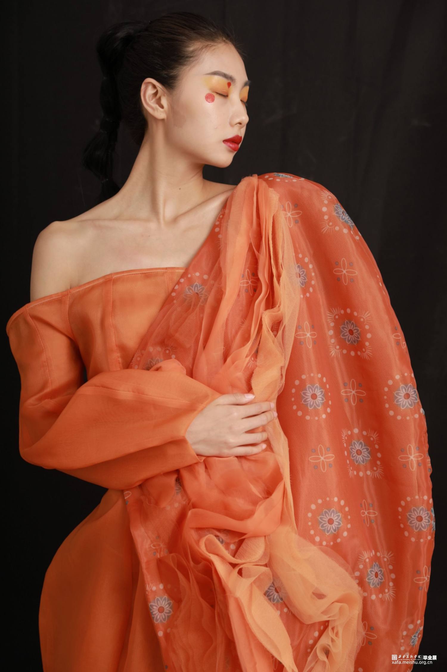 本次毕业作品的灵感来源于唐墓壁画中唐代女子的装束款式和唐代联珠纹,壁画中的所展现的唐代女子着装与审美,清晰地感受到唐代女子的韵味,和唐代服饰的绚丽多彩,艳丽华美,更让人从中感受到了唐代的繁荣昌盛。而联珠纹构架平衡和谐,成双结对,极具几何形式美感,将其应用在我的服装设计中,重组结构,配合复原橘的色彩,展现大唐气象。