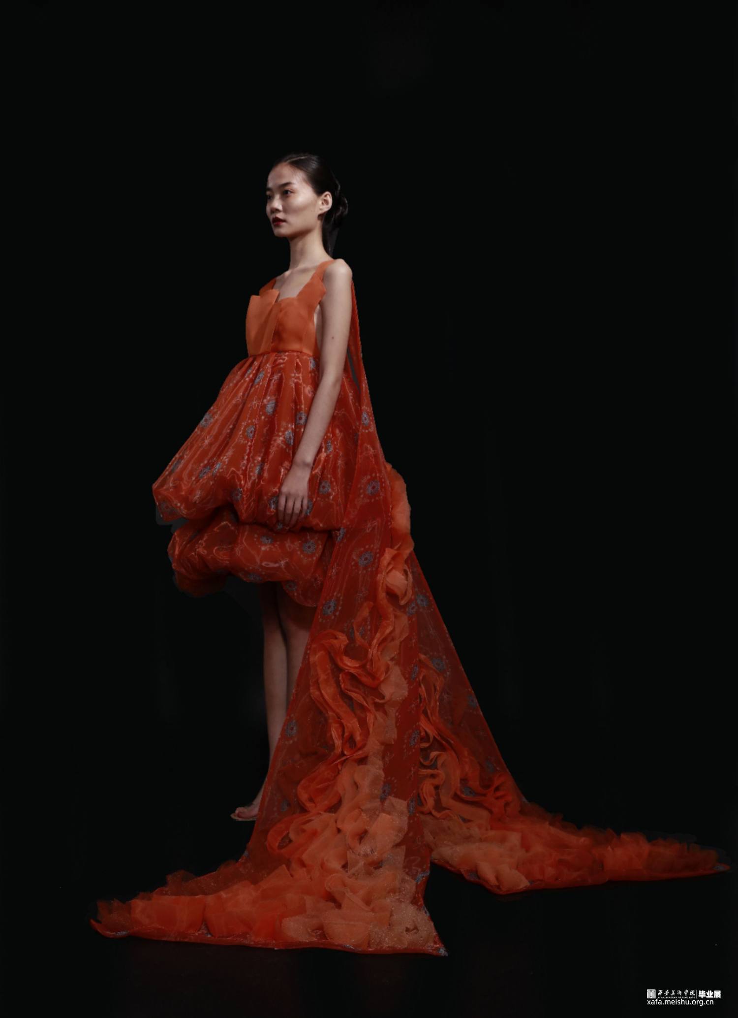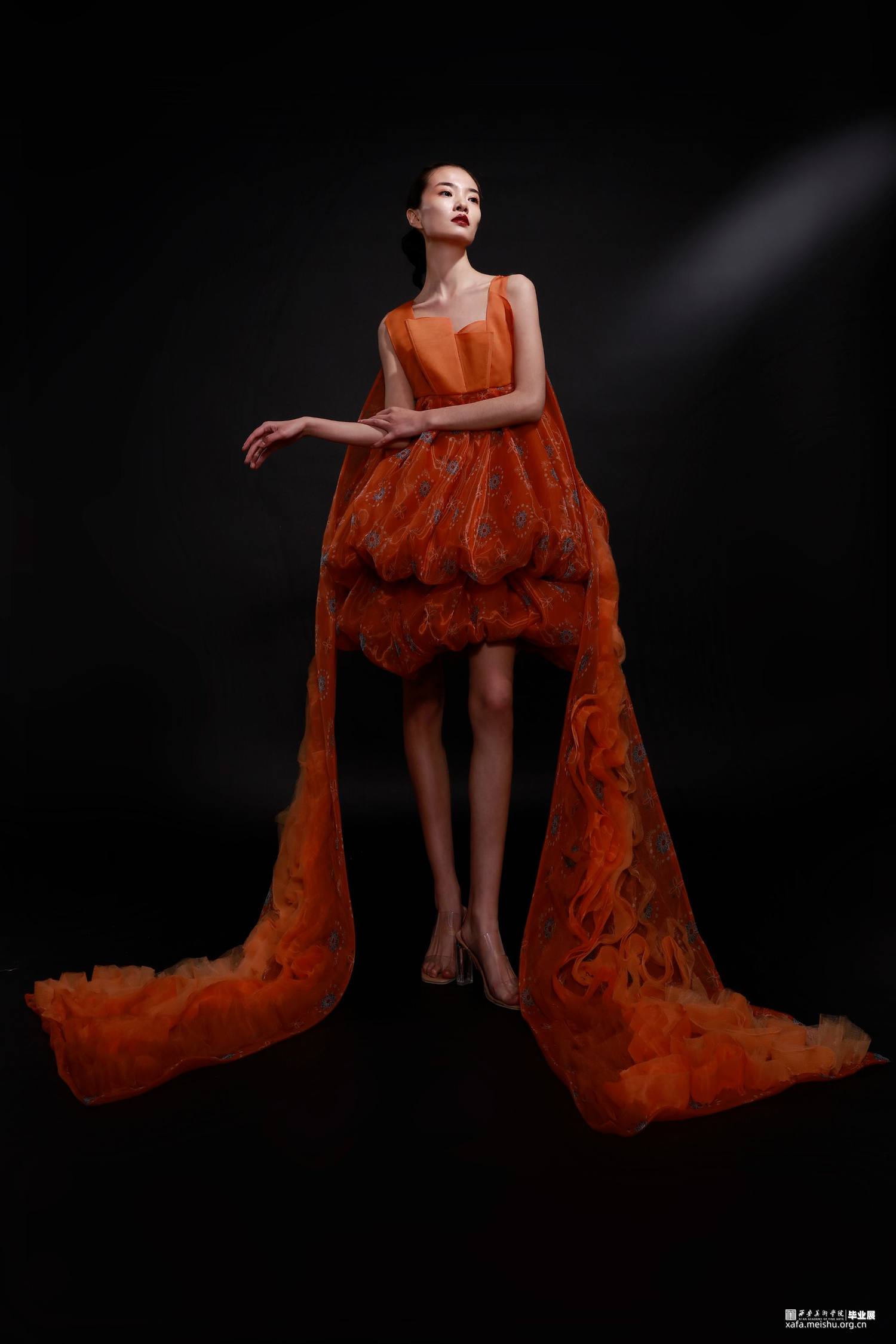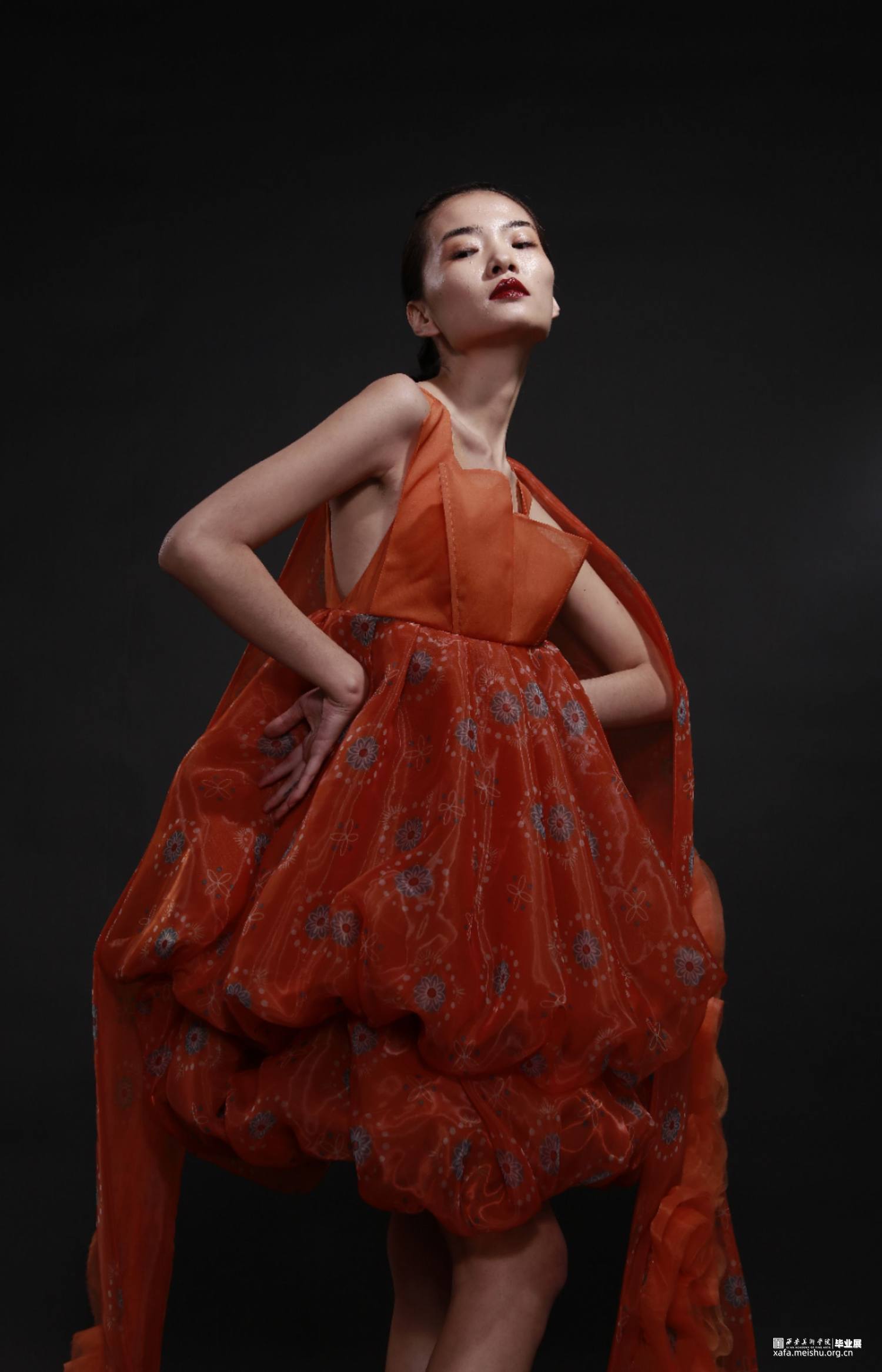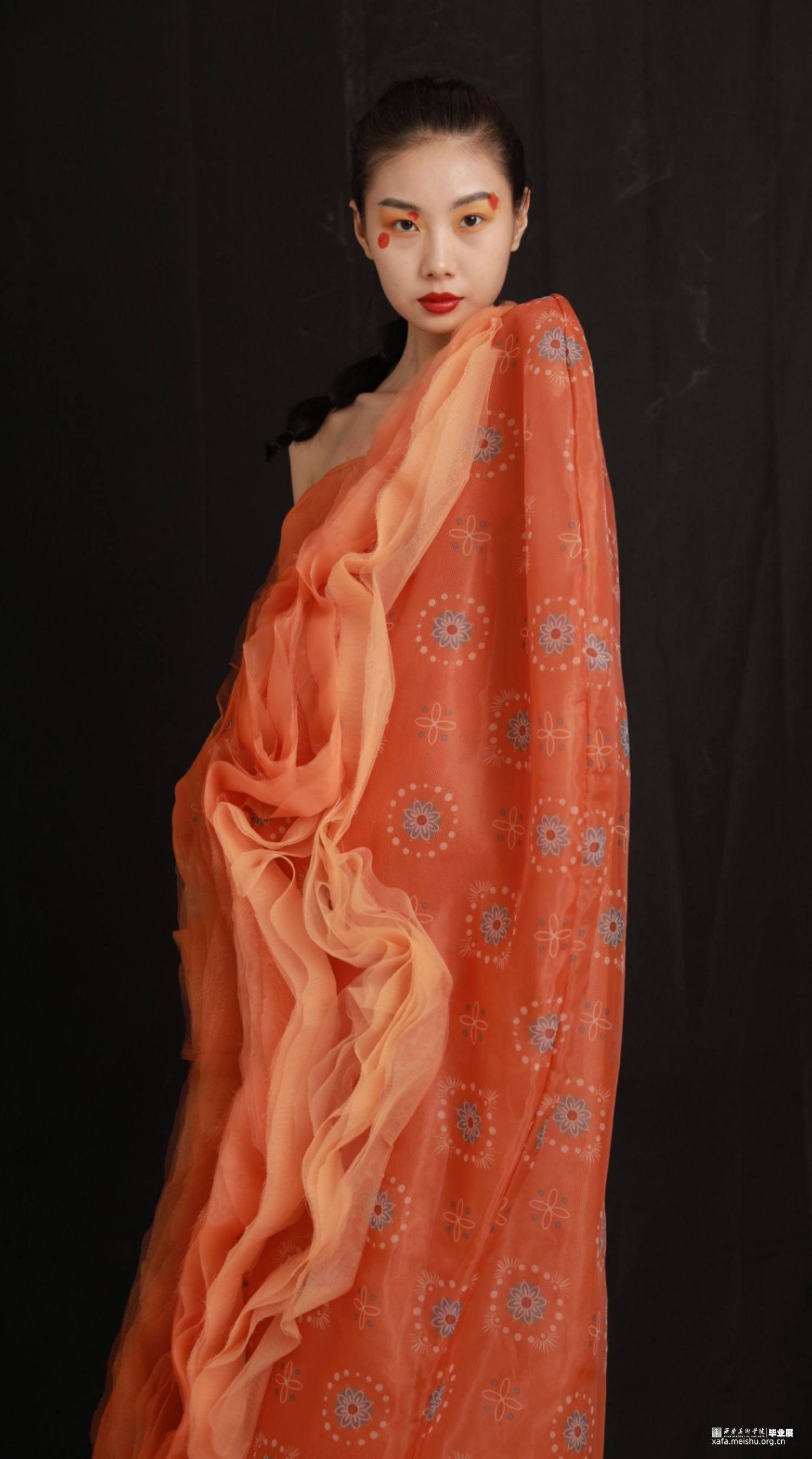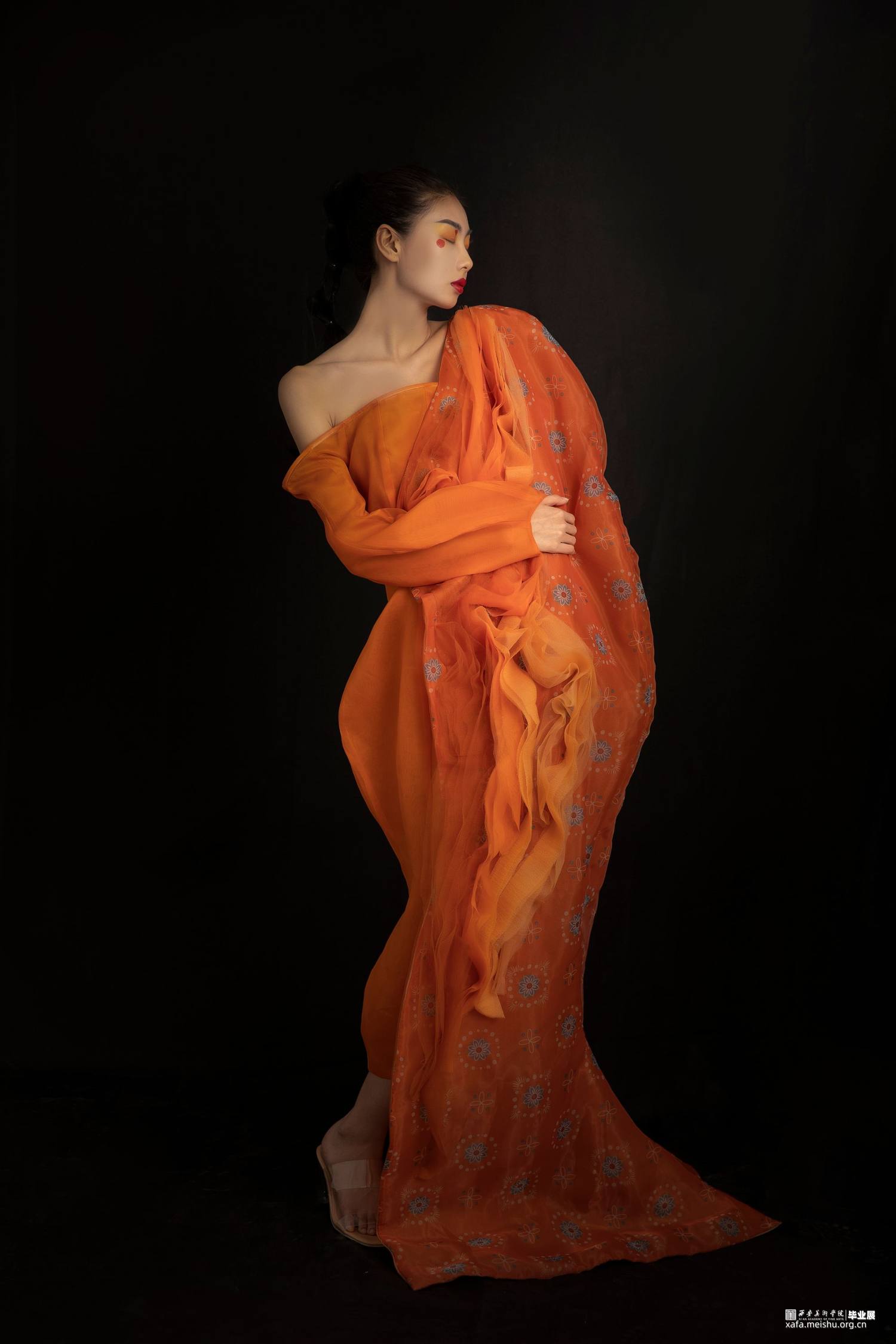 本次毕业作品的灵感来源于唐墓壁画中唐代女子的装束款式和唐代联珠纹,壁画中的所展现的唐代女子着装与审美,清晰地感受到唐代女子的韵味,和唐代服饰的绚丽多彩,艳丽华美,更让人从中感受到了唐代的繁荣昌盛。而联珠纹构架平衡和谐,成双结对,极具几何形式美感,将其应用在我的服装设计中,重组结构,配合复原橘的色彩,展现大唐气象。