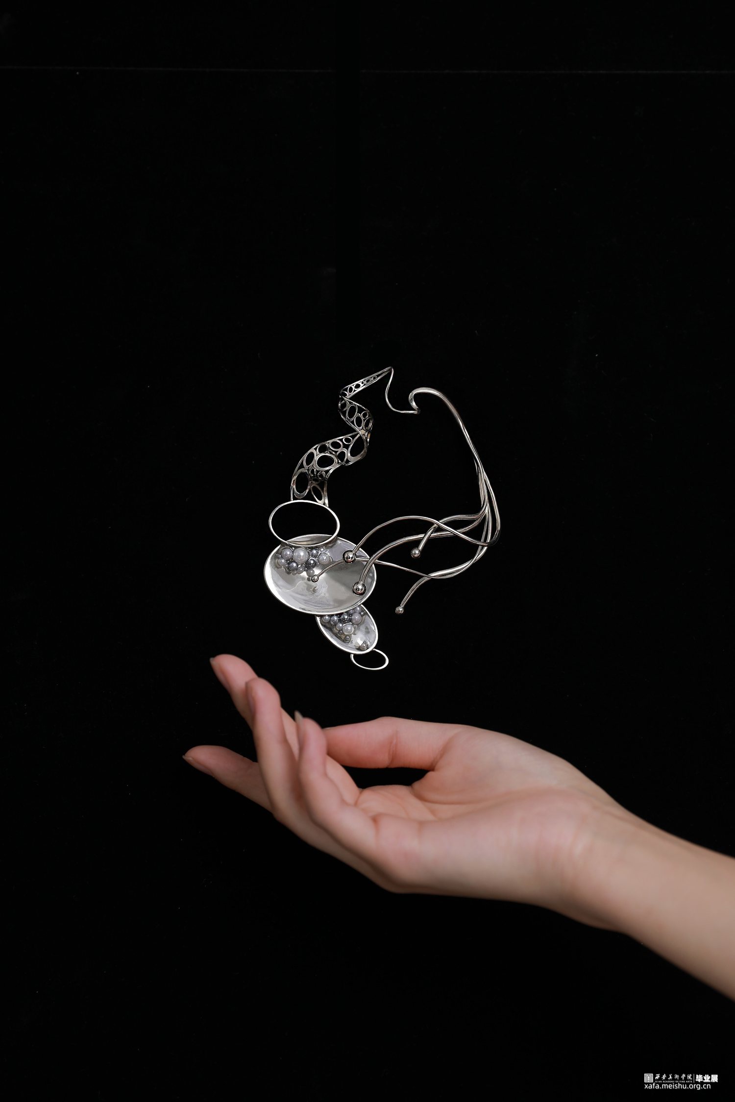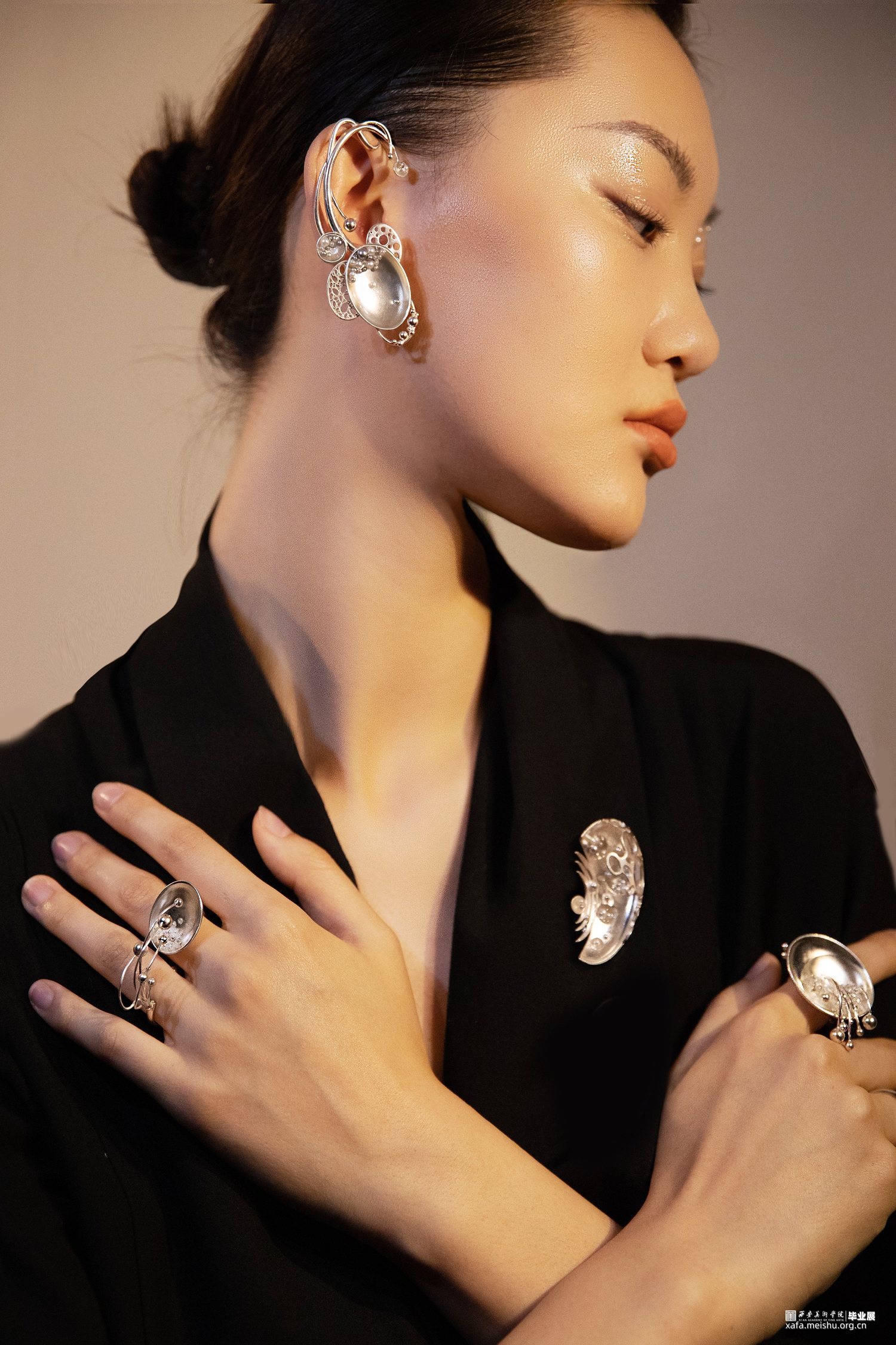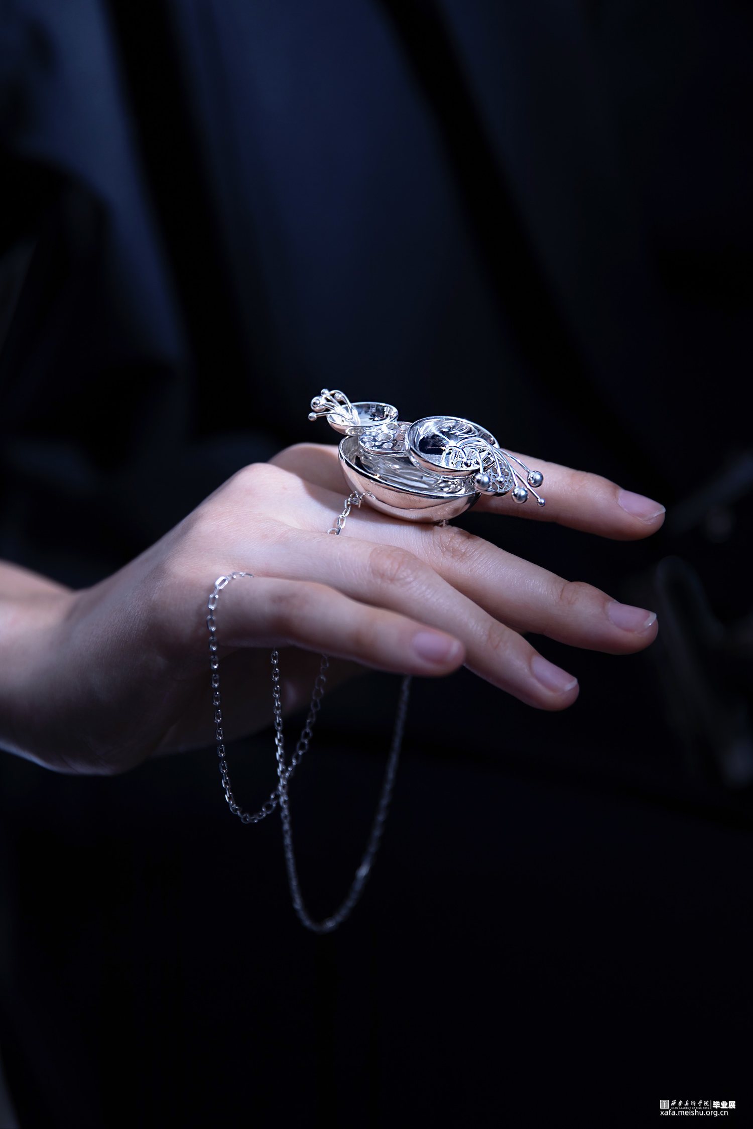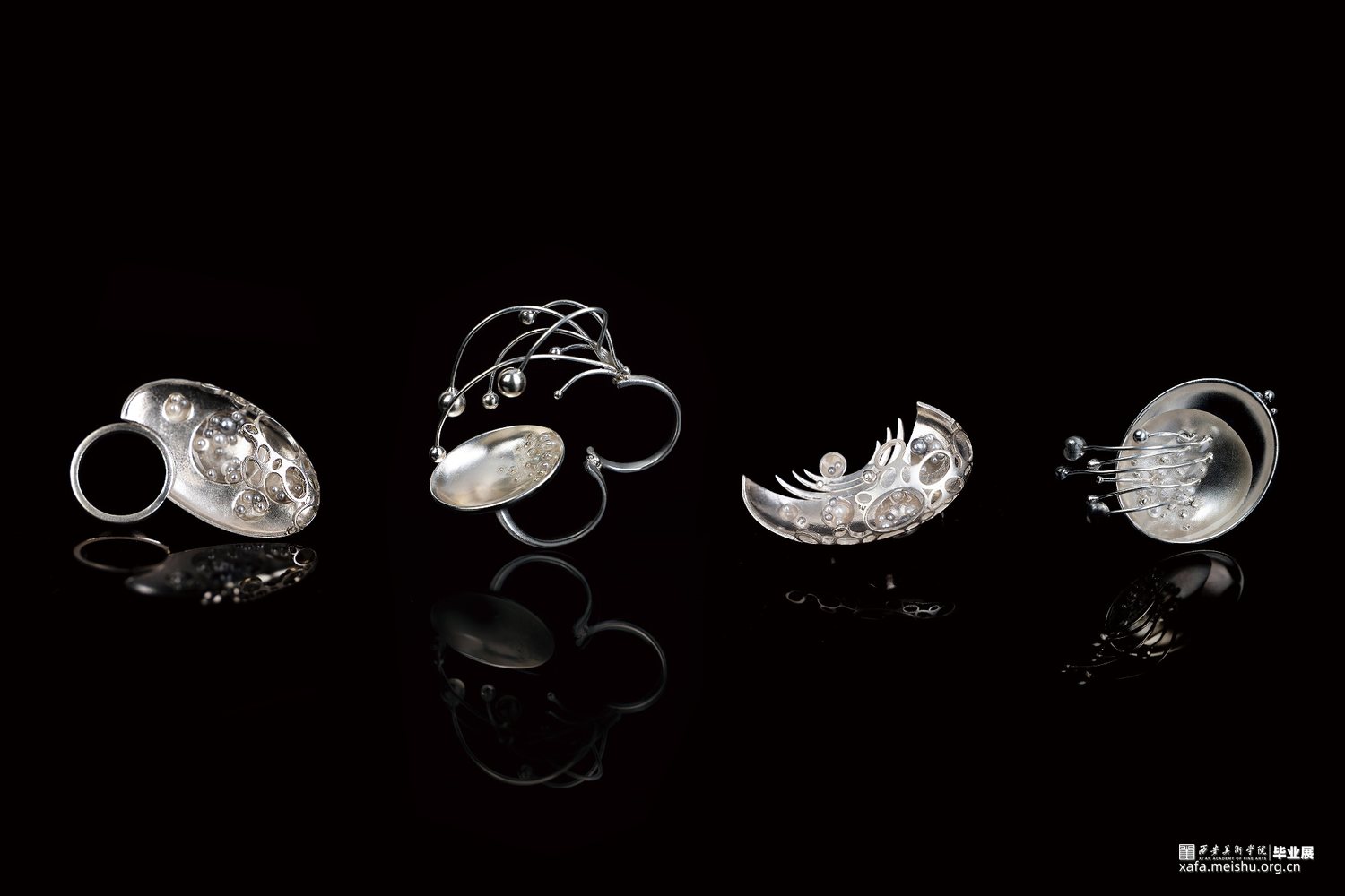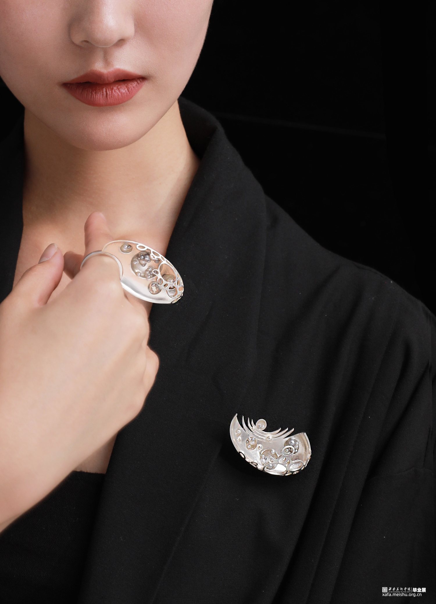 “一切世界,始终生灭,前后有无,聚散起止,念念相续,循环往复,种种取舍,皆是轮回,未出轮回,而辩圆觉,彼圆觉性即同流转。”此次毕业作品立足于唐文化,通过剖析何家村窑藏出土金银器的纹样和制作工艺,归纳点元素的类型、装饰特征与形式语言,分析其传递出的唐代审美取向和文化内涵,跳脱单一固定的思维模式,将传统与当代、工艺与艺术自然而然的融合到一起,传统贵金属材料银与“反传统”的综合材料、传统工艺与传统纹样“形”的结合,传递一种传统文化特有的美感,意在体现唐代美学的同时与当代首饰趋势相结合,呈现点元素在当代首饰上的张力与美感。点线纵横交织,繁而不乱,由重复、聚散、肌理等构成元素呈现不同的艺术效果,布局中的聚散关系使整体展现出一种动中有静、统一中有变化的韵律美感,形成有节奏感、韵律感的形式意味,以聚散有度的构成营造引人遐想的意境。