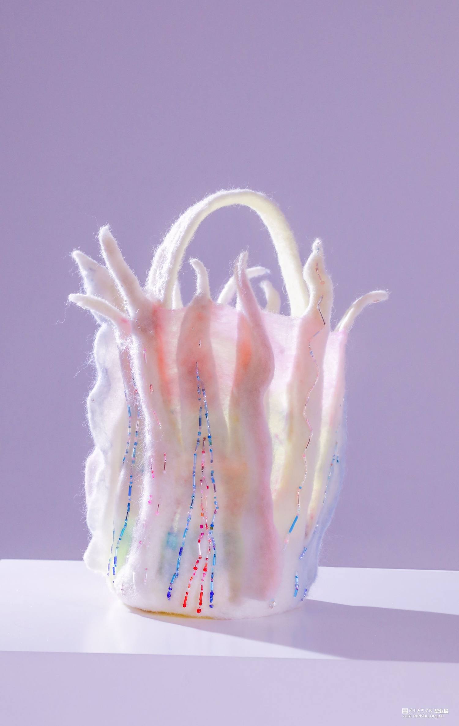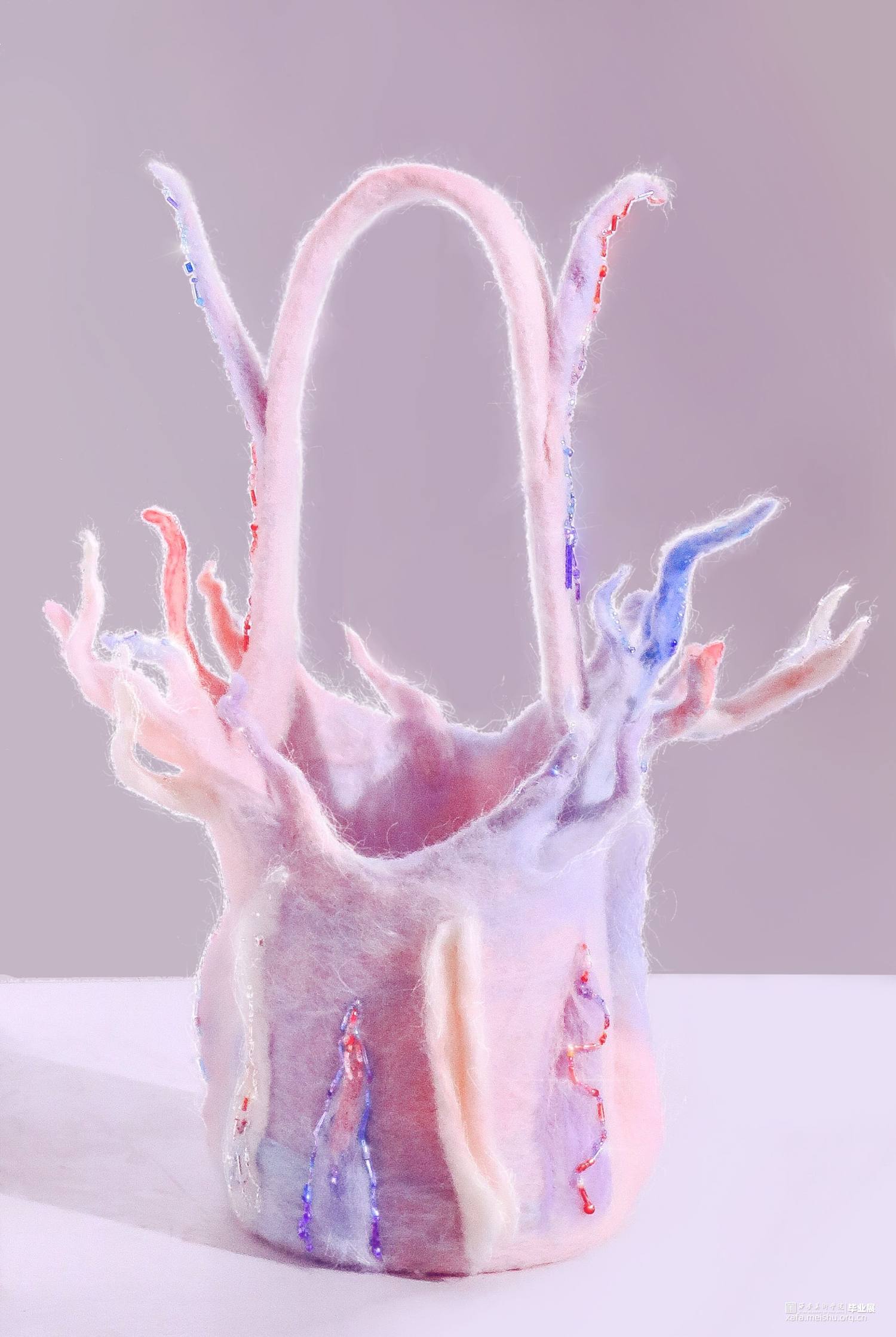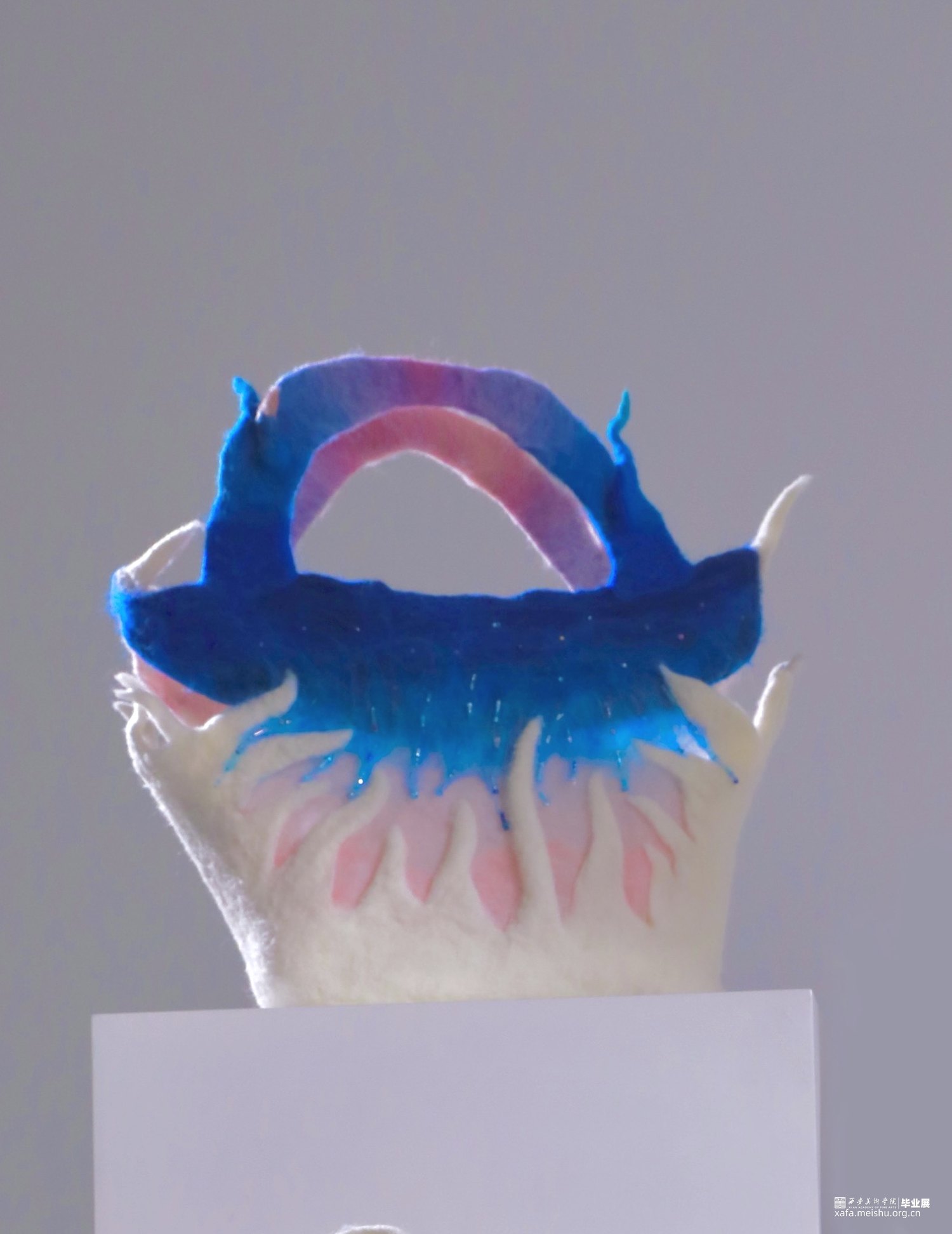 以唐代镇墓兽为灵感的对中国古代幻想艺术与现代服饰设计结合的一次尝试,创造出具有现代女性化特征的羊毛毡箱包作品。