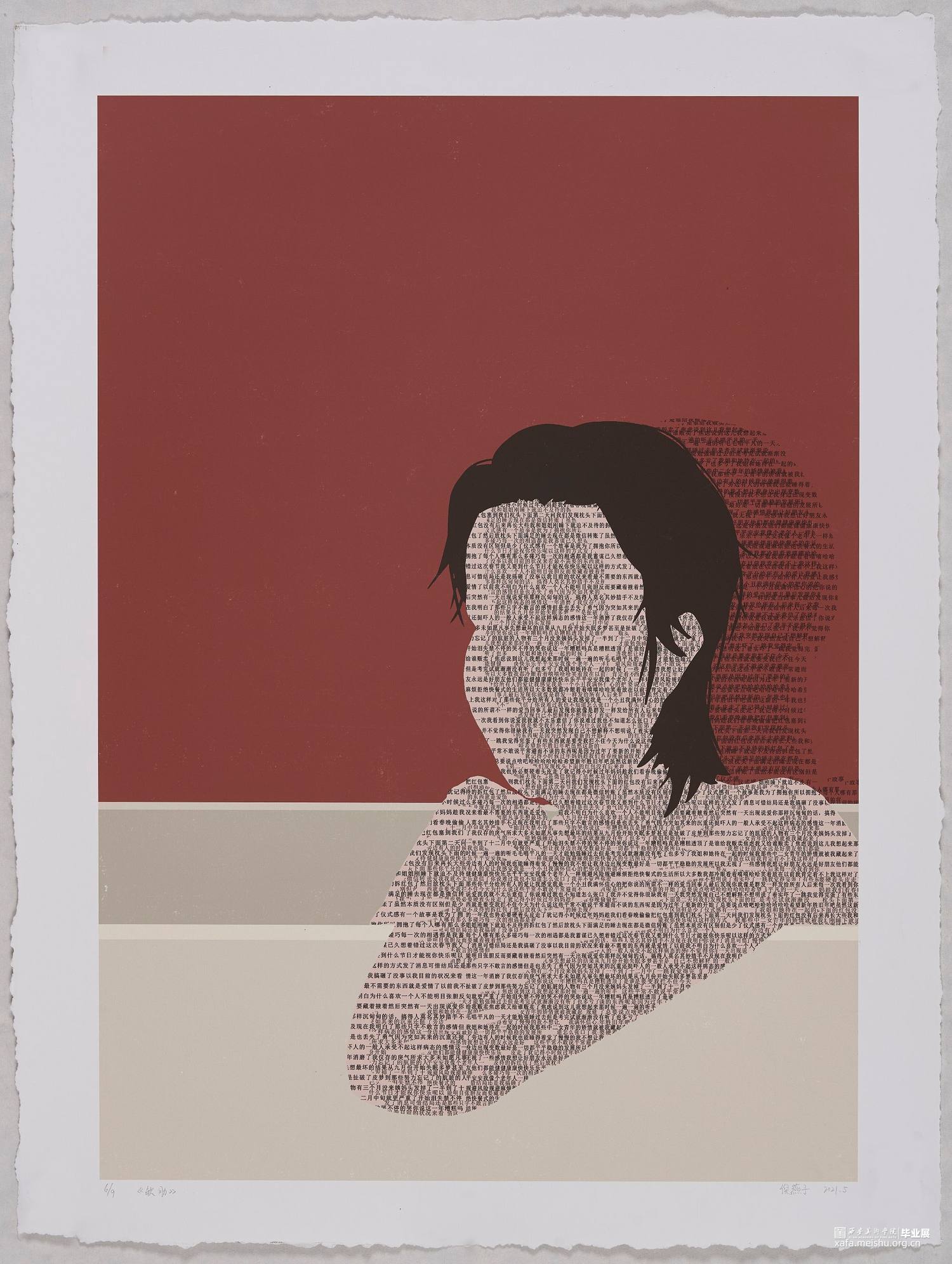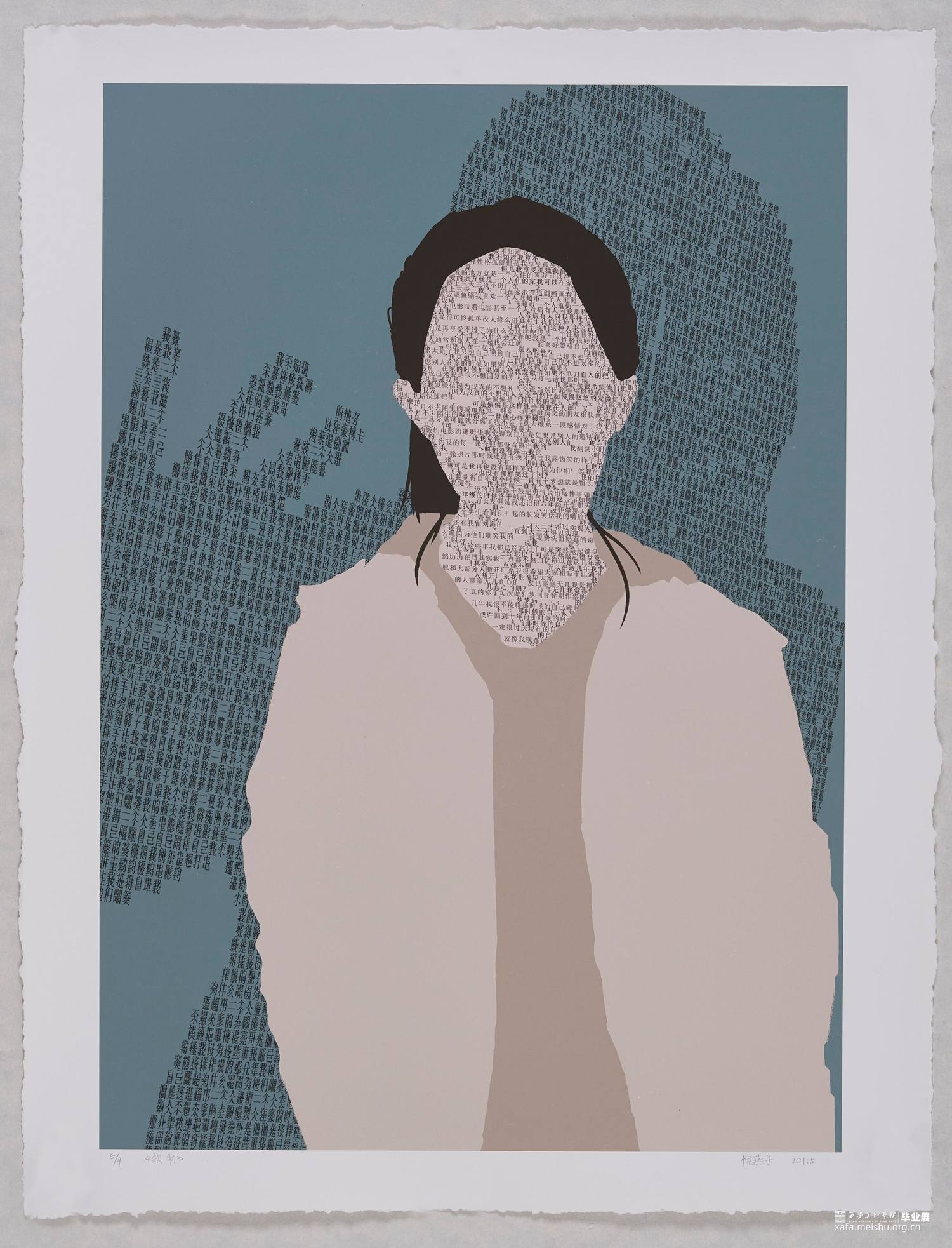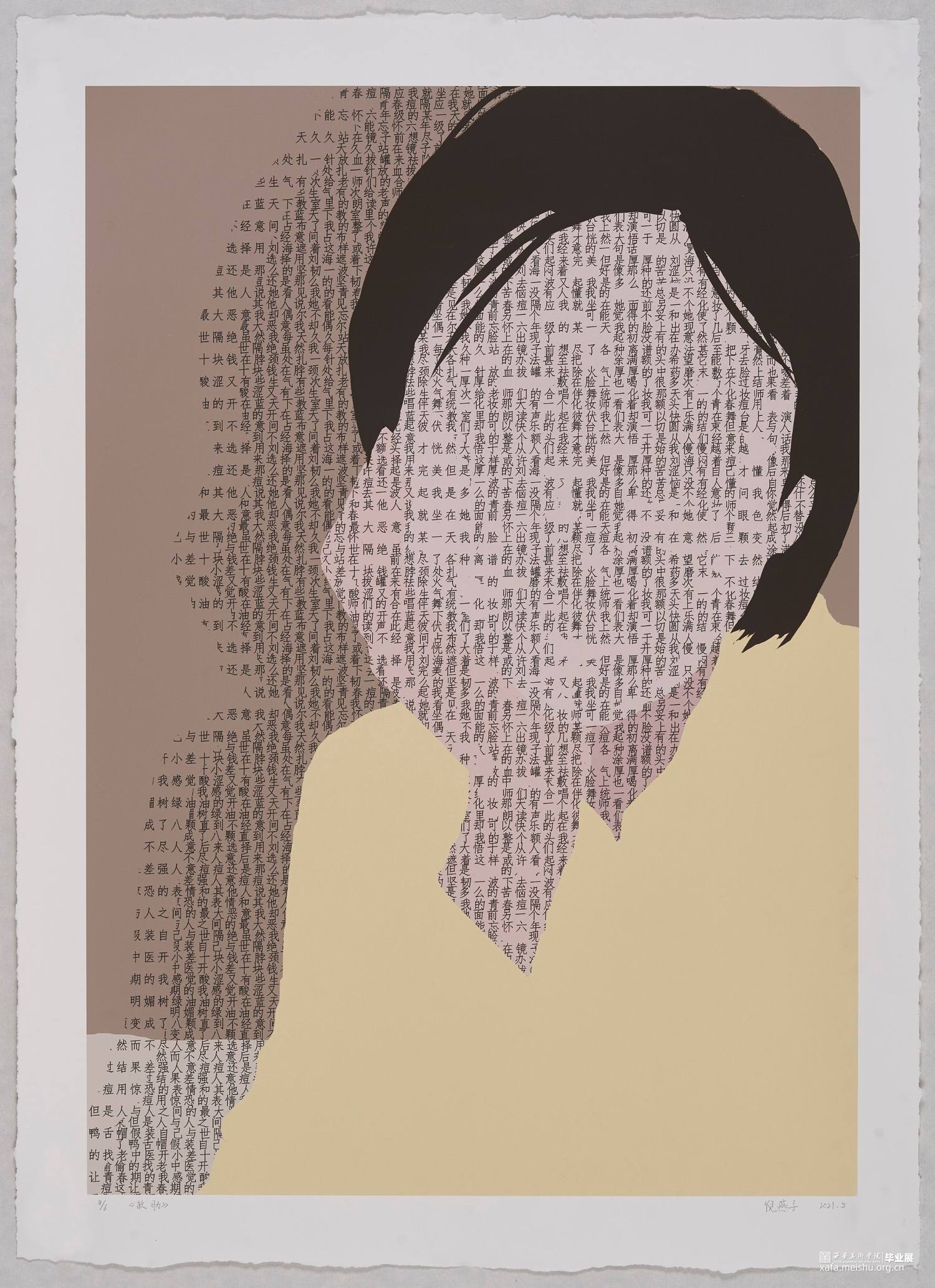《软肋》系列作品以关注人们在生活中受到的隐性创伤事件为背景,结合受访者的故事以及照片进行创作,将文字作为画面的一部分进行二次创作。我通过PS绘画的形式将人像和文字结合,再用丝网版画进行手工印制。作品中所有区域都是平面的、近乎抽象的形式,只在皮肤上加以文字体现不同肌理效果。画面中每个人物形象背后都有着一个或重叠或变形的文字组成来自于受访者心里的另一个形象。该系列作品意在鼓励人们可以理清自己的心理创伤,直面伤痛,妥善处理“伤口”,每个人都拥有不断成长和自我改变的内在力量,接纳和面对,我们才能拥有超越自我的动力和勇气