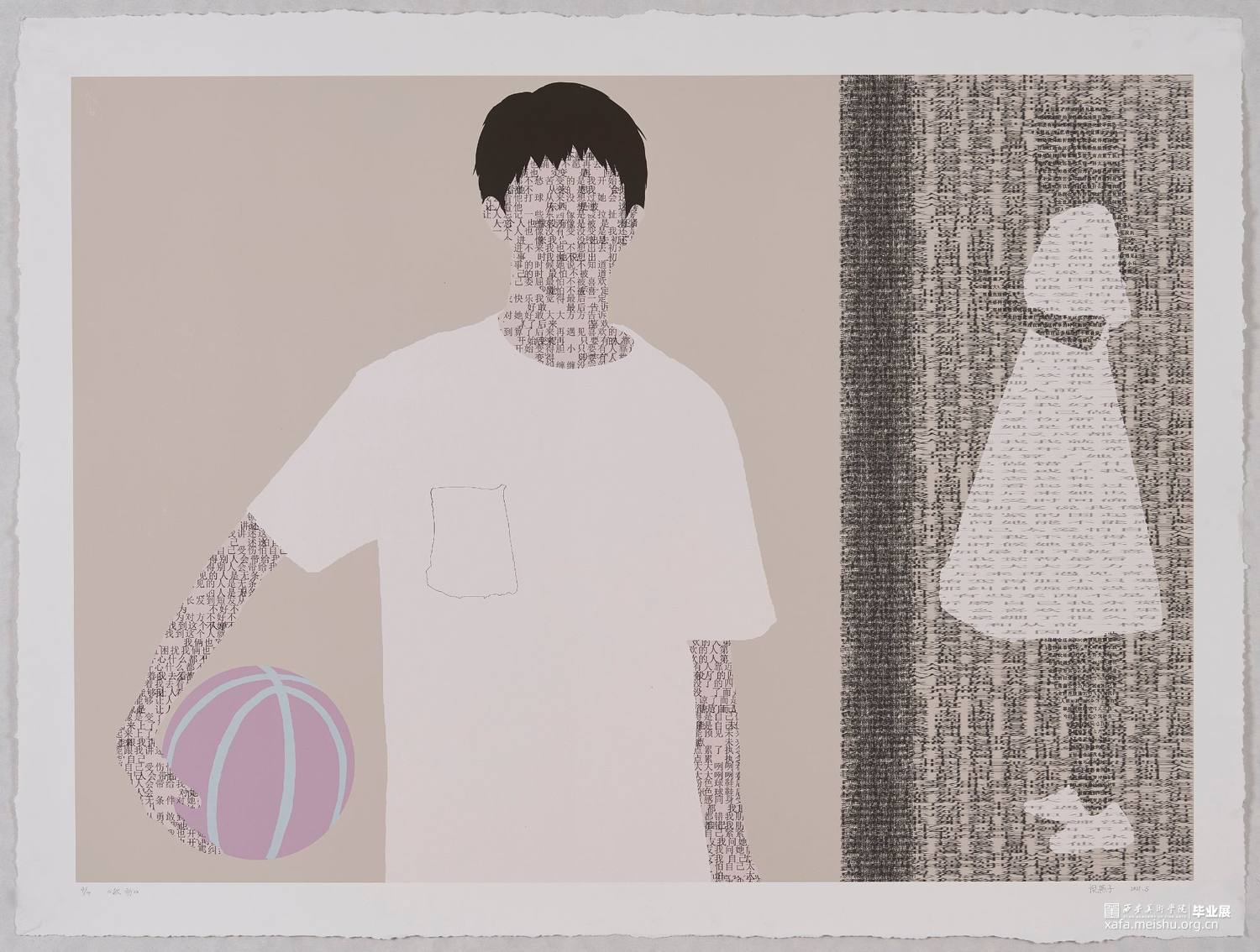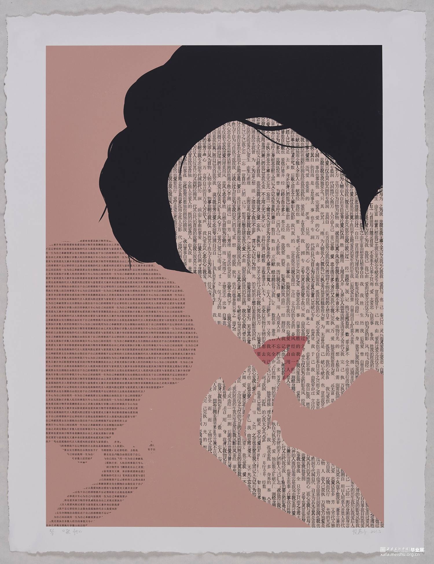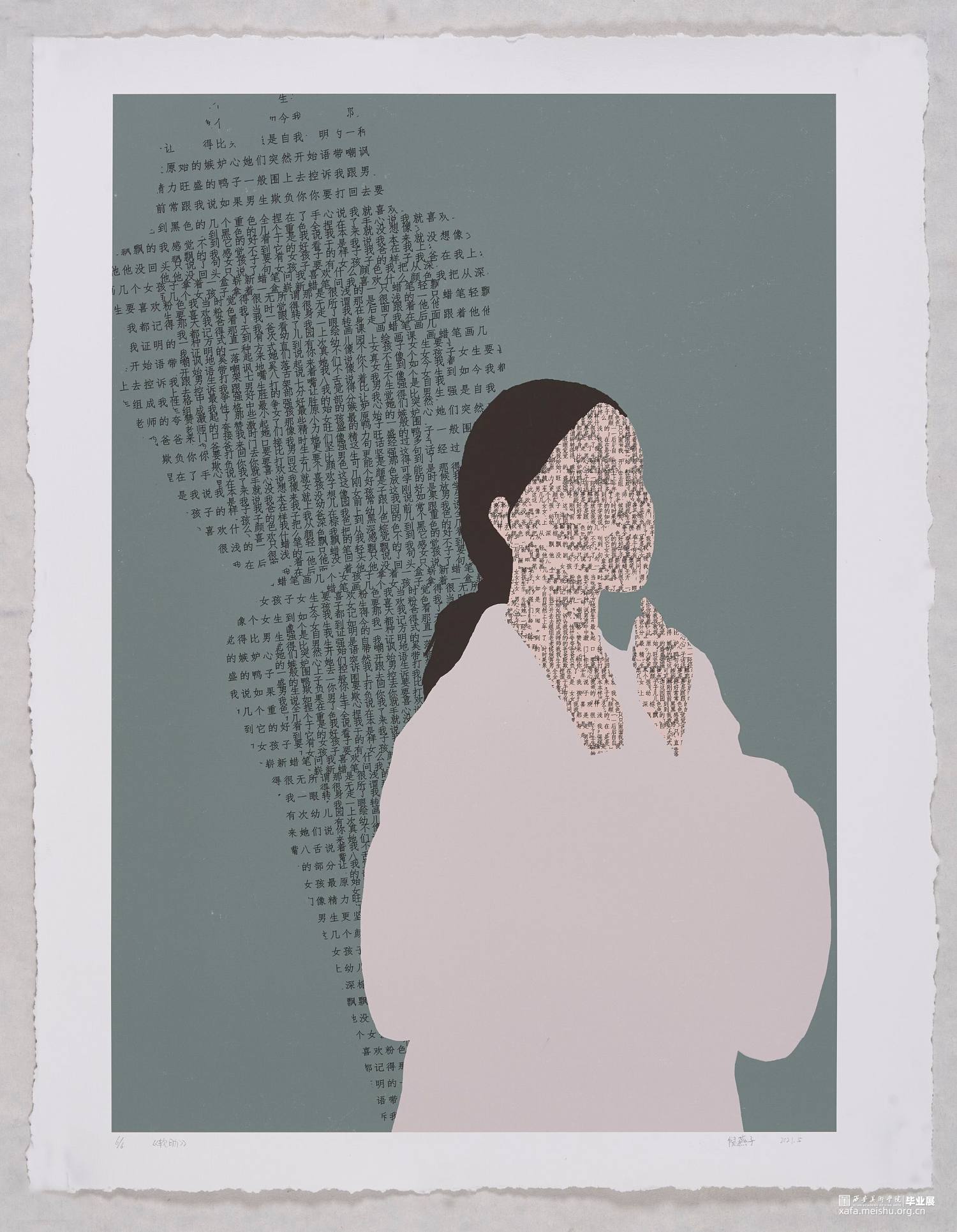 《软肋》系列作品以关注人们在生活中受到的隐性创伤事件为背景,结合受访者的故事以及照片进行创作,将文字作为画面的一部分进行二次创作。我通过PS绘画的形式将人像和文字结合,再用丝网版画进行手工印制。作品中所有区域都是平面的、近乎抽象的形式,只在皮肤上加以文字体现不同肌理效果。画面中每个人物形象背后都有着一个或重叠或变形的文字组成来自于受访者心里的另一个形象。该系列作品意在鼓励人们可以理清自己的心理创伤,直面伤痛,妥善处理“伤口”,每个人都拥有不断成长和自我改变的内在力量,接纳和面对,我们才能拥有超越自我的动力和勇气