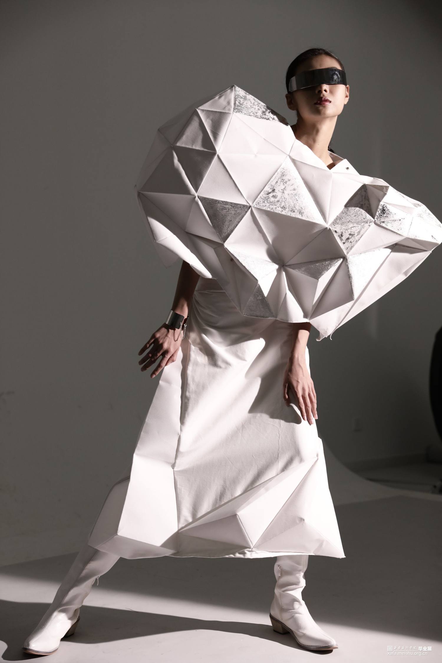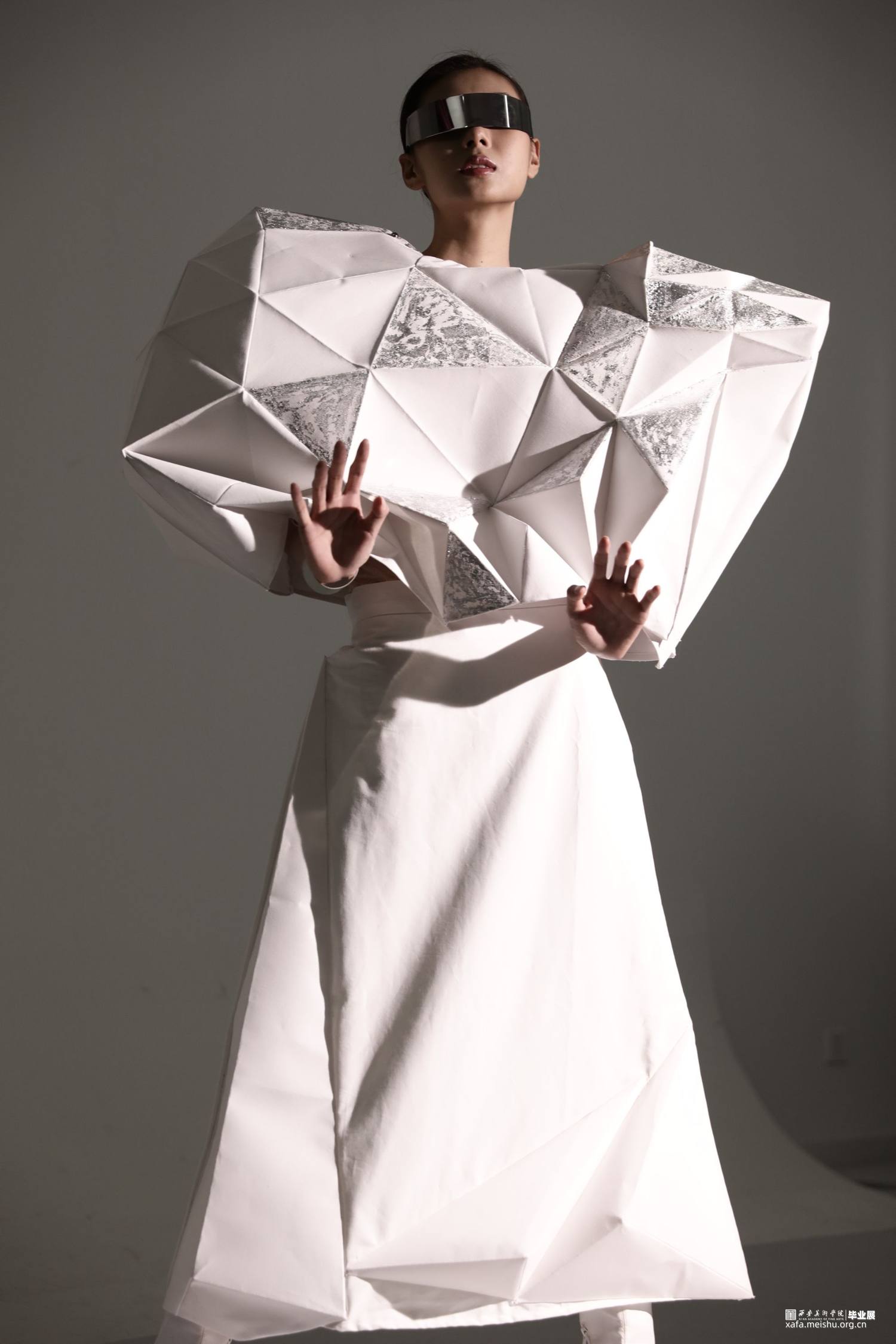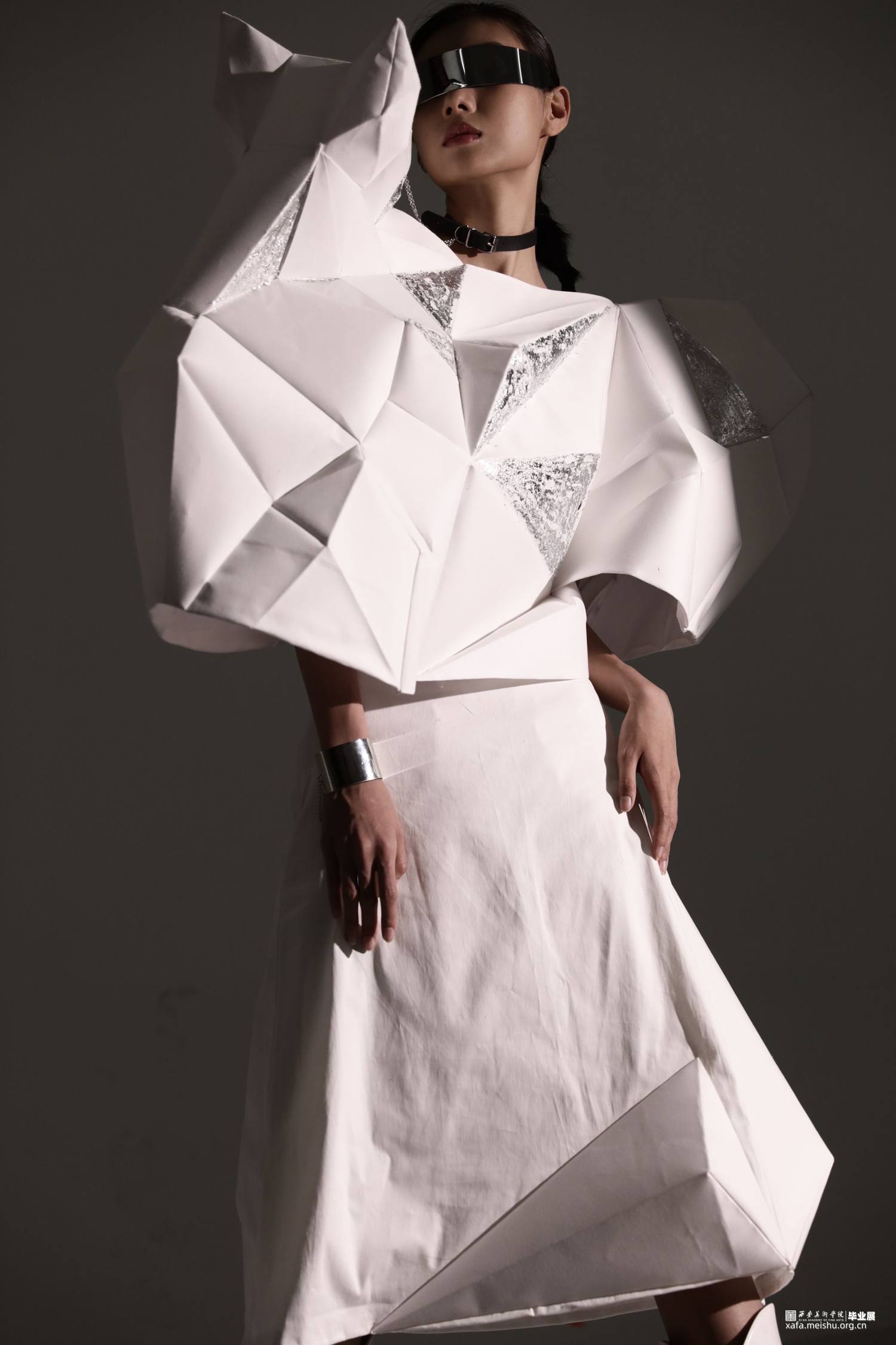 本系列作品灵感来源于《新唐书》中“襞纸为甲,劲矢不能洞”。“襞”是折叠的意思,在唐时,折纸在服装上就已经有了实践的应用。以此为铺垫,结合自然生物与折纸,设计仿生折纸服装。