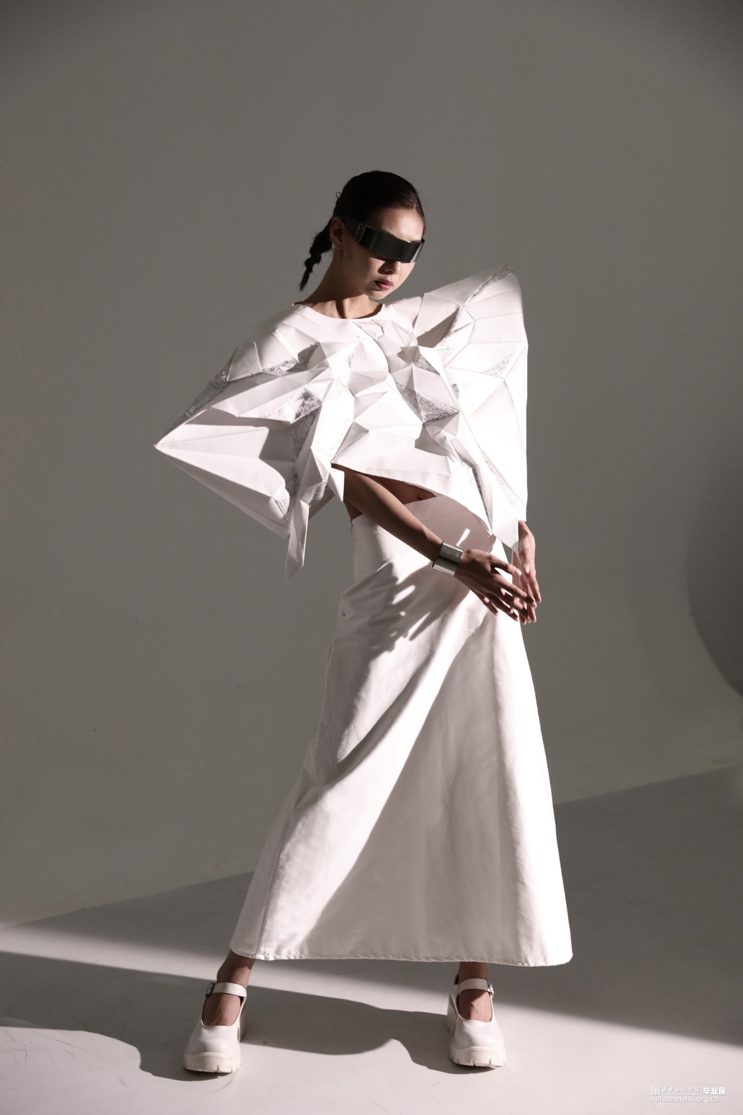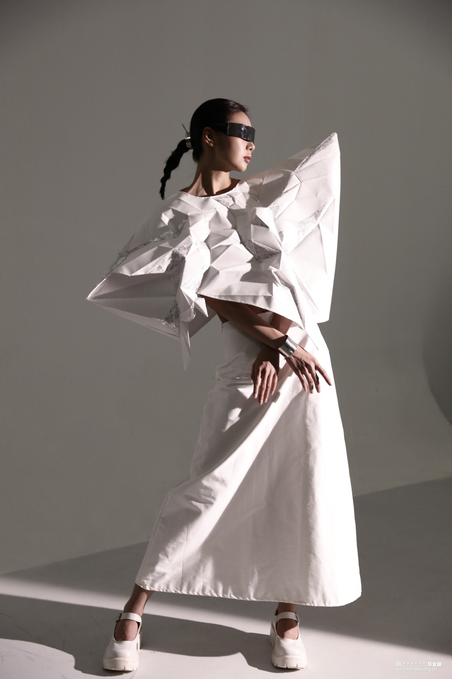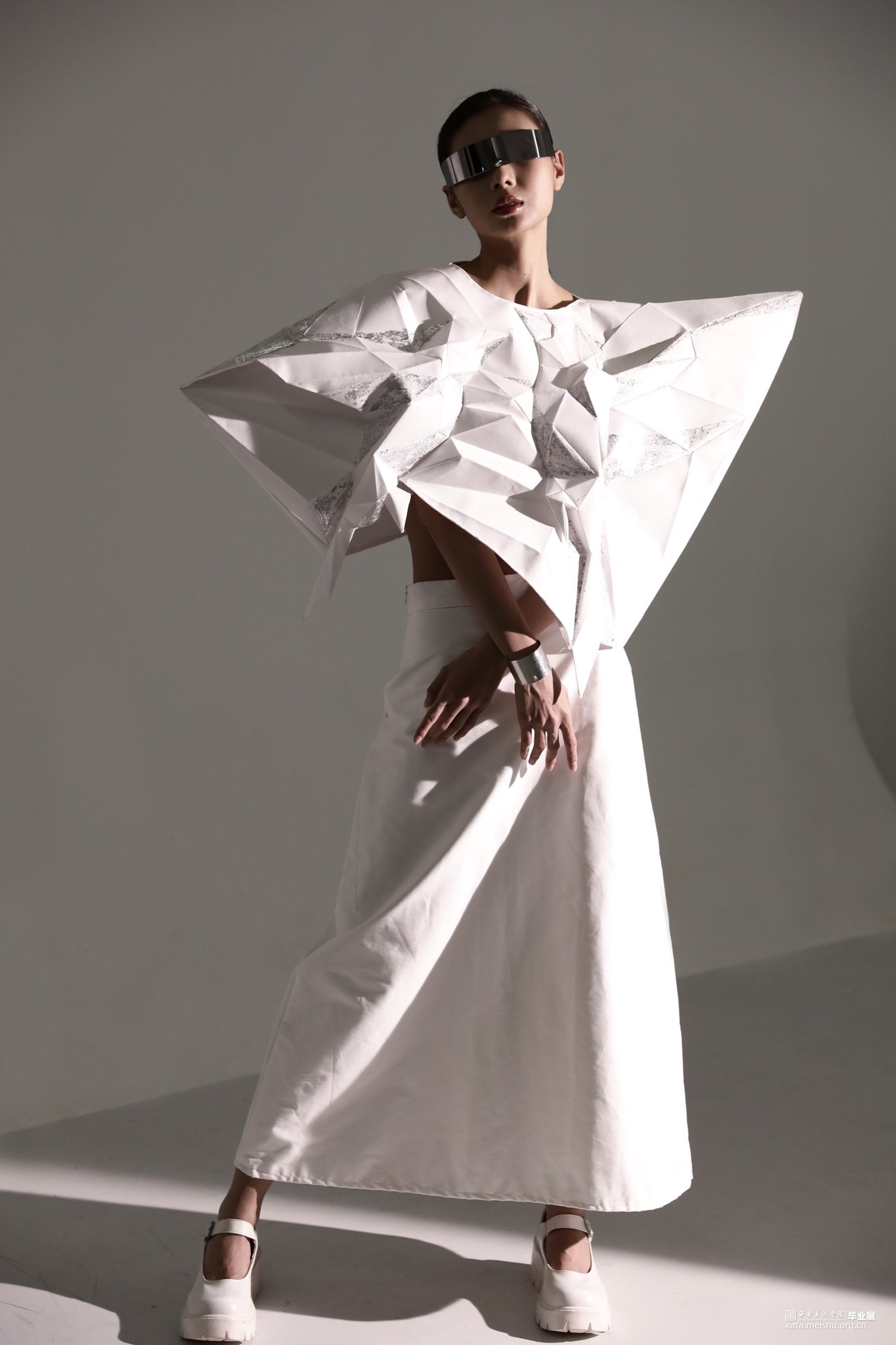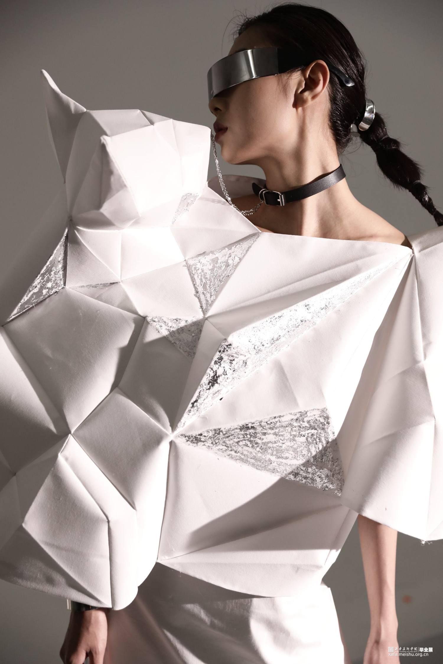 本系列作品灵感来源于《新唐书》中“襞纸为甲,劲矢不能洞”。“襞”是折叠的意思,在唐时,折纸在服装上就已经有了实践的应用。以此为铺垫,结合自然生物与折纸,设计仿生折纸服装。