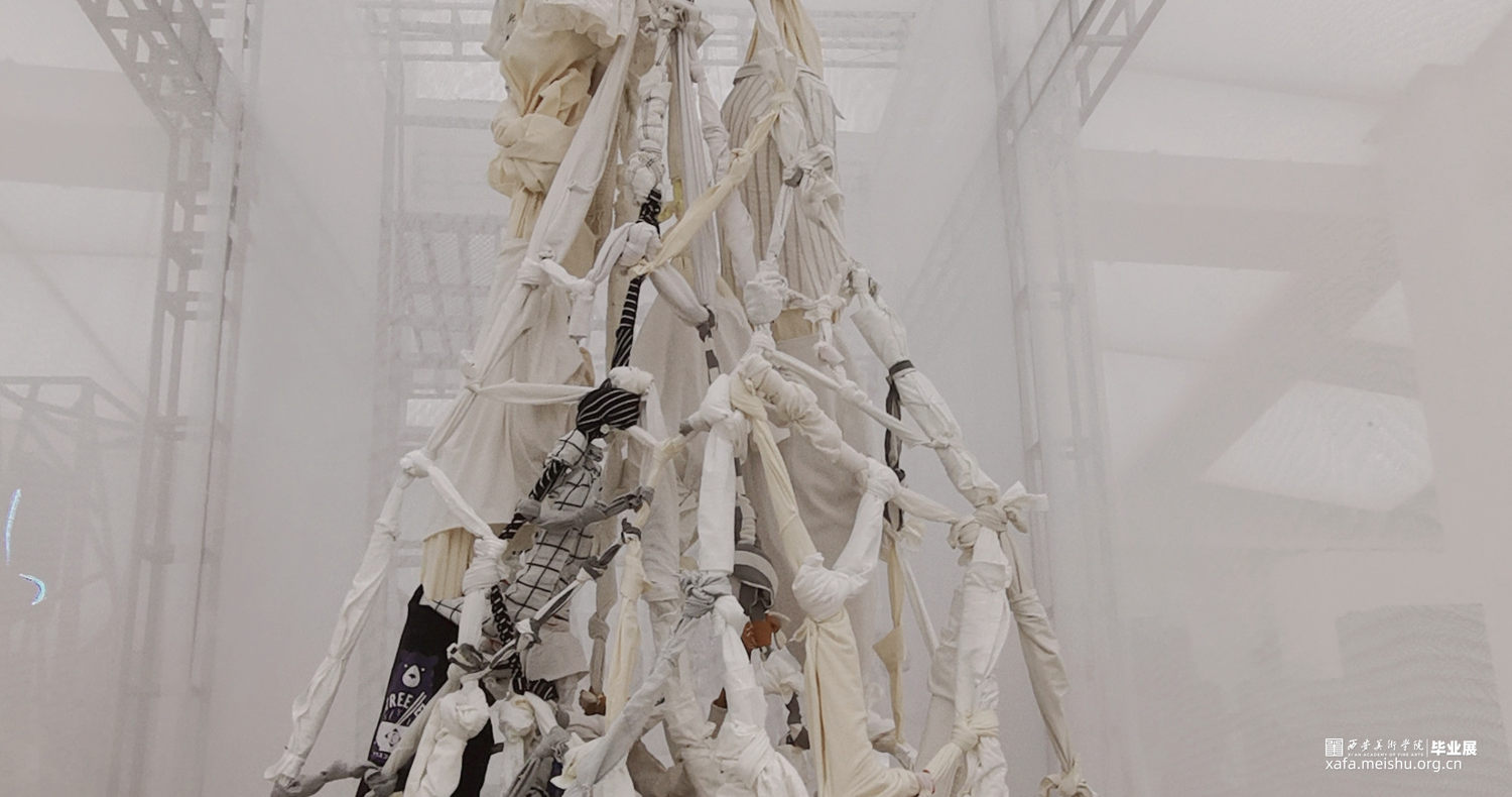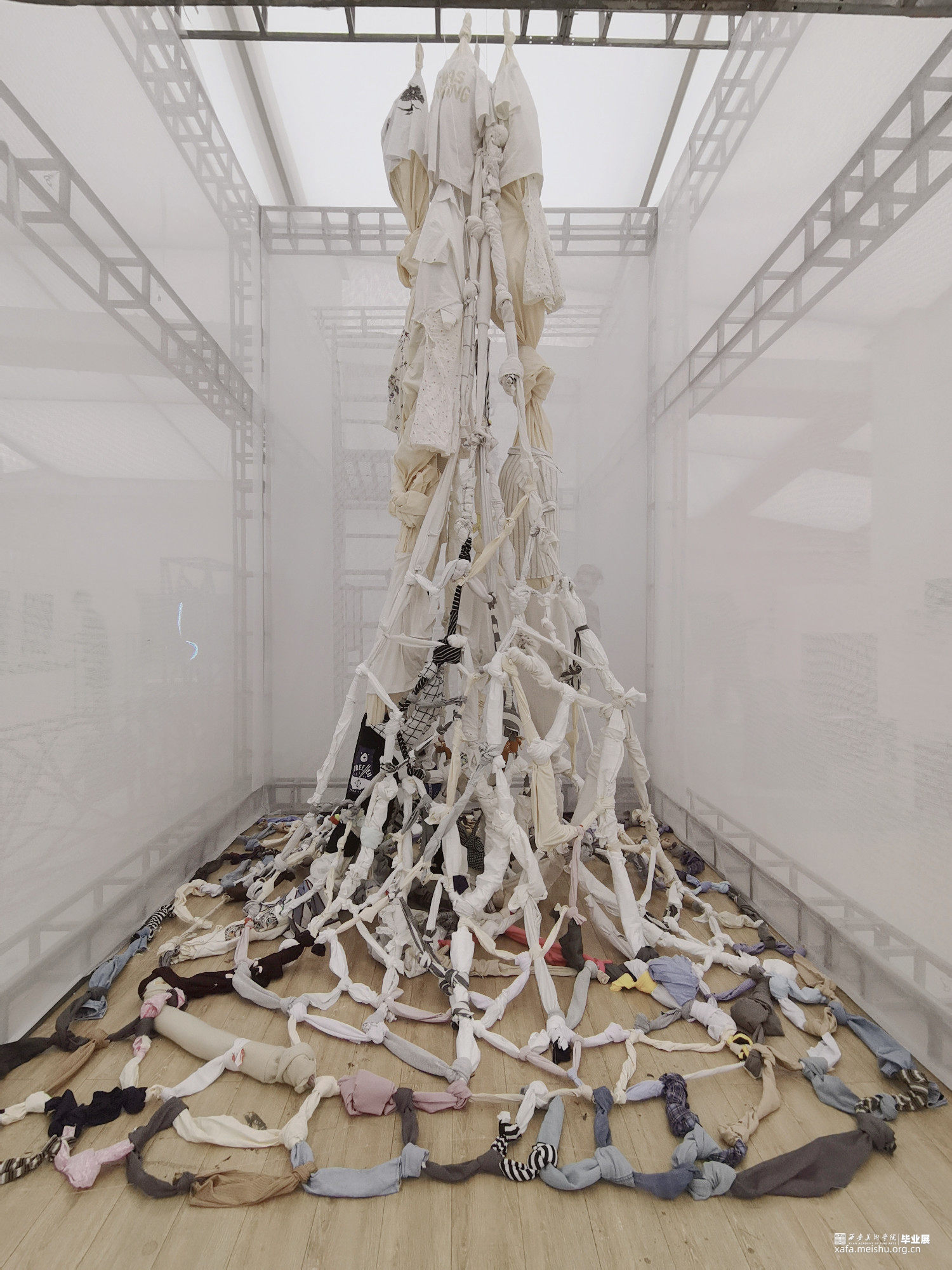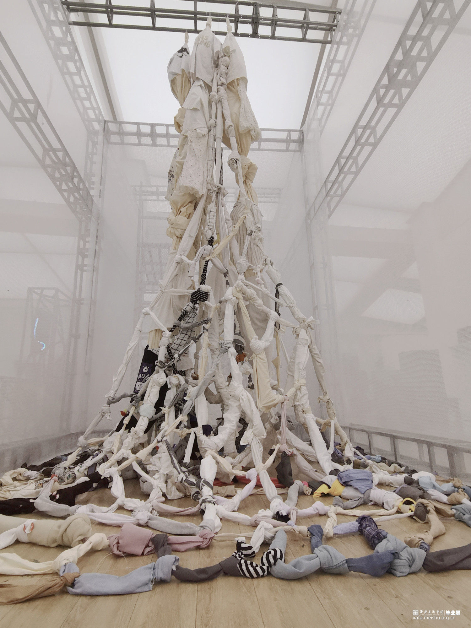 作品通过旧衣物的填充、缠绕、打结等方式进行相互连接,以这种方式表现人与人之间的连接。在这个社会上,人从来都不是孤立的,不论是亲情、友情还是爱情,每个人都会被紧紧地联系在一起,互相依偎,照顾,互帮互助,就像作品所展现的一样,每个人之间都会被紧紧连接。单丝不成线,独木不成林。没有人是孤独的个体,也没有人能独自的成功,不论什么时候,都会有人与你同在!