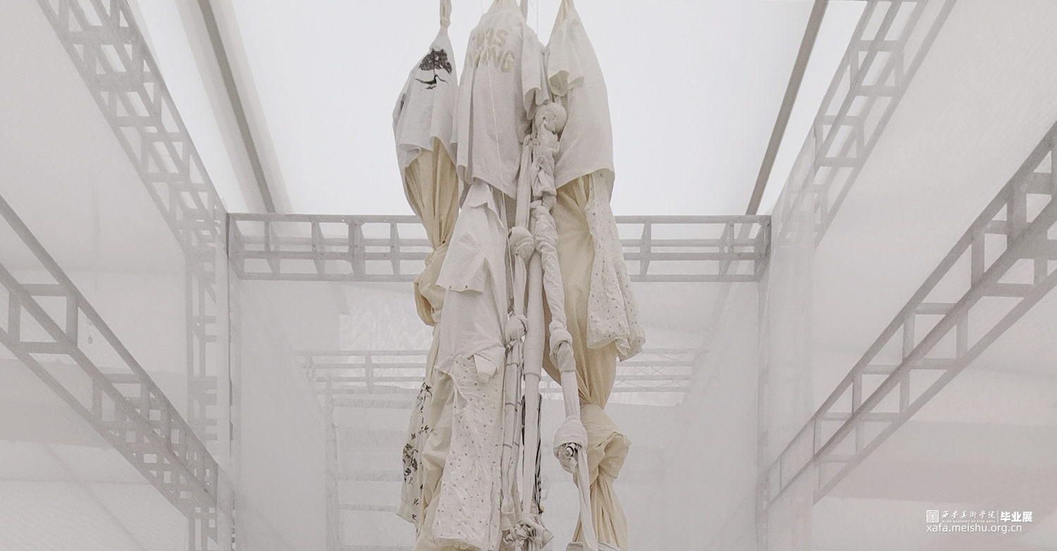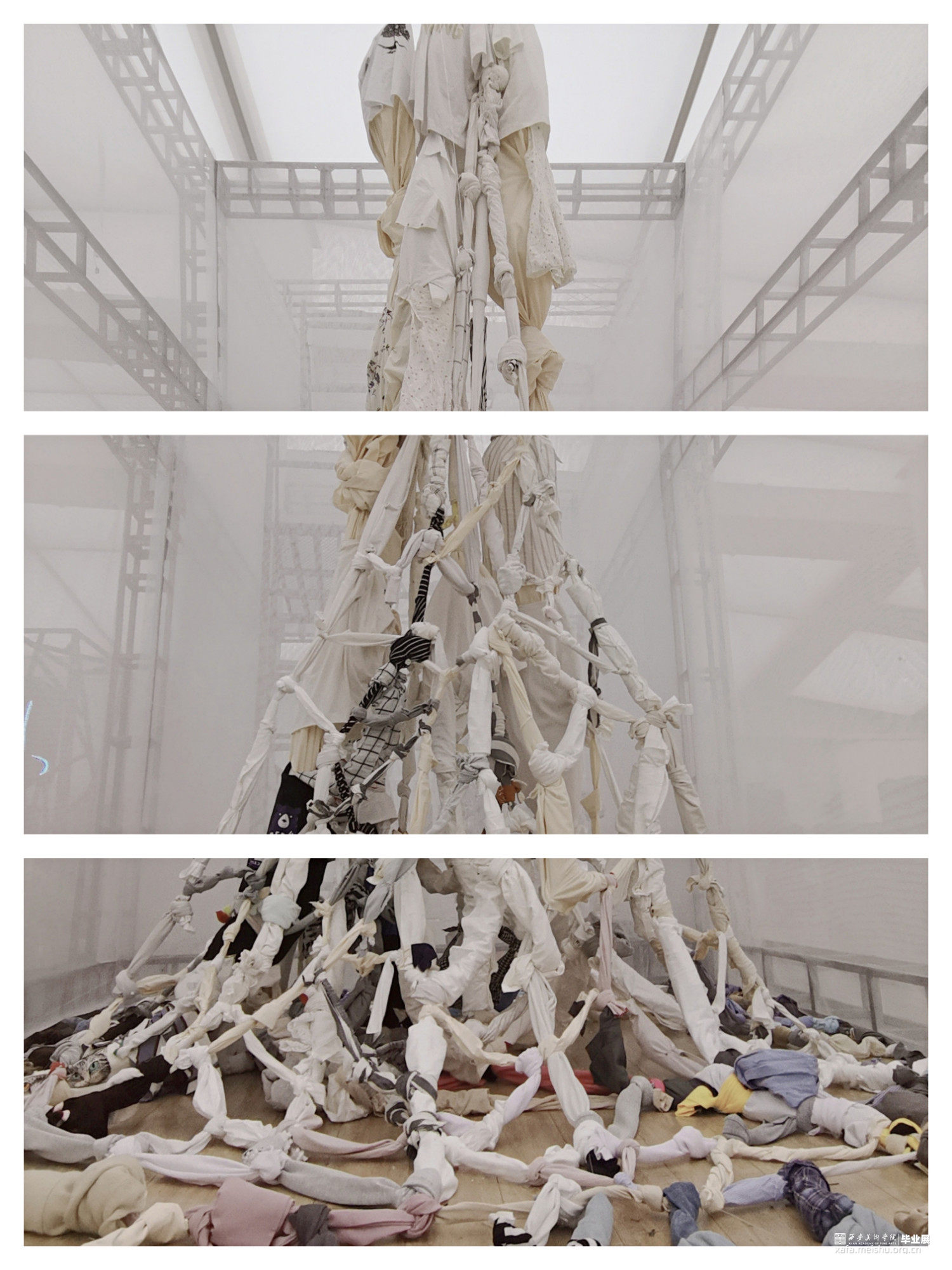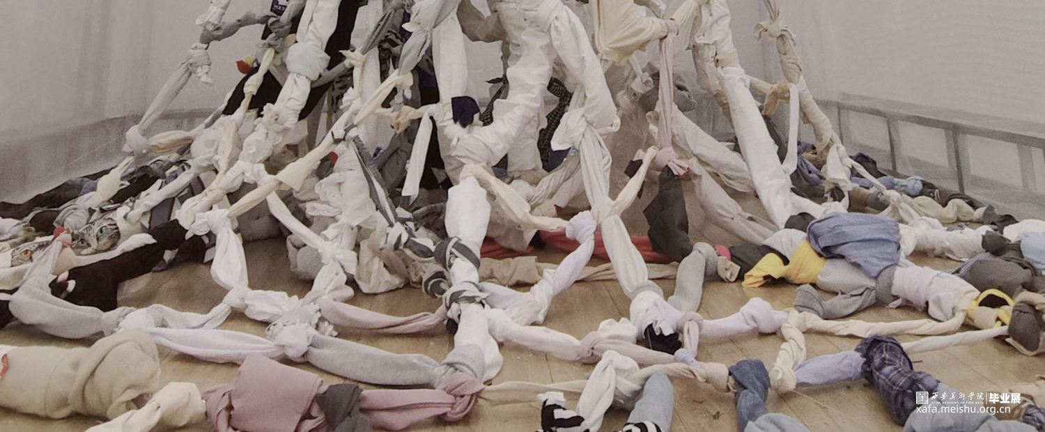 作品通过旧衣物的填充、缠绕、打结等方式进行相互连接,以这种方式表现人与人之间的连接。在这个社会上,人从来都不是孤立的,不论是亲情、友情还是爱情,每个人都会被紧紧地联系在一起,互相依偎,照顾,互帮互助,就像作品所展现的一样,每个人之间都会被紧紧连接。单丝不成线,独木不成林。没有人是孤独的个体,也没有人能独自的成功,不论什么时候,都会有人与你同在!