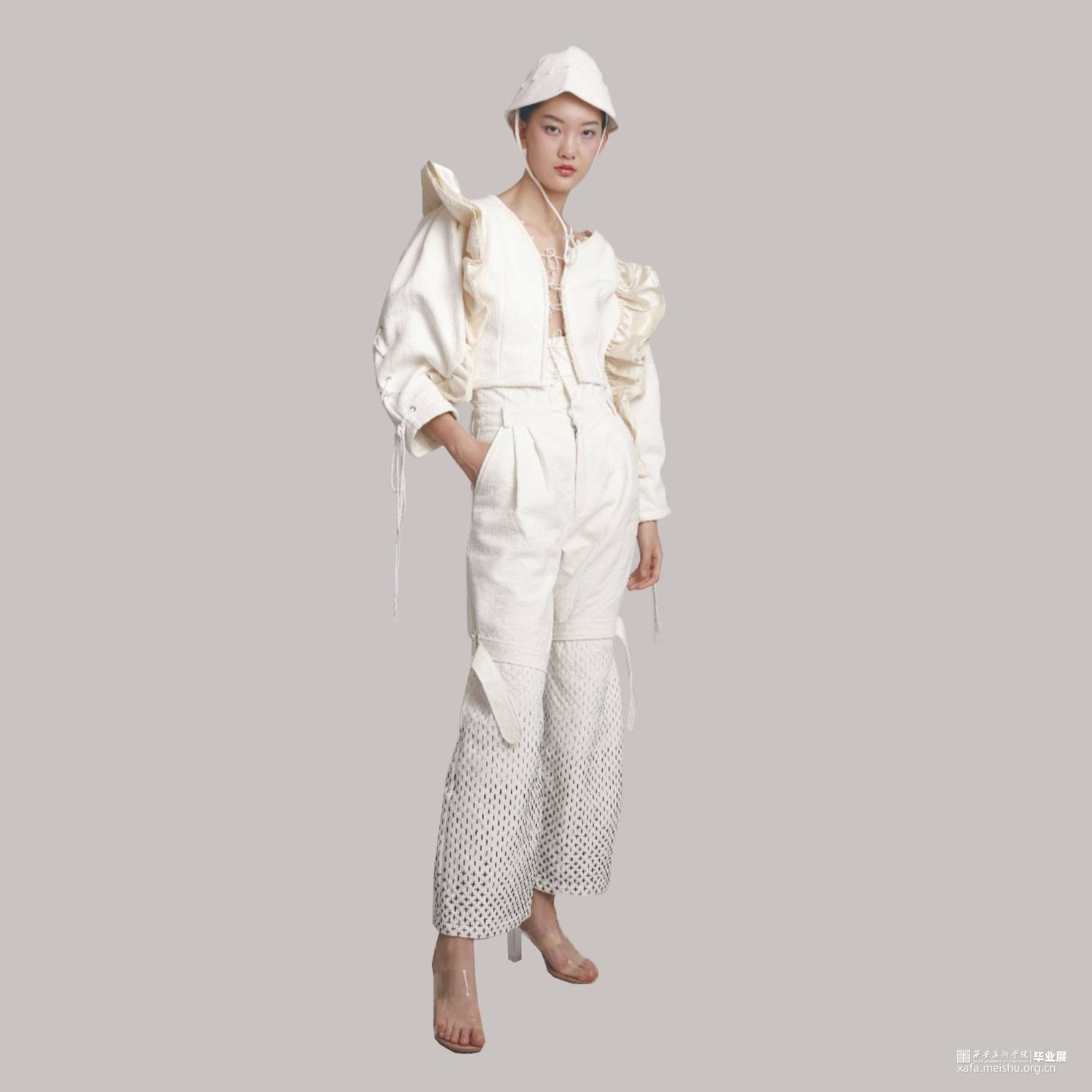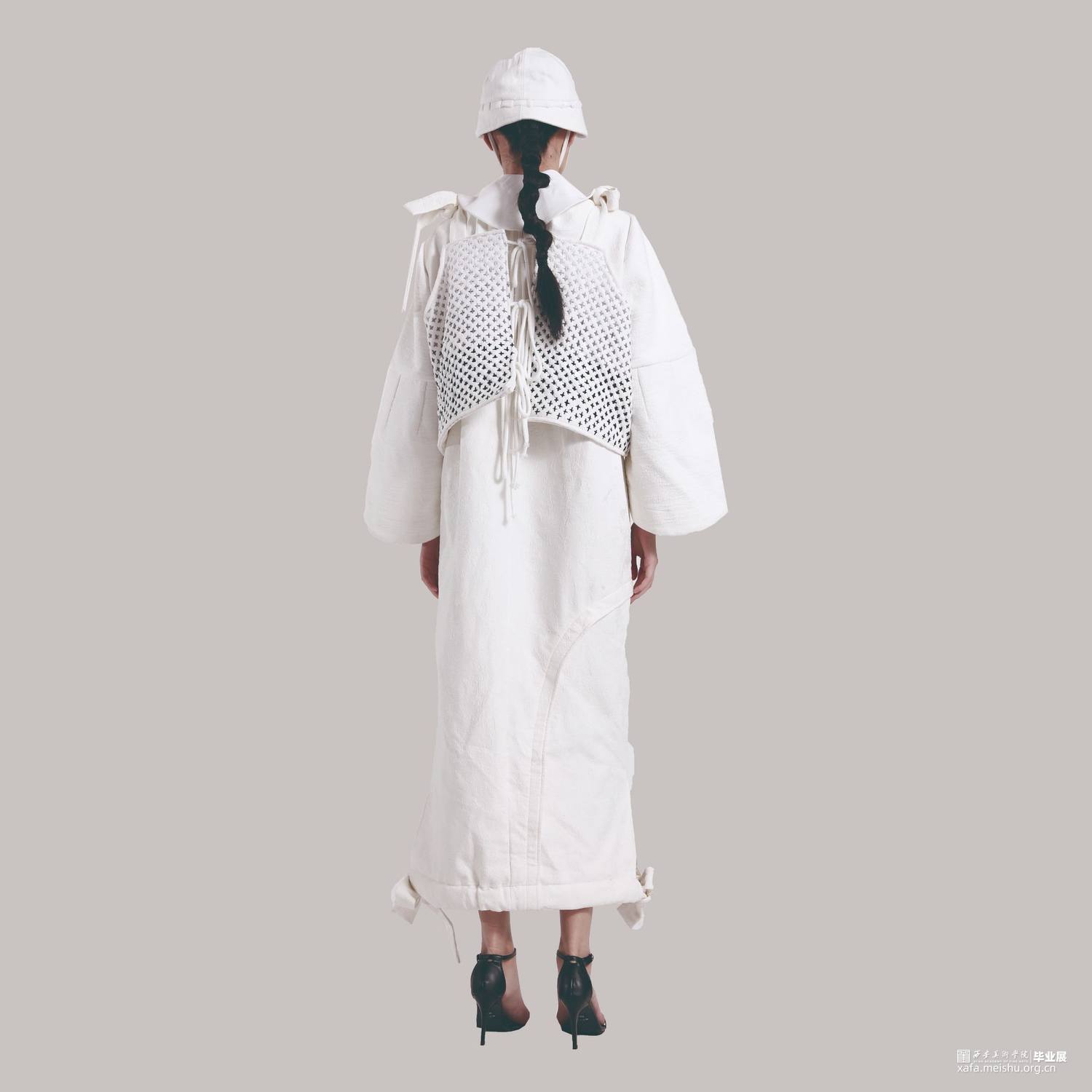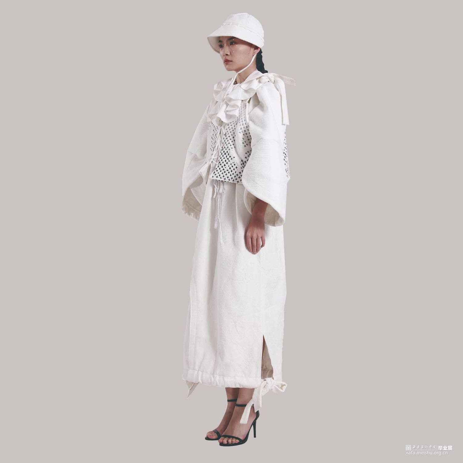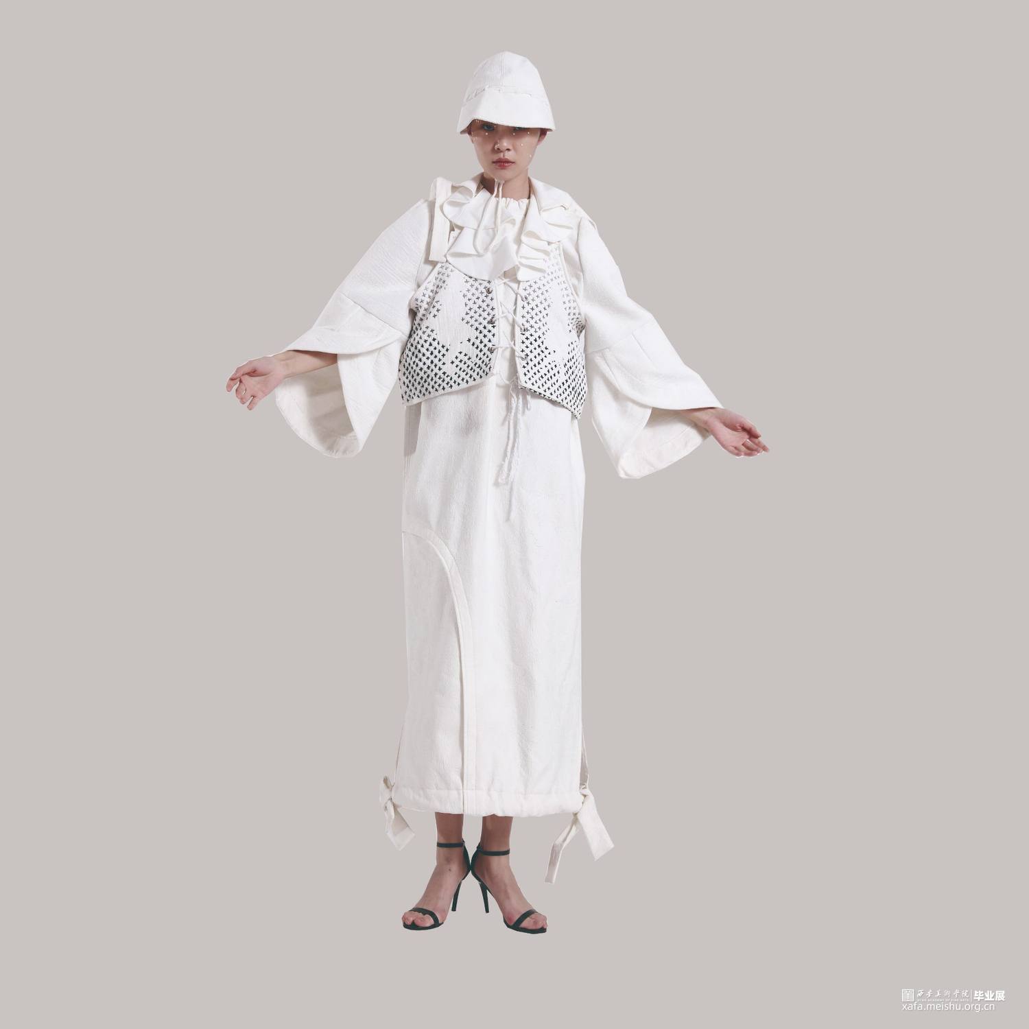 本次设计采用棉麻面料,色彩上运用黑白灰的渐变效果,通过对唐代金银器中凤鸟纹的提炼和归纳,运用在现代礼服设计中,希望对传统文化起到传承发扬的运用