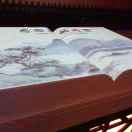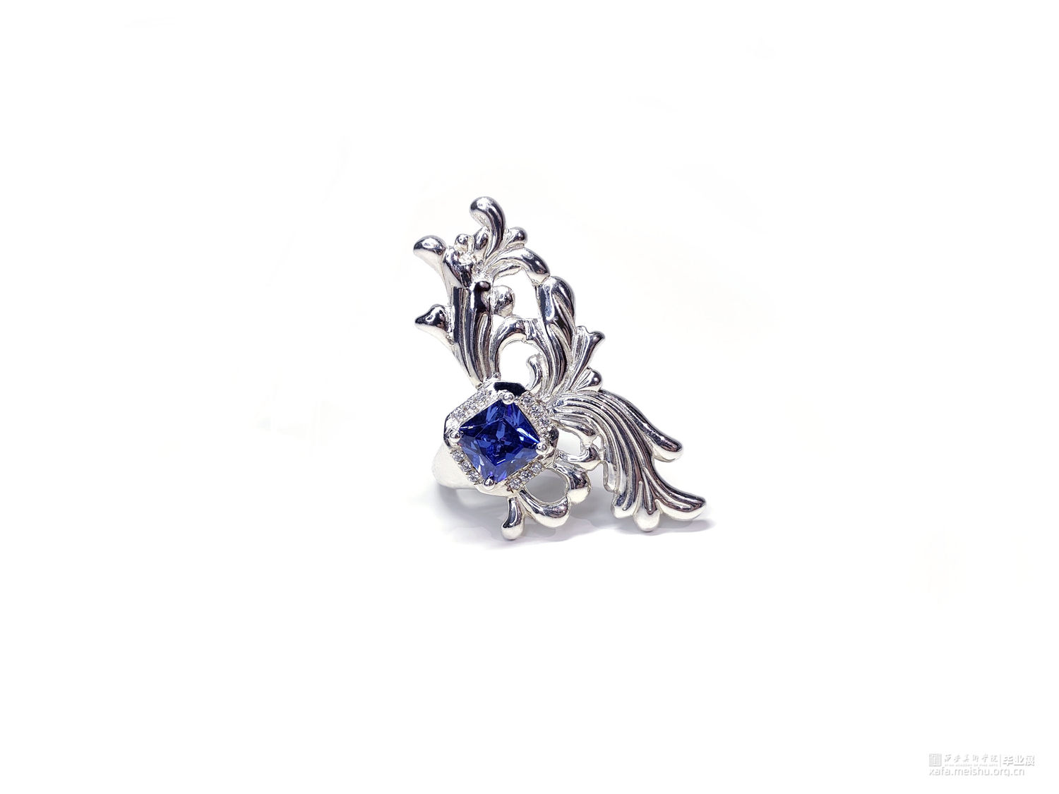 戒指提取敦煌传统花样局部经过整合,突出造型中不对称的美感,中间镶嵌8×8毫米正方形人造坦桑石,晶莹剔透,充满流动与稳固的集合美感。