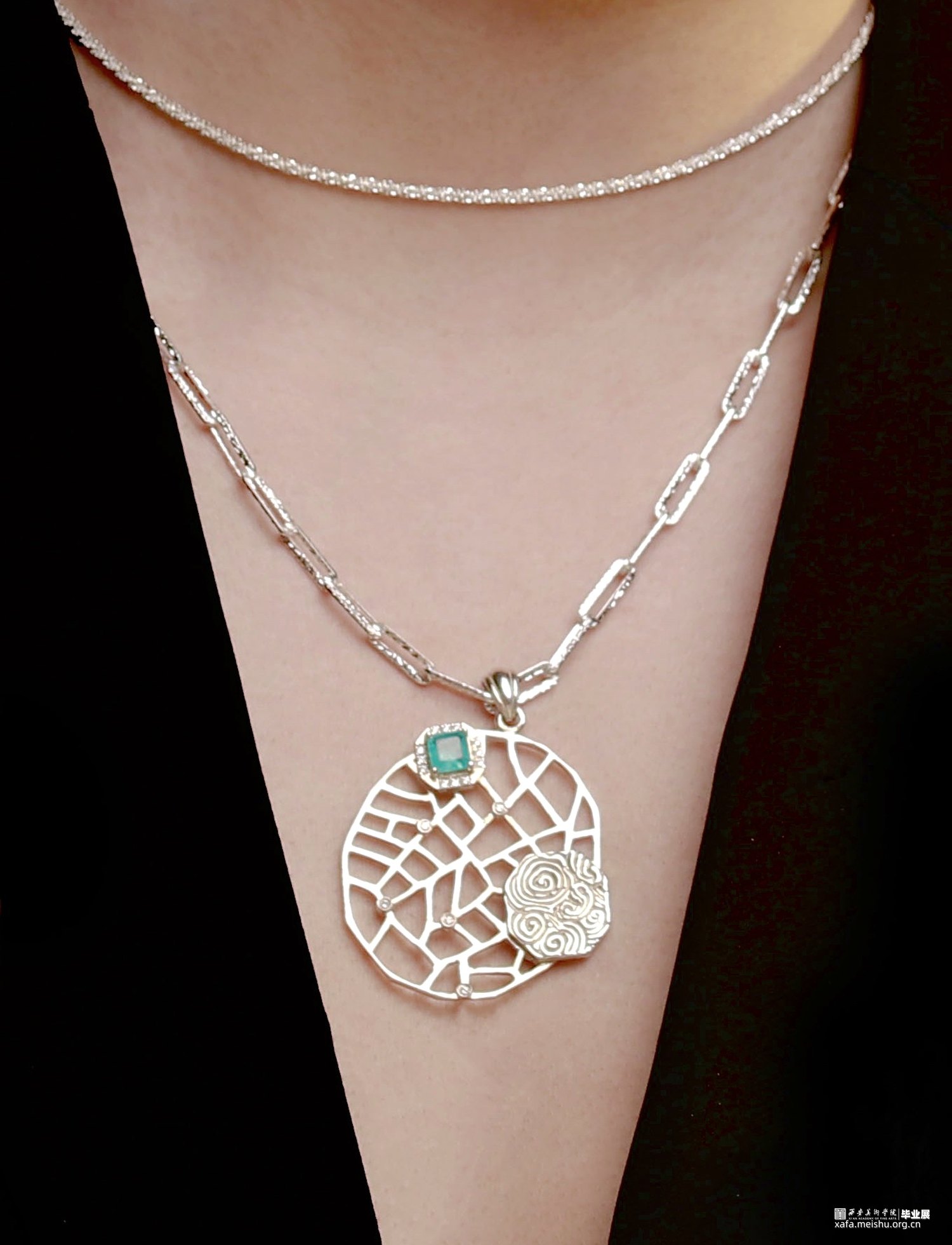 项链由满天星choker、银链条和吊坠组成,底盘为裂变纹理镶嵌数颗白色锆石,右侧为六边形卷云纹盘,整体主石位于左上方镶嵌为6×6毫米正方形人造帕拉伊巴蓝碧玺,线条的穿插组合与硬朗的切割边缘更突出中性的