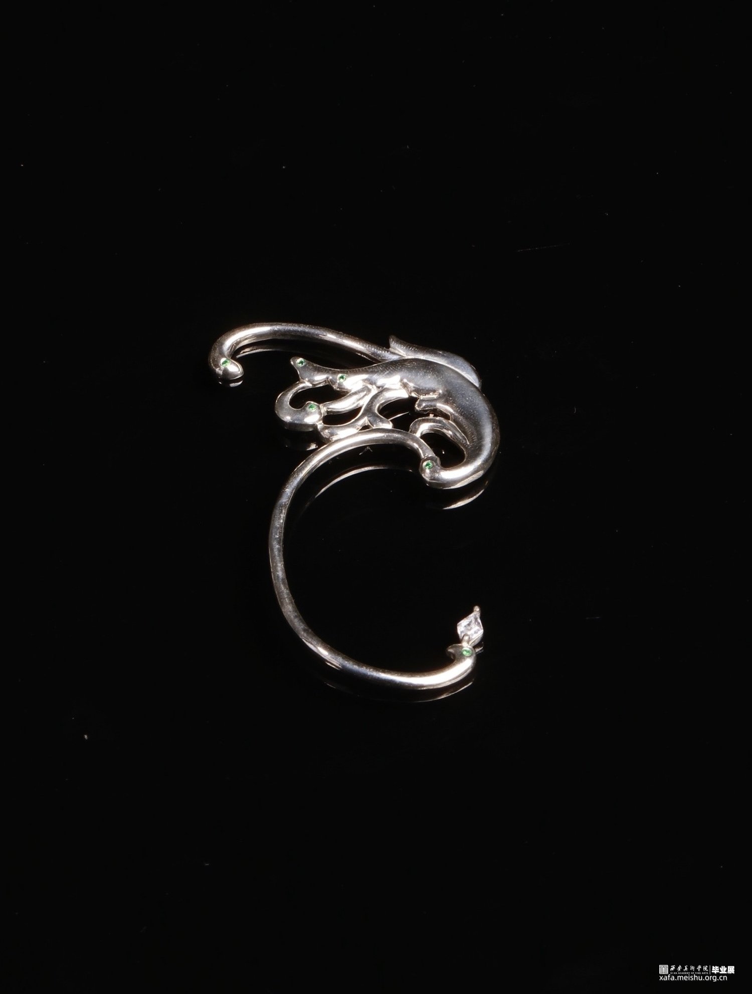 手镯取材于敦煌传统莲花纹整体中的一角进行两次对称设计,传统意味更为浓厚,主图案四周散发出一圈点元素并镶嵌绿色大小不一的圆形碎钻。