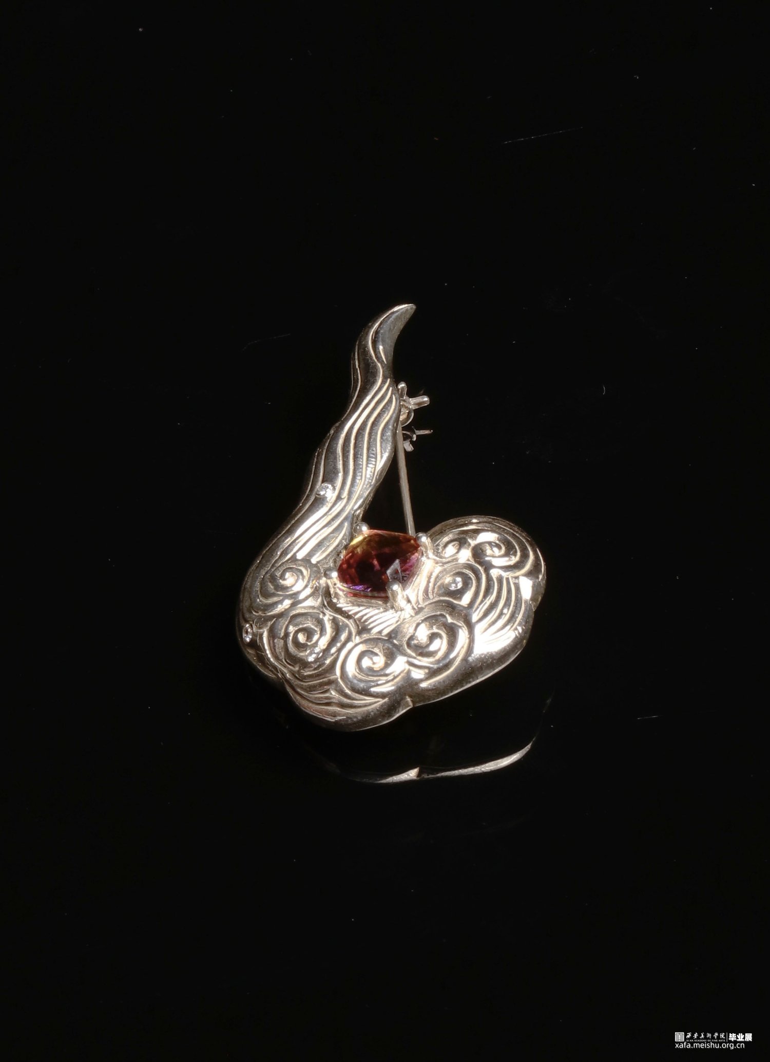 胸针造型为敦煌佛像脚踩的祥云纹,充满飞天元素的吉祥寓意,整体背后做掏空处理,中间镶嵌8×8毫米正方形仿天然西瓜碧玺,表面有些许零星透明小锆石。