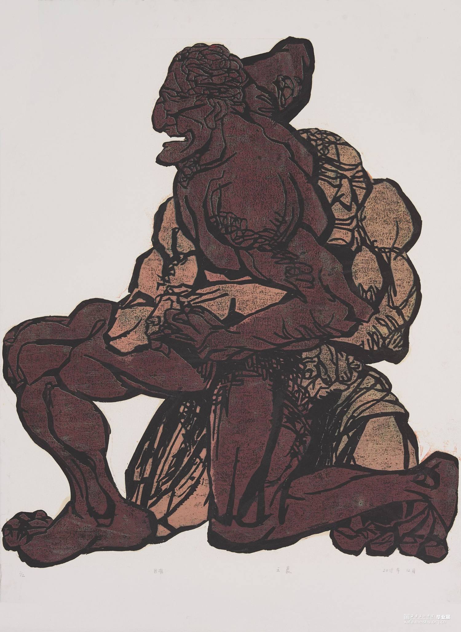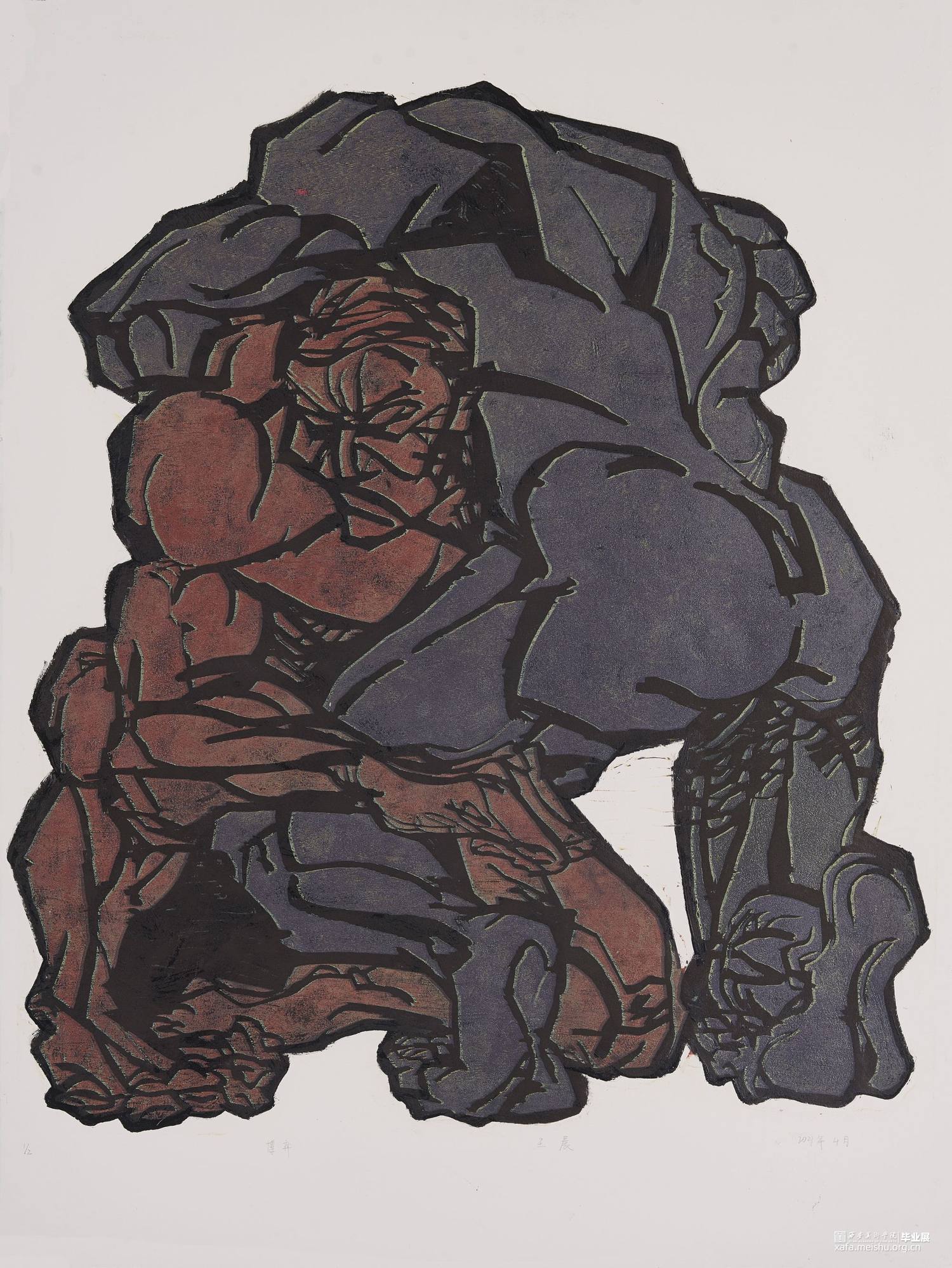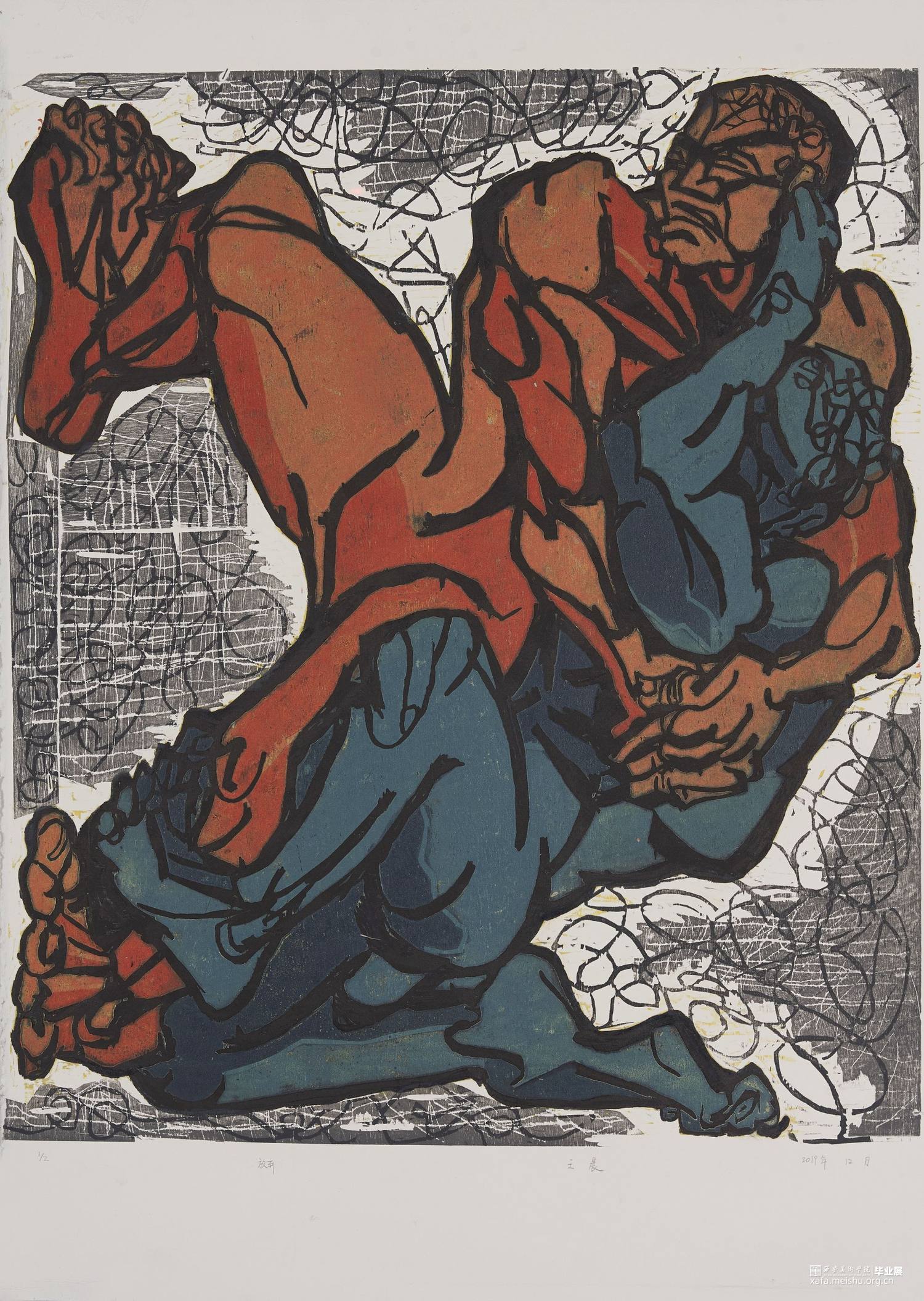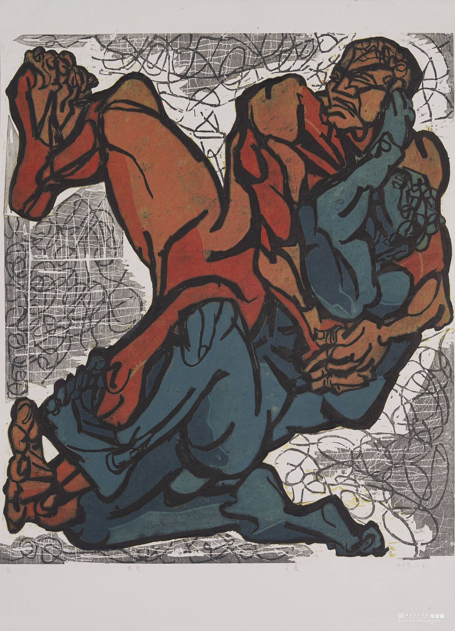 使用套色木刻技法表达搏击中压抑扭曲的人体造型。