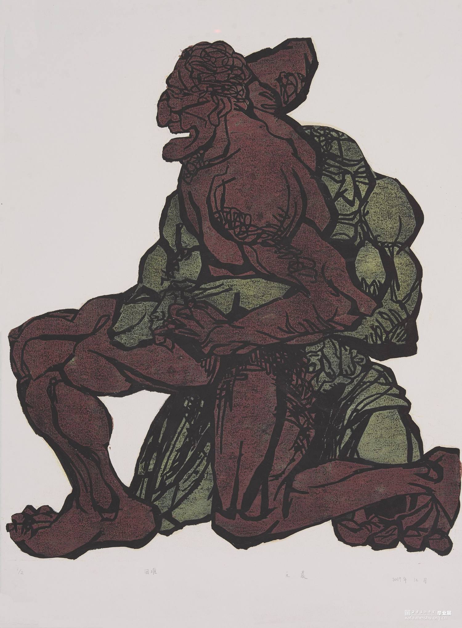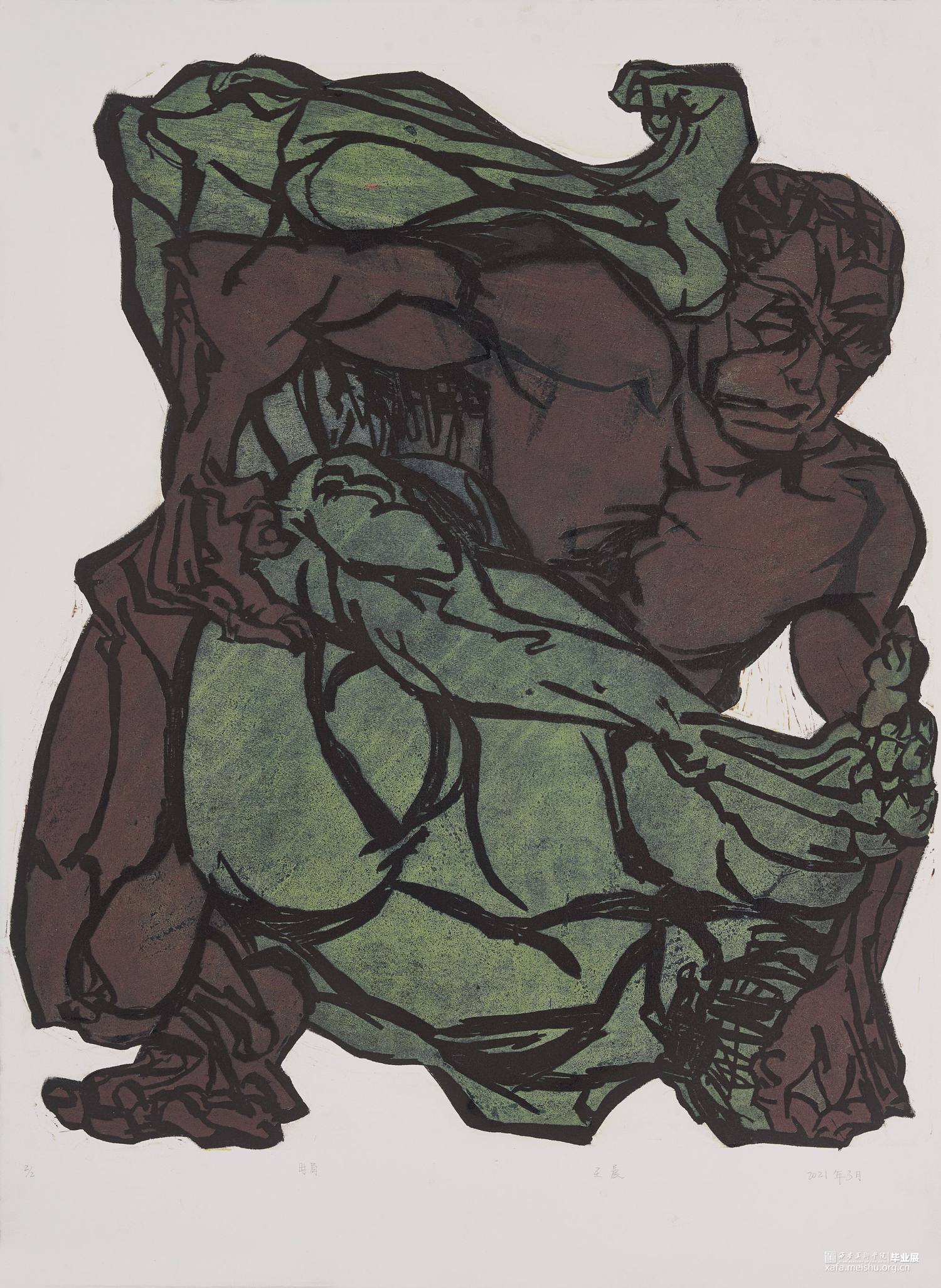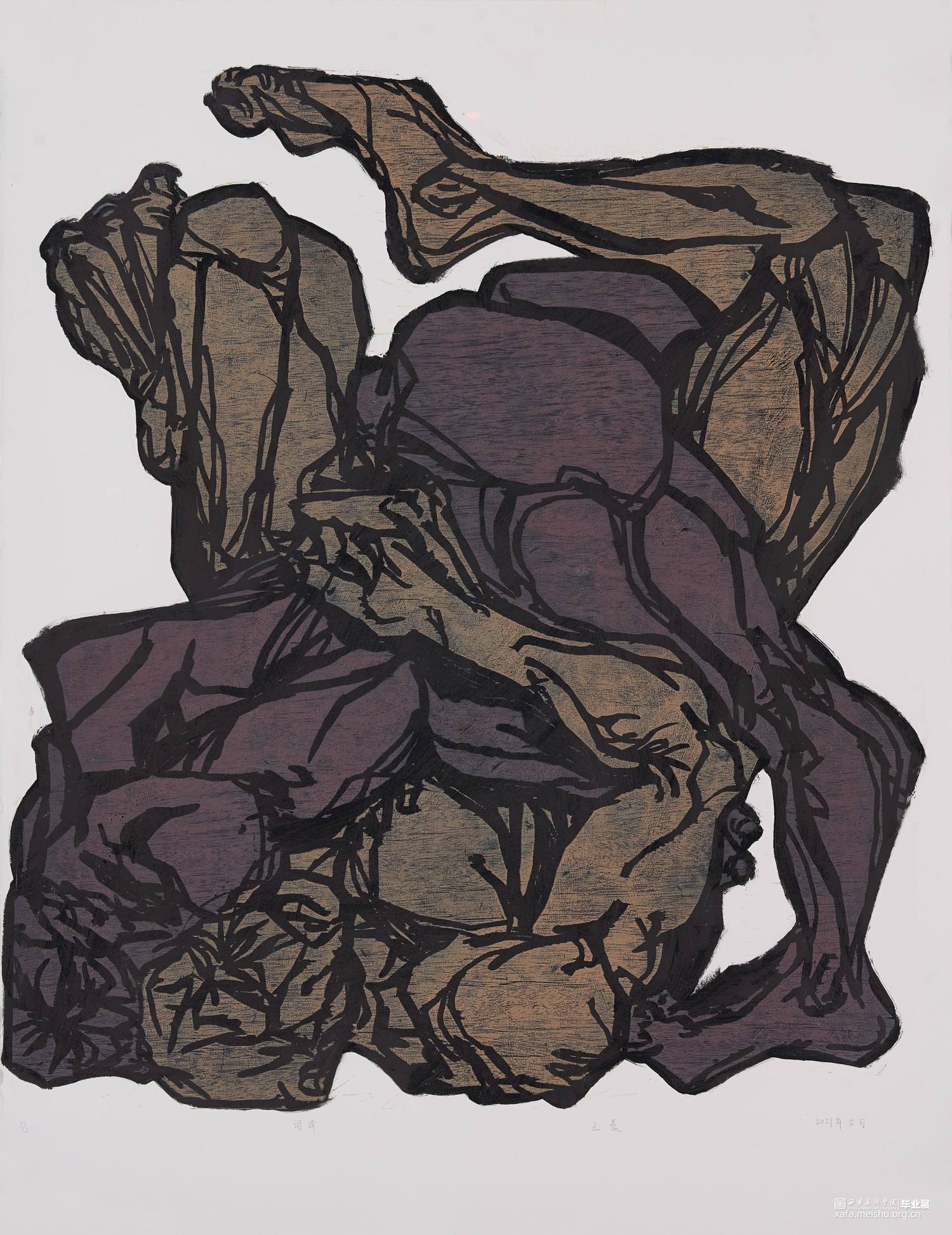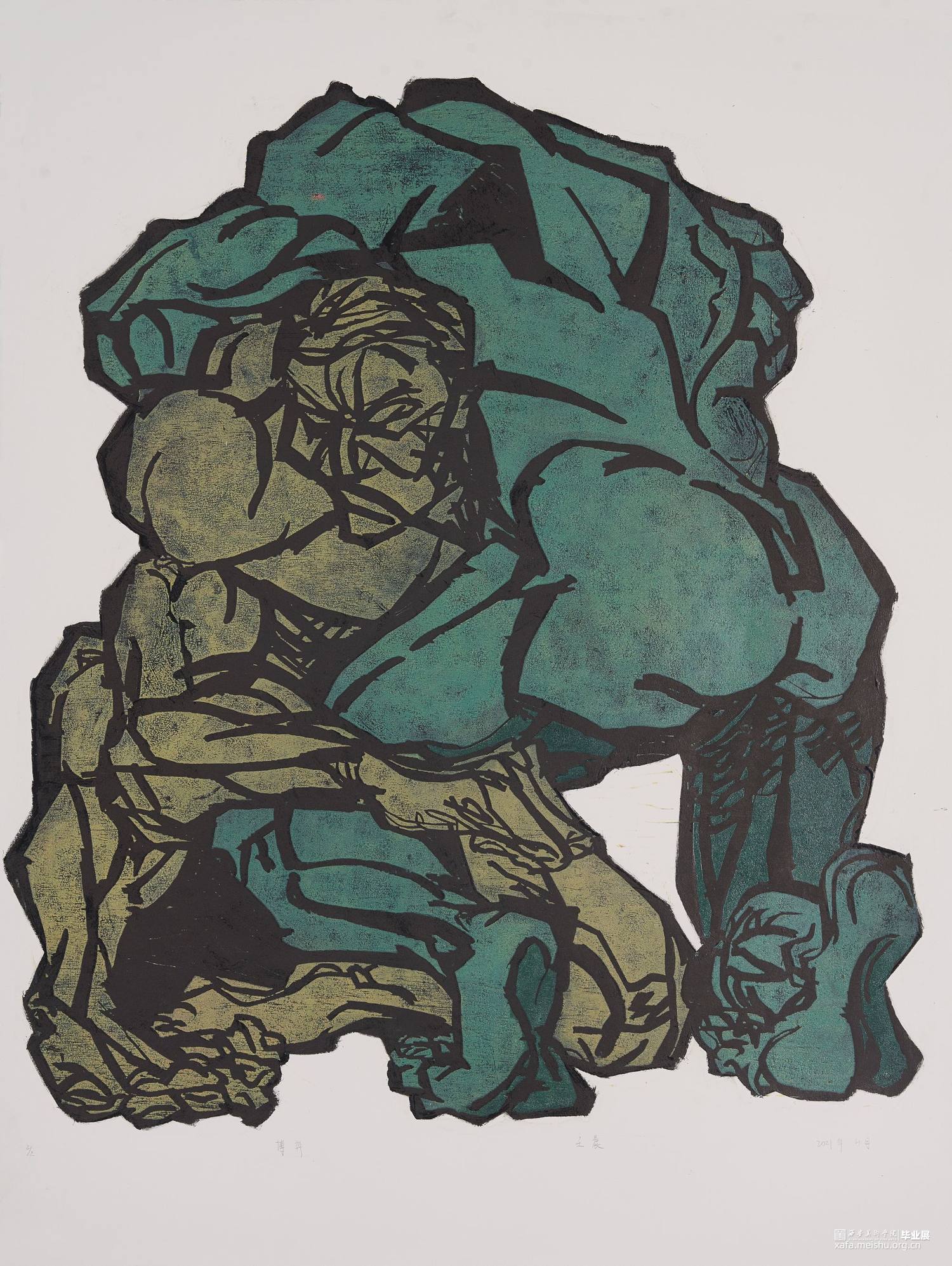 使用套色木刻技法表达搏击中压抑扭曲的人体造型。