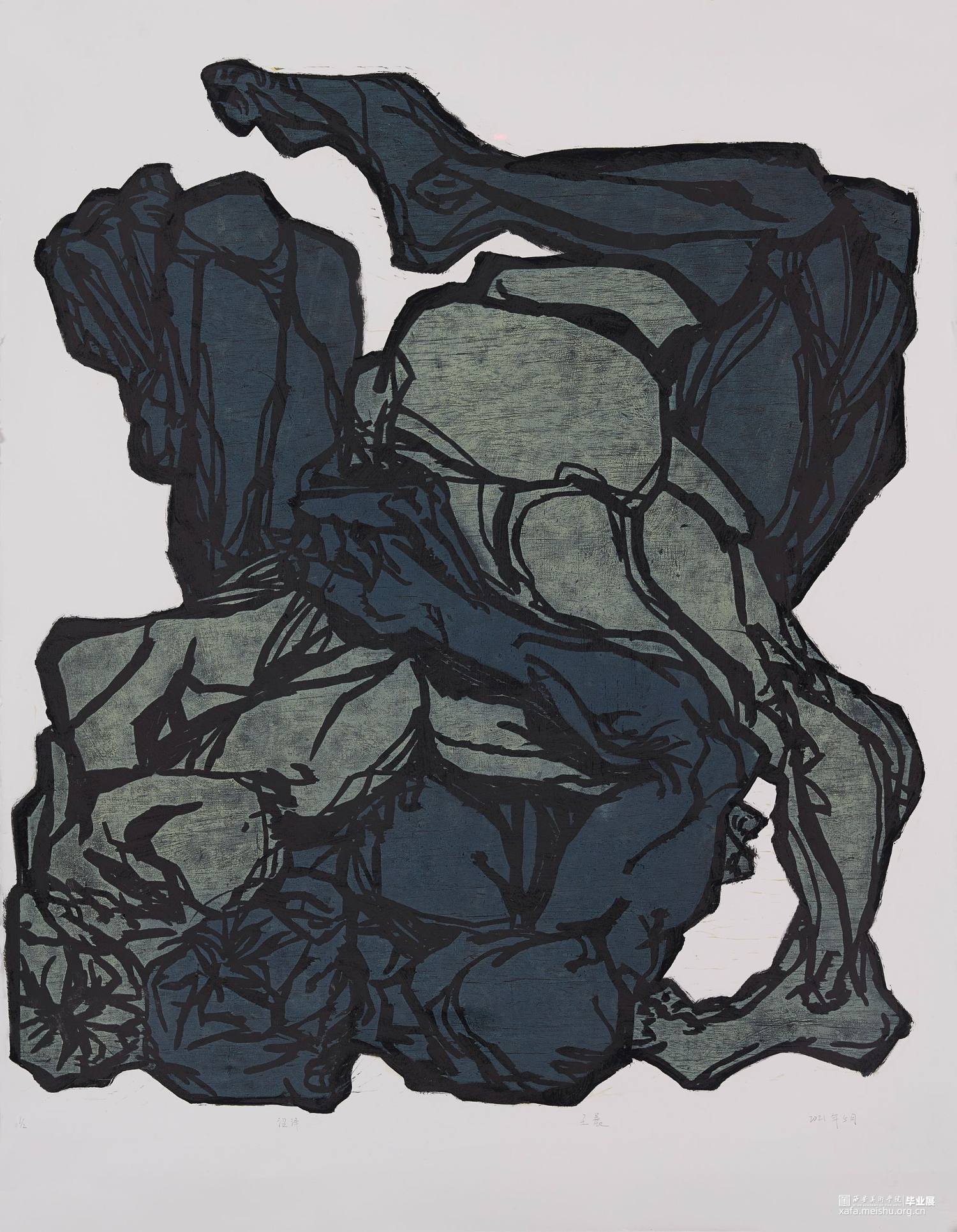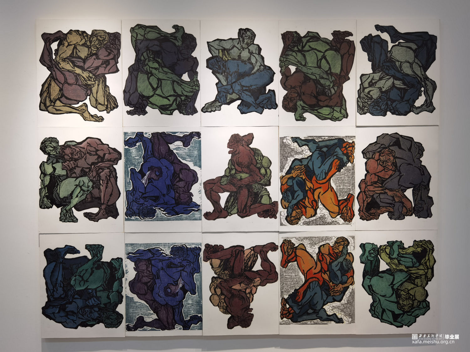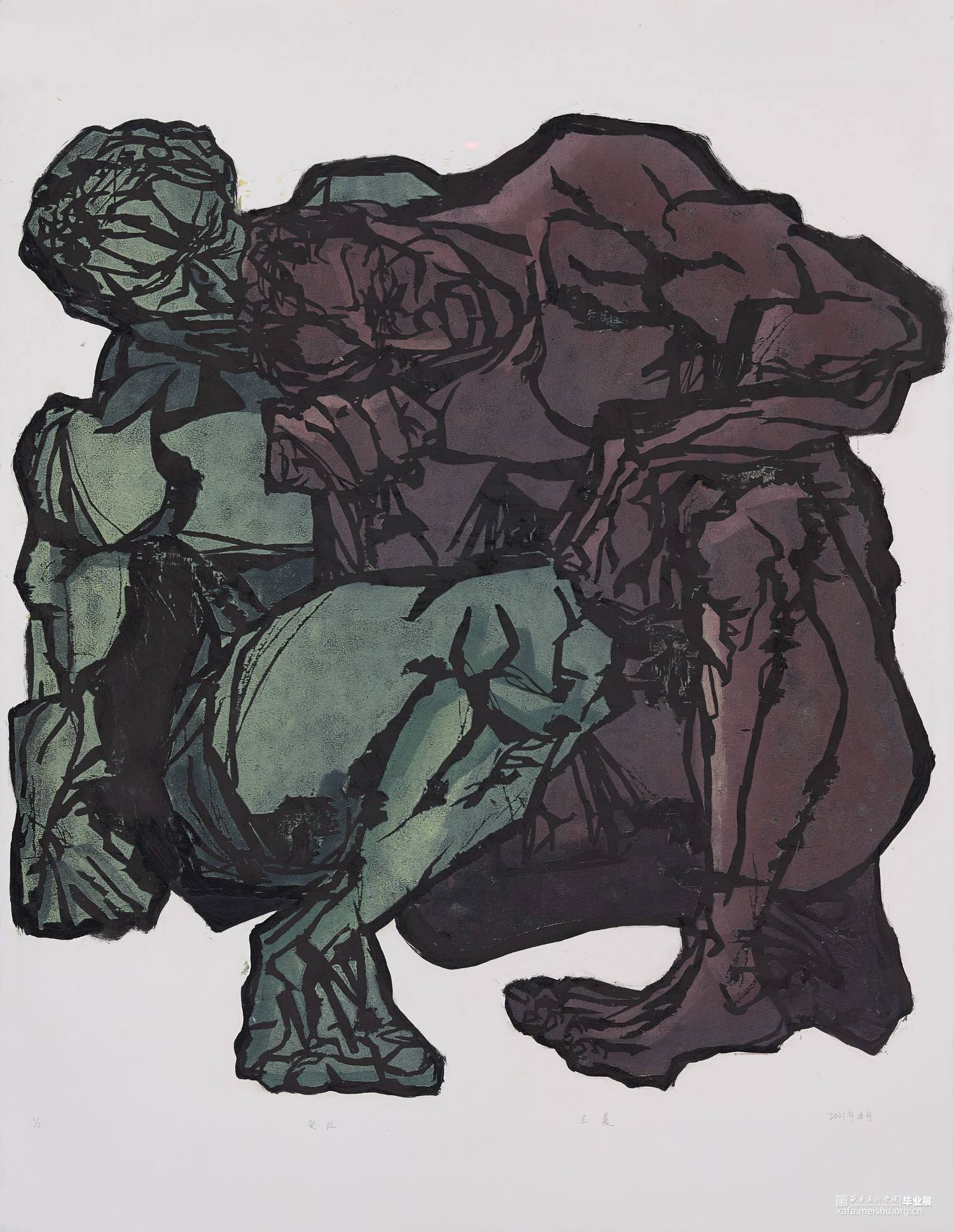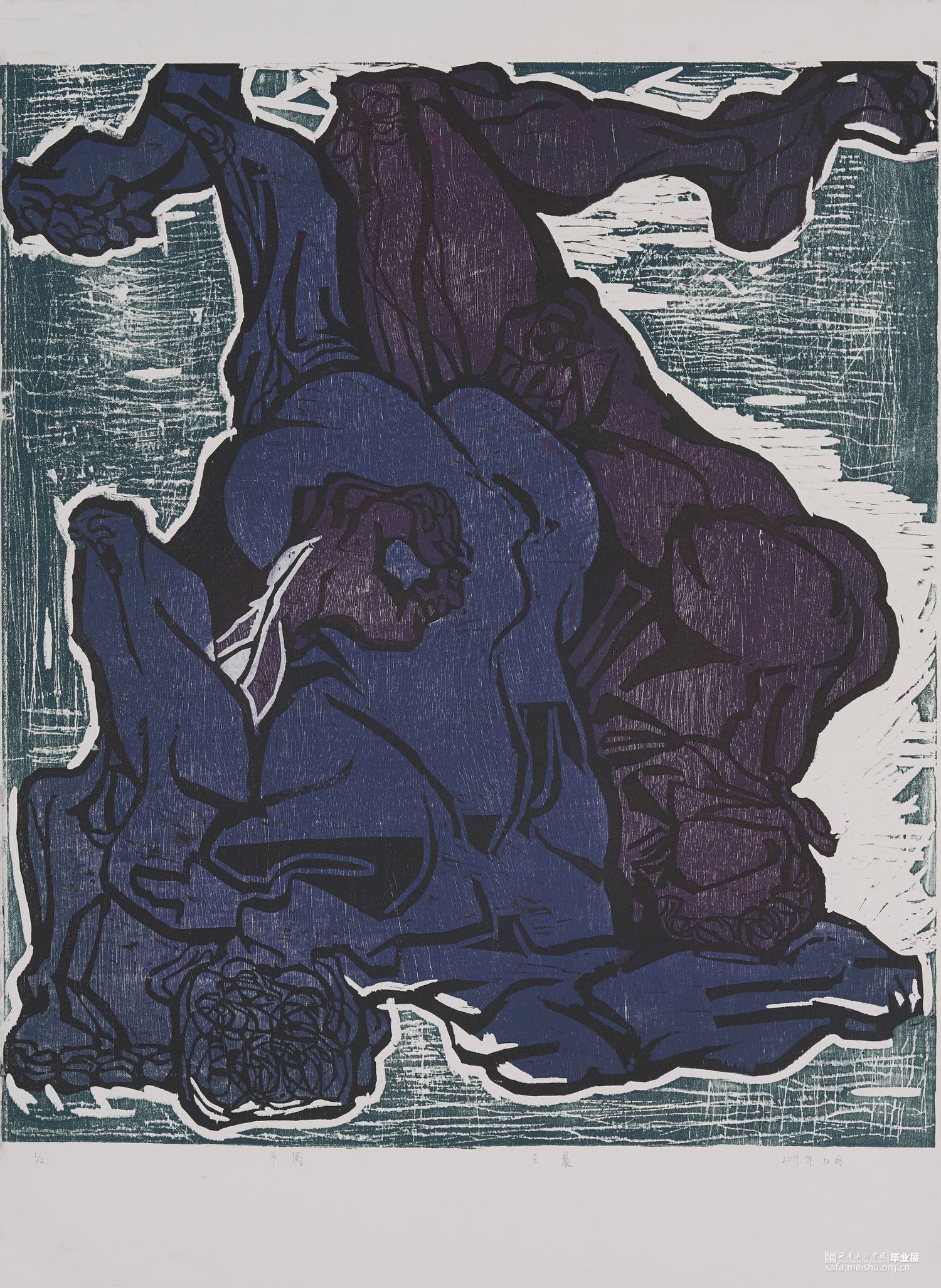 使用套色木刻技法表达搏击中压抑扭曲的人体造型。