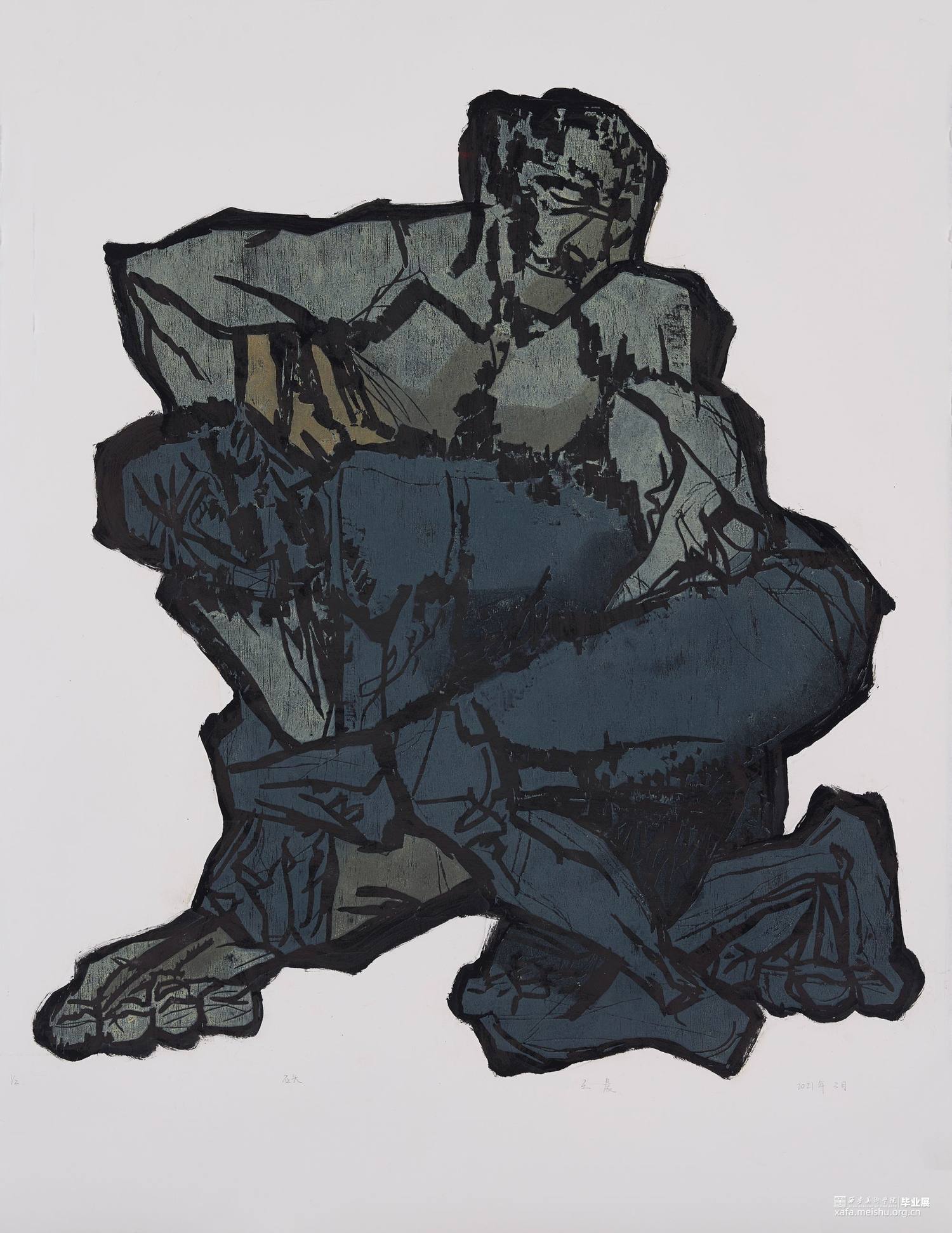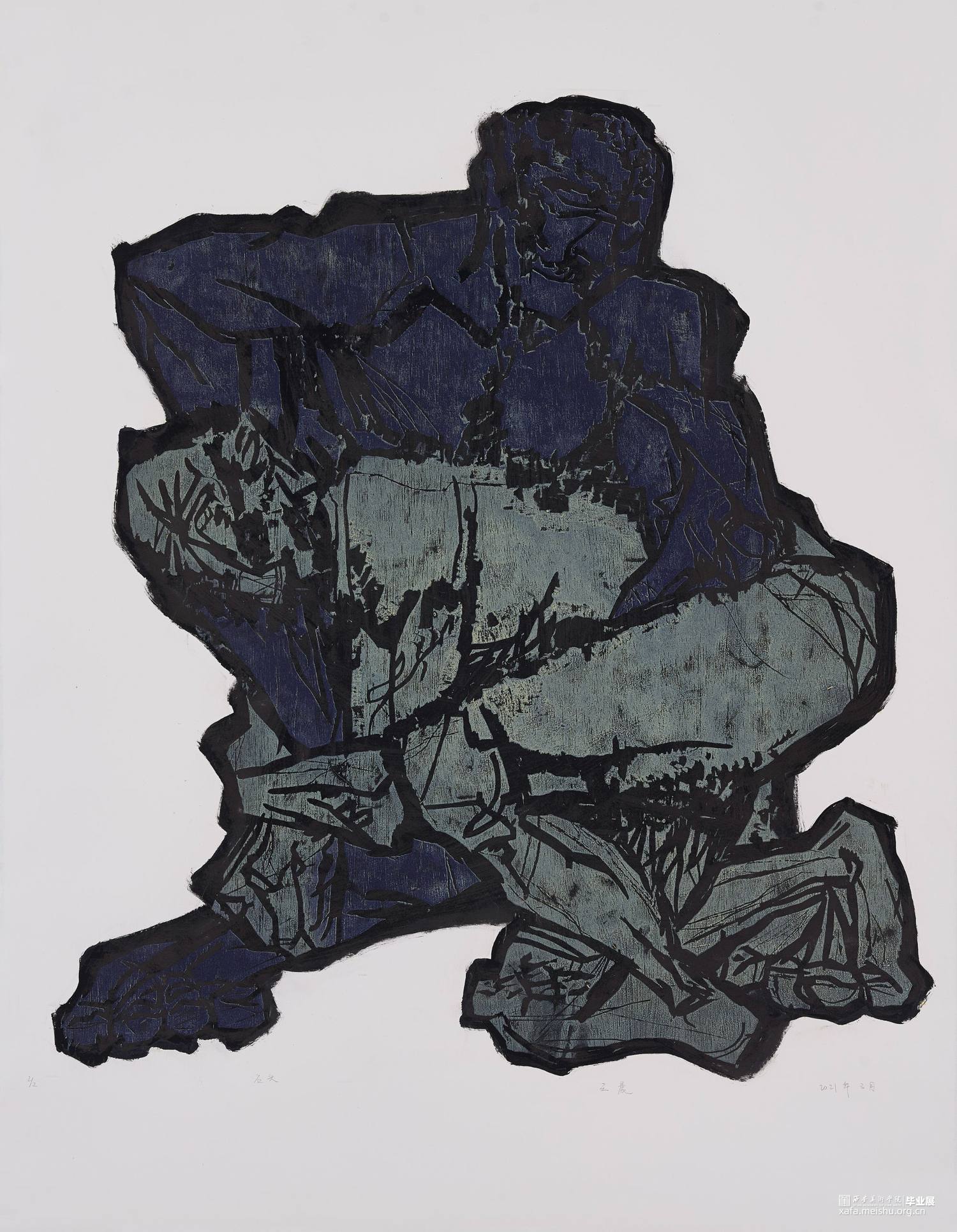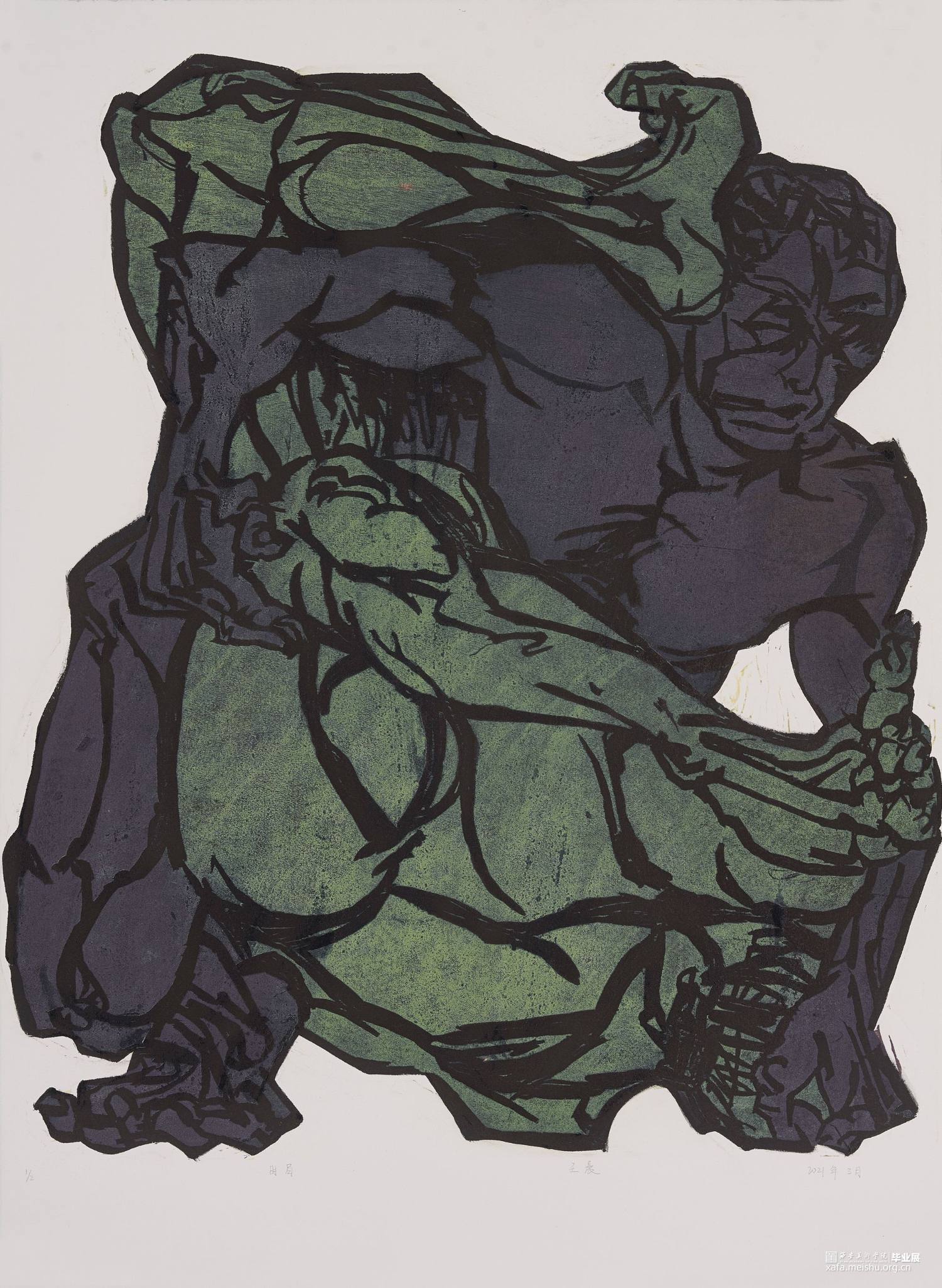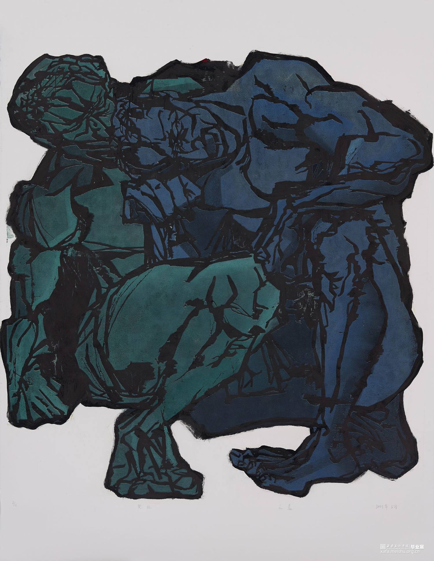 使用套色木刻技法表达搏击中压抑扭曲的人体造型。