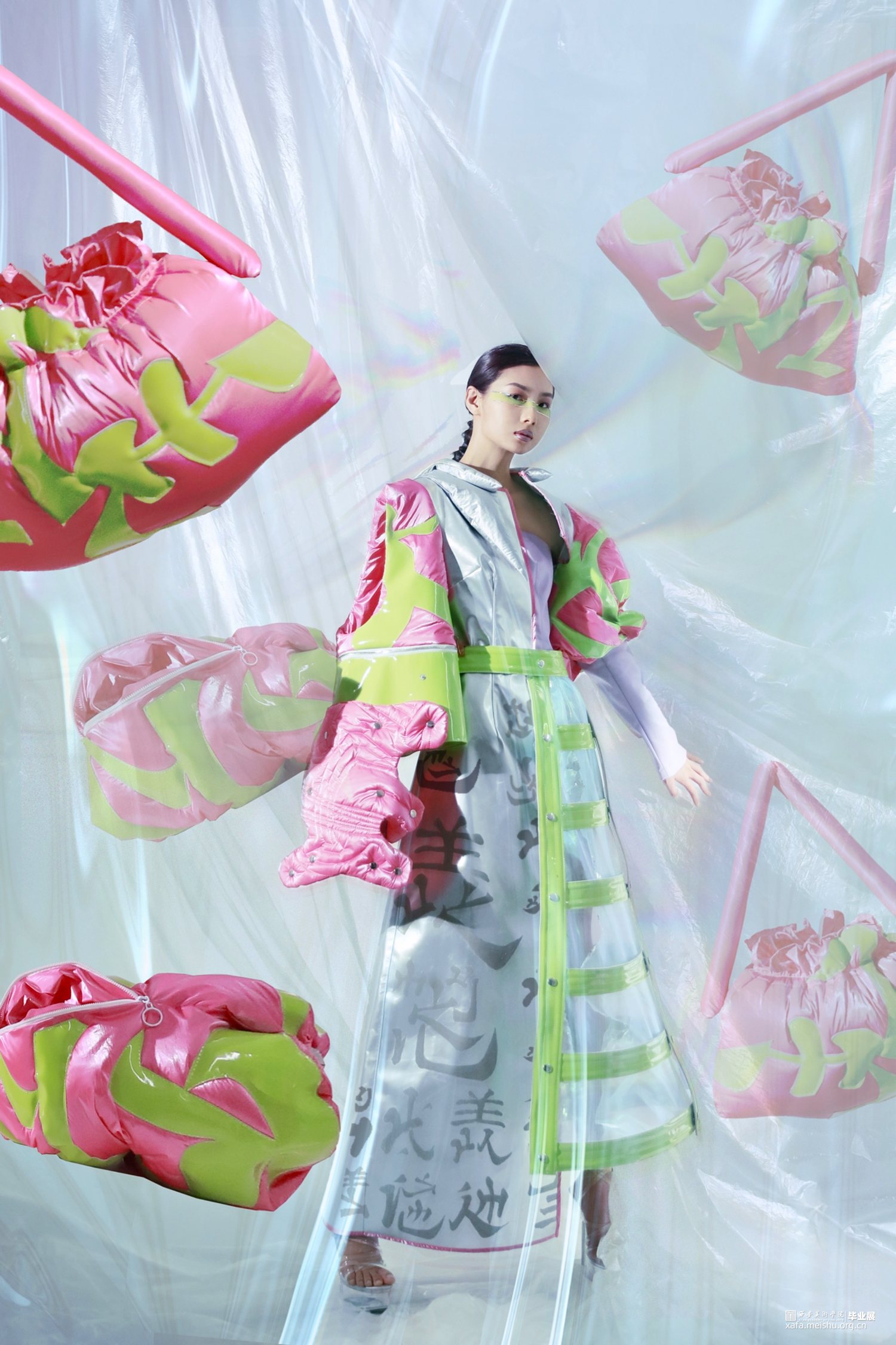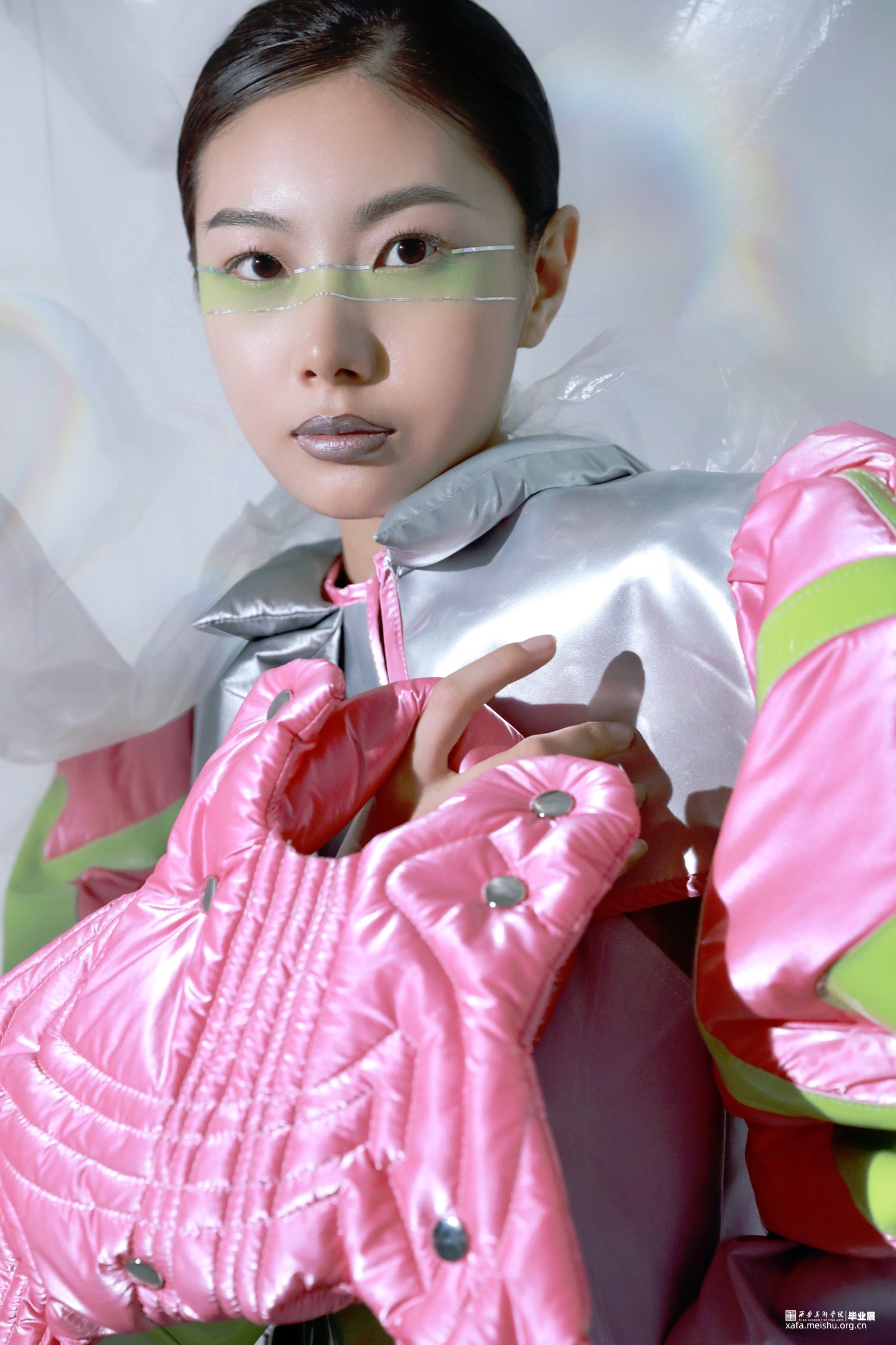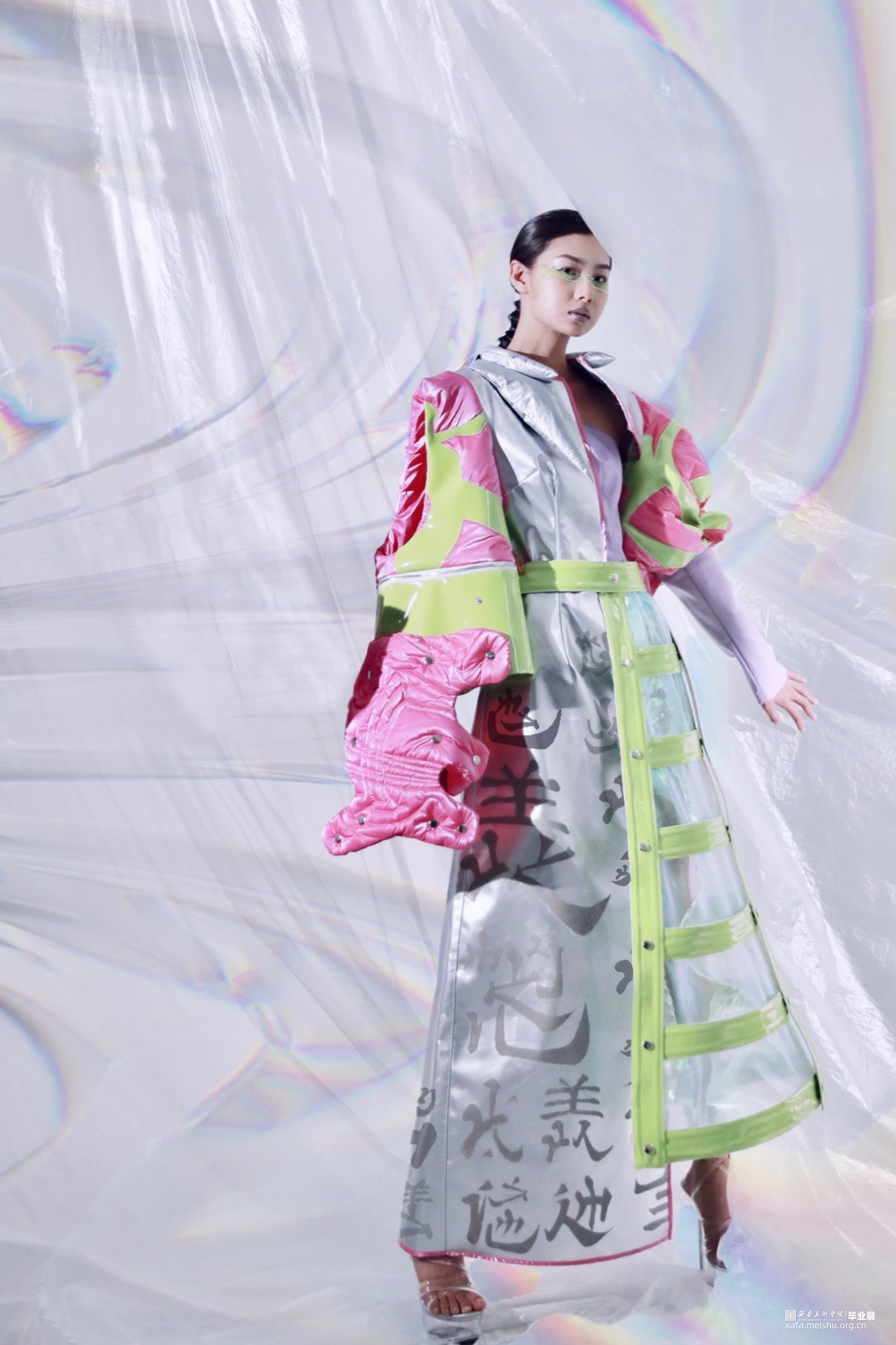 以《石台孝经碑》为研究例,通过对碑体的物质形态与文化内涵进行解构,将创新解构手法延伸融入至服饰解构运用中。解构主义从哲学和建筑的条块中被引进到时装界,此次在探究服饰解构主义设计应用时,回归到哲学和建筑中寻找新的解构手法。唐玄宗李隆基将“以孝治天下”的思想雕刻在《石台孝经碑》上以示天下,无论立足于书法、建筑、哲学等角度,《石台孝经碑》都是非常值得细细研究的对象。此次《云泥》系列服饰设计将《石台孝经碑》多角度解构重组突出局部重点,将解构手法运用在服装局部解构为服饰配件之上,将一物多用原则和功能性贯穿其中。