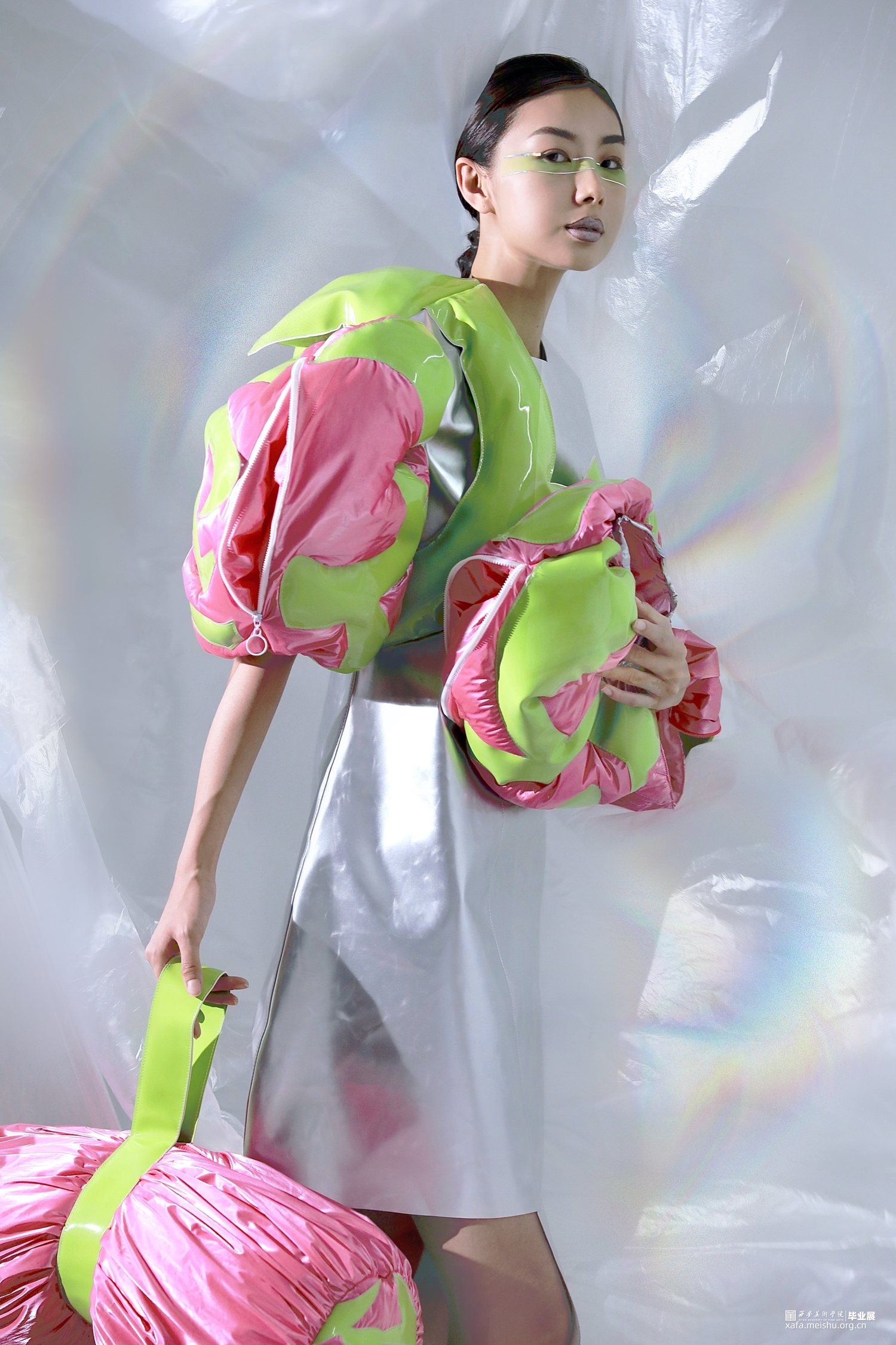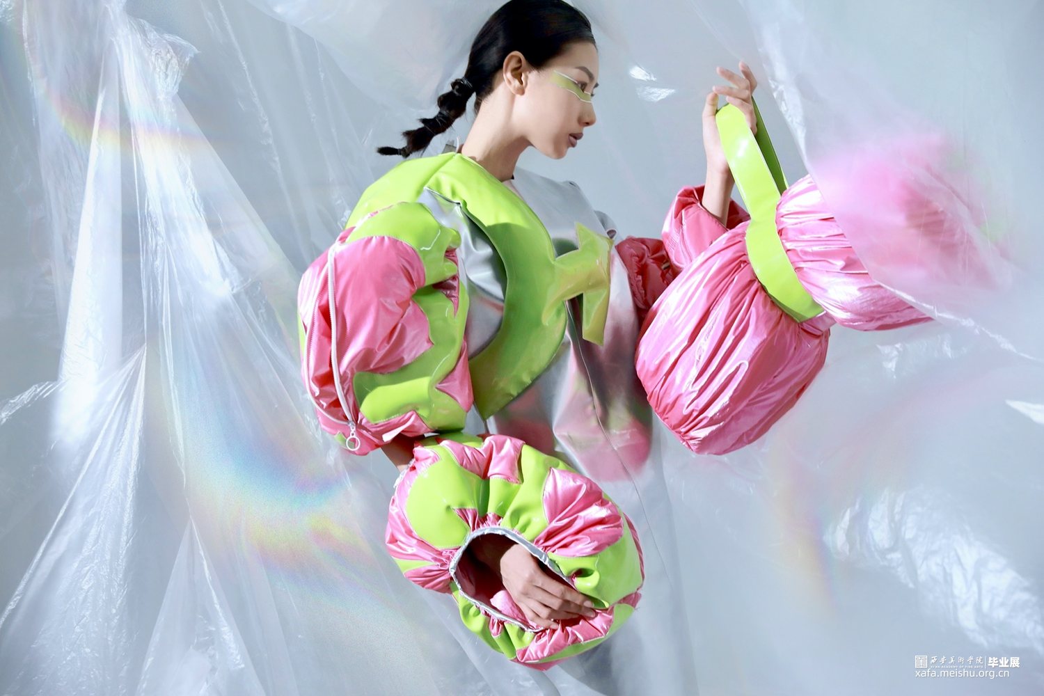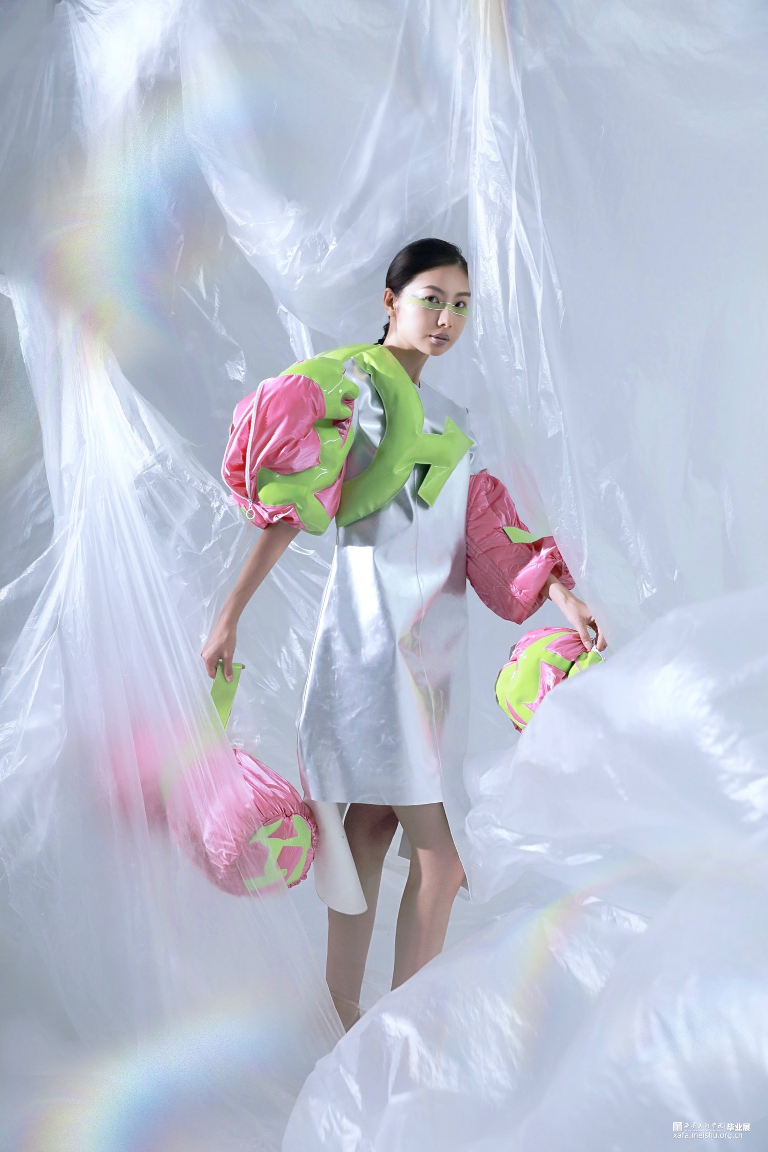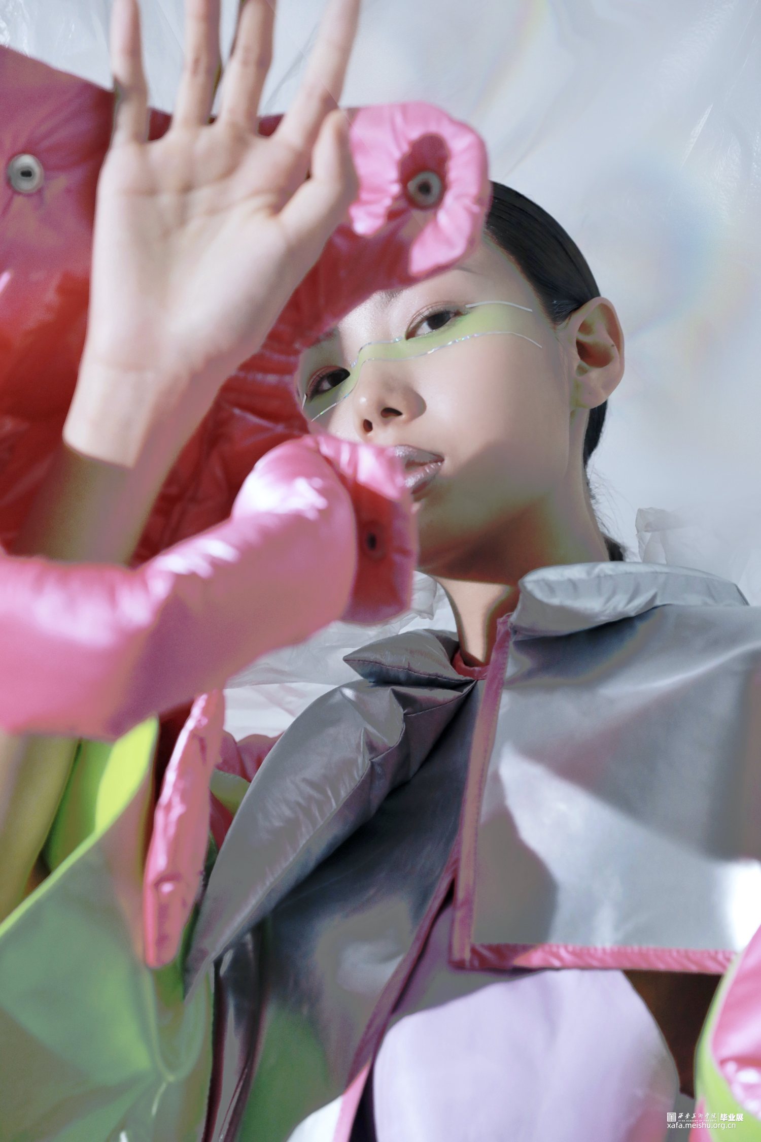 以《石台孝经碑》为研究例,通过对碑体的物质形态与文化内涵进行解构,将创新解构手法延伸融入至服饰解构运用中。解构主义从哲学和建筑的条块中被引进到时装界,此次在探究服饰解构主义设计应用时,回归到哲学和建筑中寻找新的解构手法。唐玄宗李隆基将“以孝治天下”的思想雕刻在《石台孝经碑》上以示天下,无论立足于书法、建筑、哲学等角度,《石台孝经碑》都是非常值得细细研究的对象。此次《云泥》系列服饰设计将《石台孝经碑》多角度解构重组突出局部重点,将解构手法运用在服装局部解构为服饰配件之上,将一物多用原则和功能性贯穿其中。