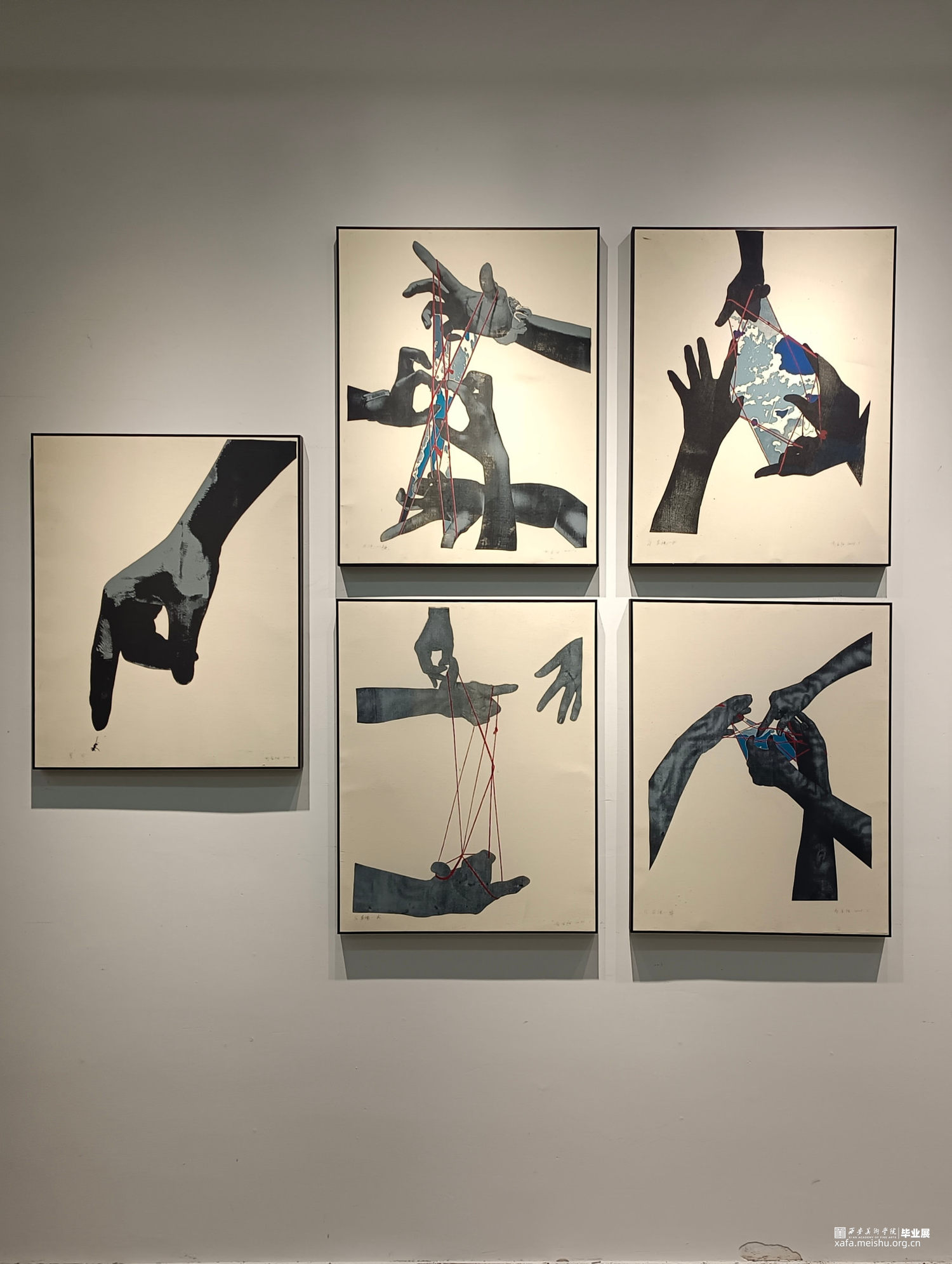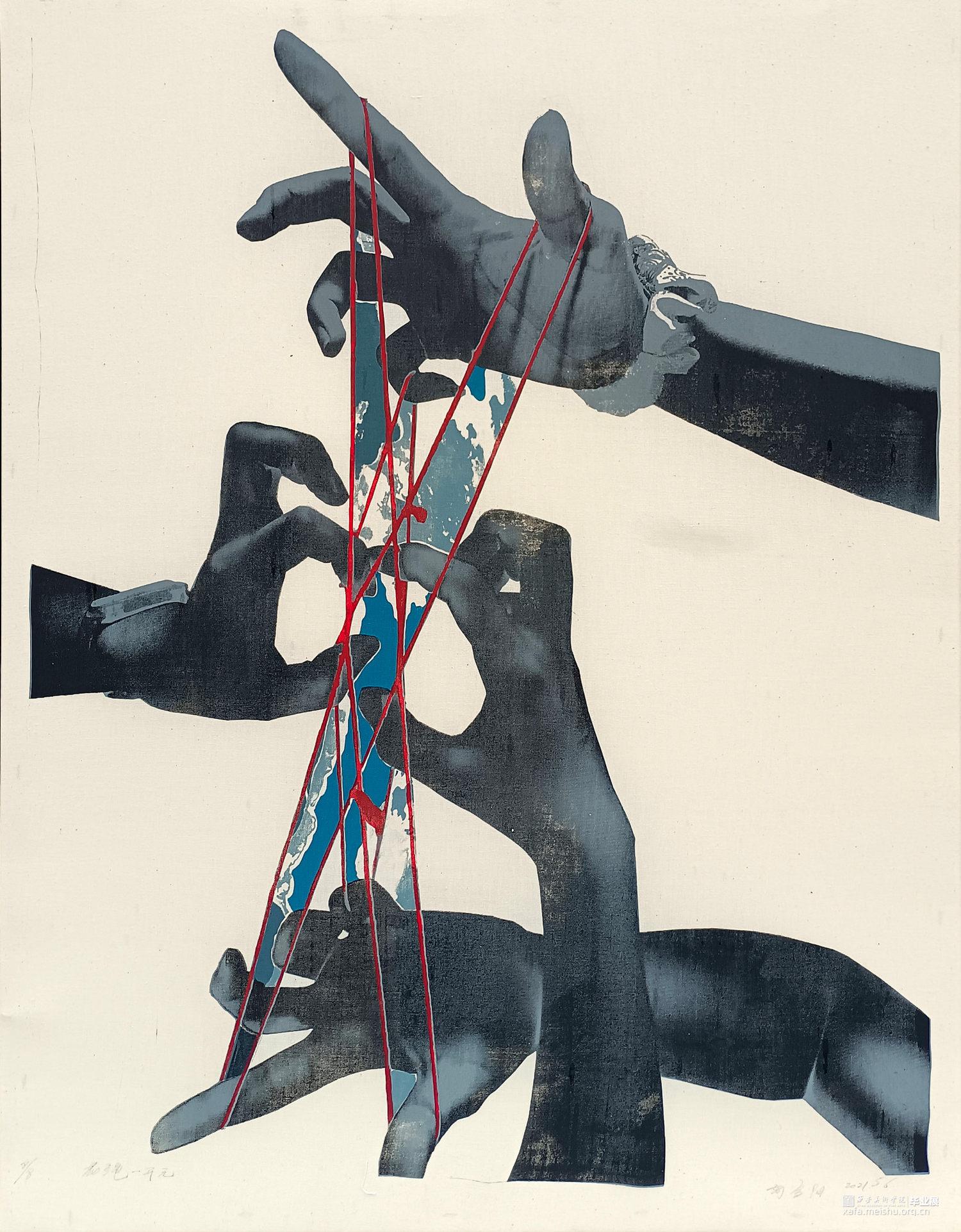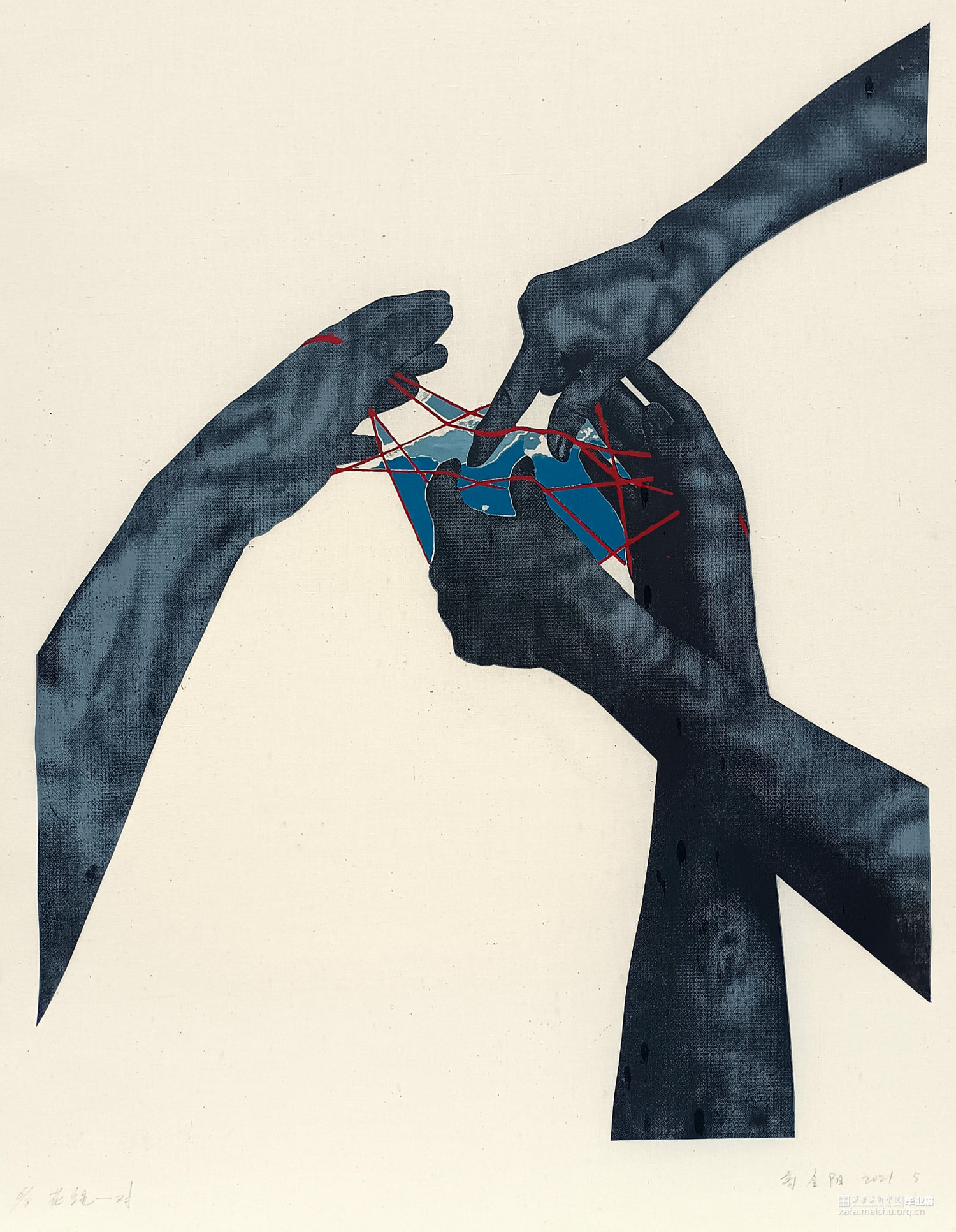 《花绳》这组作品源自童年时期的游戏,用双手来表现内心的情绪。那一根红色毛线绳或许是每个人内心都有的纯真,随着年龄的变化对这个游戏有了不同的认知,很容易的为双手操纵的线赋予其另外的内涵。作品以丝网为输出形式,印刷在布面之上,在画面之中玩游戏的两双手的不同形态,于游戏的进程所对应。作品之中用黑灰色的手与鲜艳的红绳之间对比构成作品的气息。在花绳系列的弈·接·化三副里都有一片蓝天白云,白云的空间有少年时期对于自由美好的期盼。