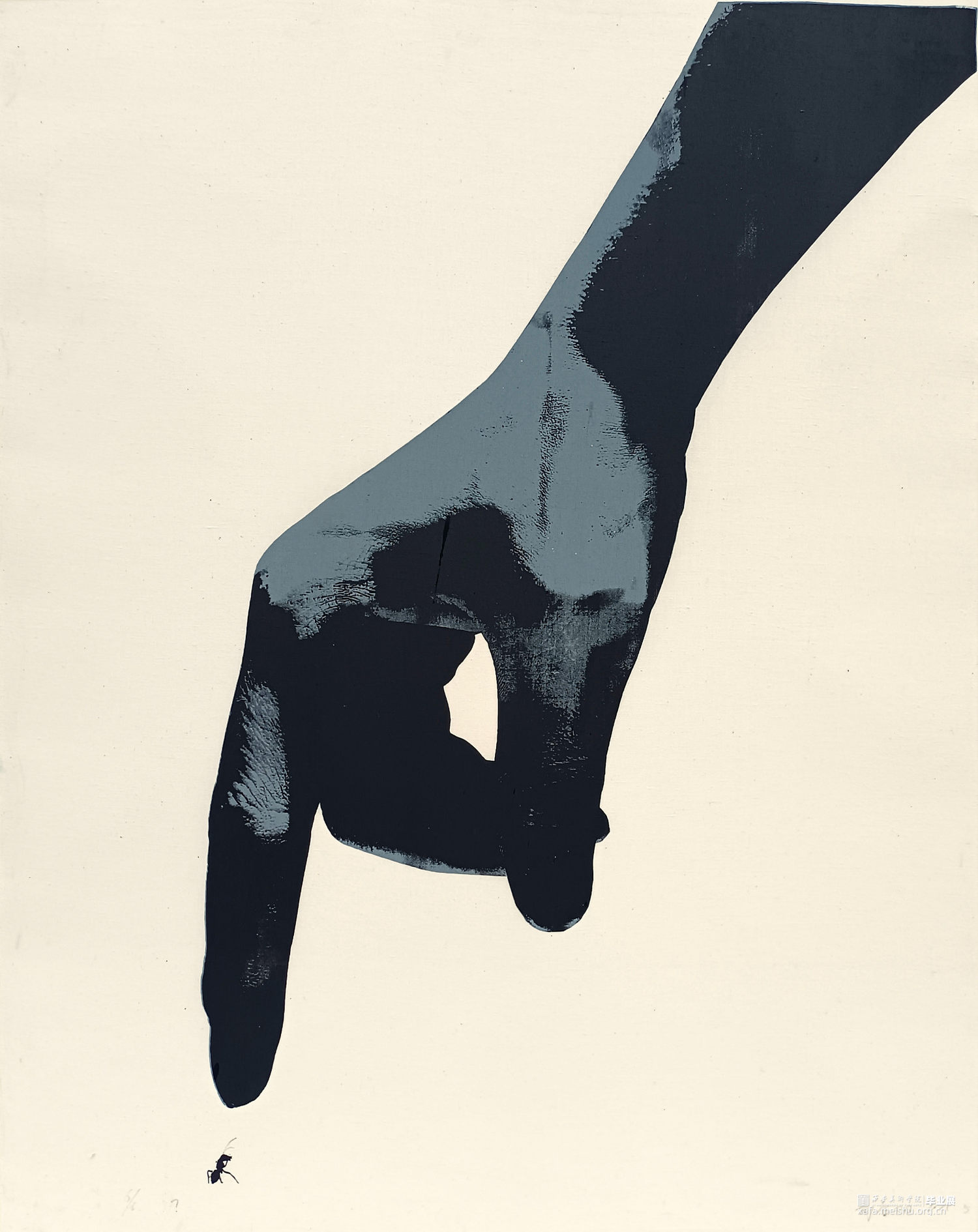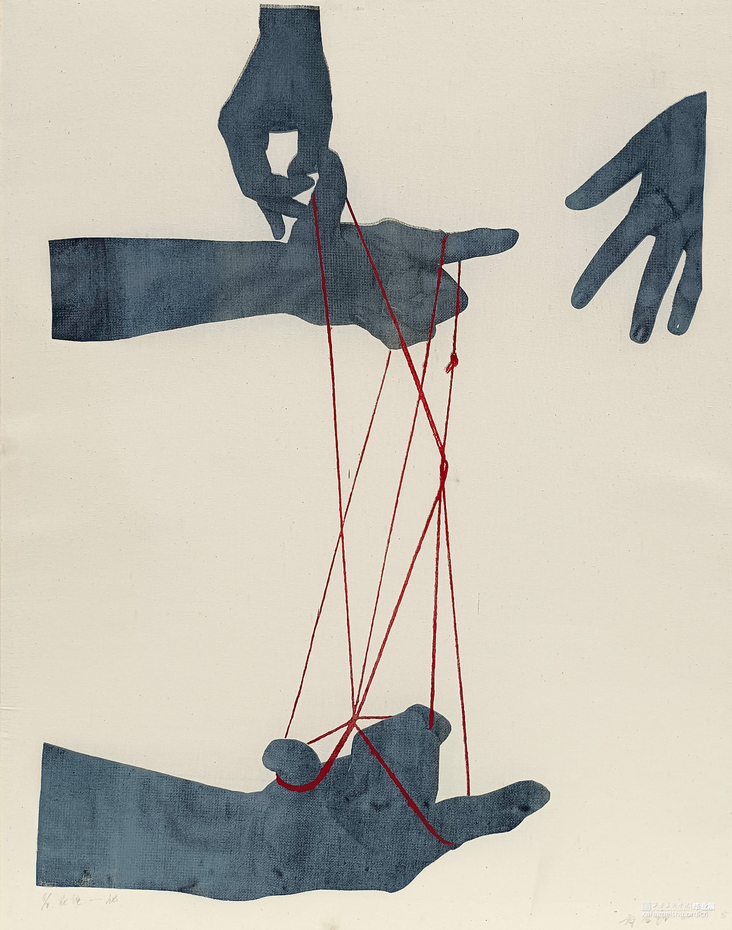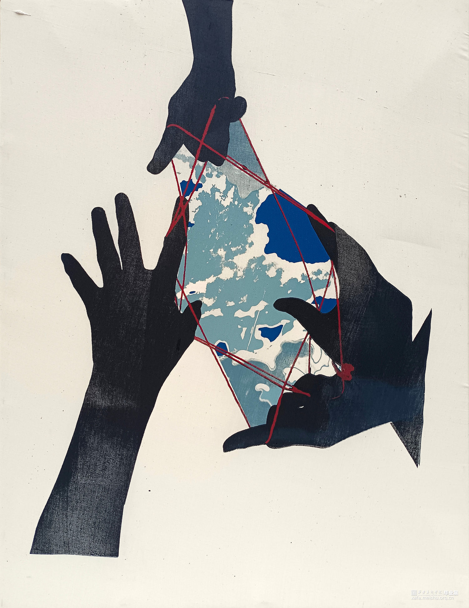 《花绳》这组作品源自童年时期的游戏,用双手来表现内心的情绪。那一根红色毛线绳或许是每个人内心都有的纯真,随着年龄的变化对这个游戏有了不同的认知,很容易的为双手操纵的线赋予其另外的内涵。作品以丝网为输出形式,印刷在布面之上,在画面之中玩游戏的两双手的不同形态,于游戏的进程所对应。作品之中用黑灰色的手与鲜艳的红绳之间对比构成作品的气息。在花绳系列的弈·接·化三副里都有一片蓝天白云,白云的空间有少年时期对于自由美好的期盼。