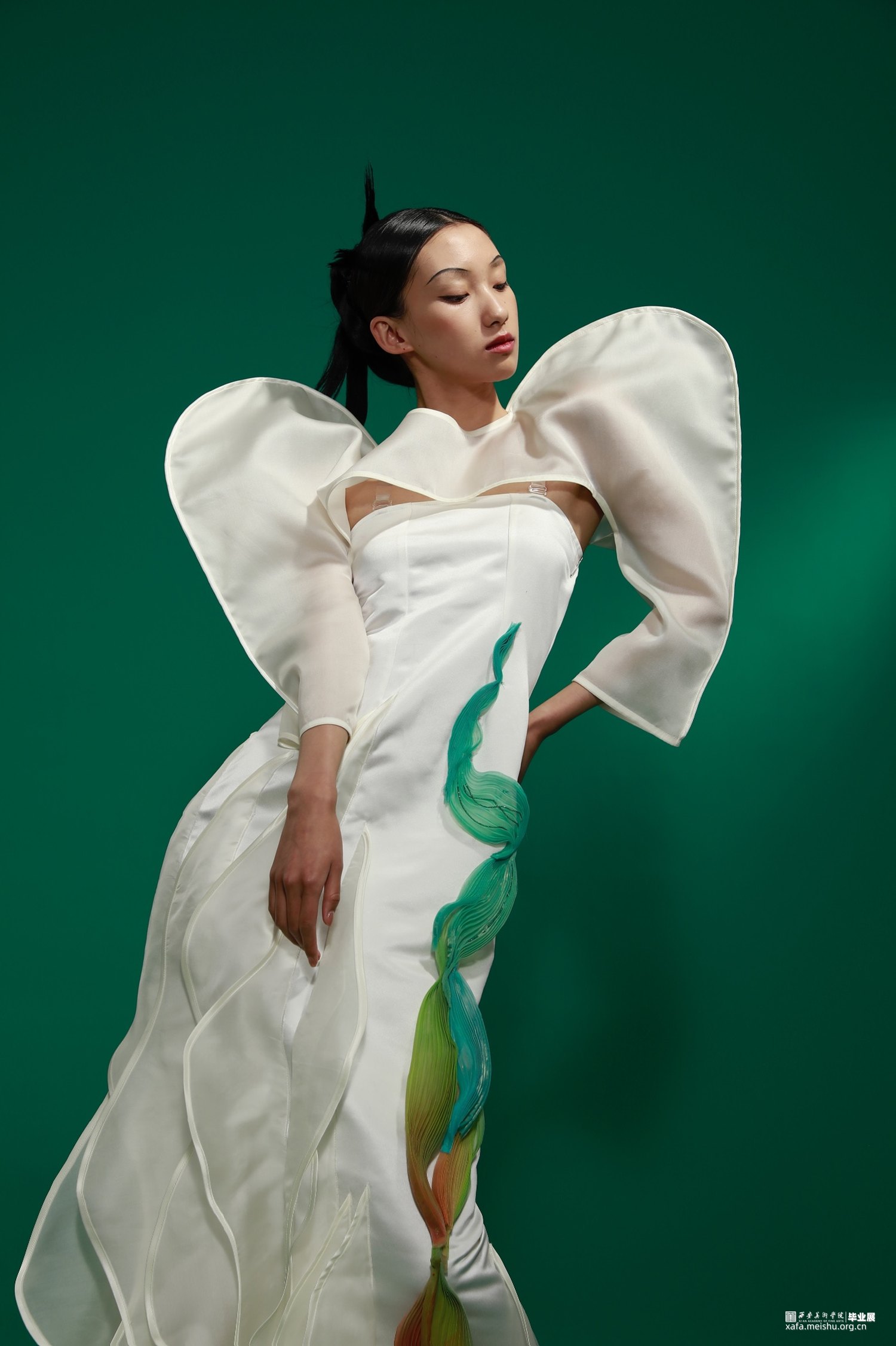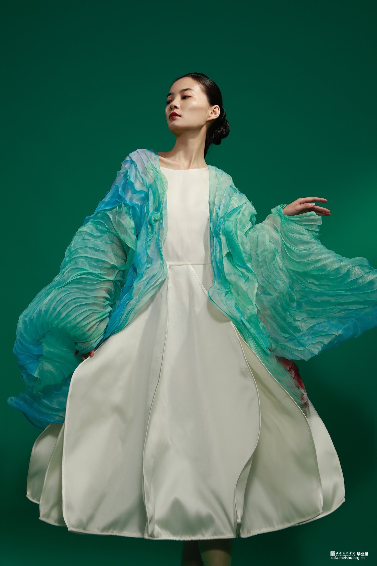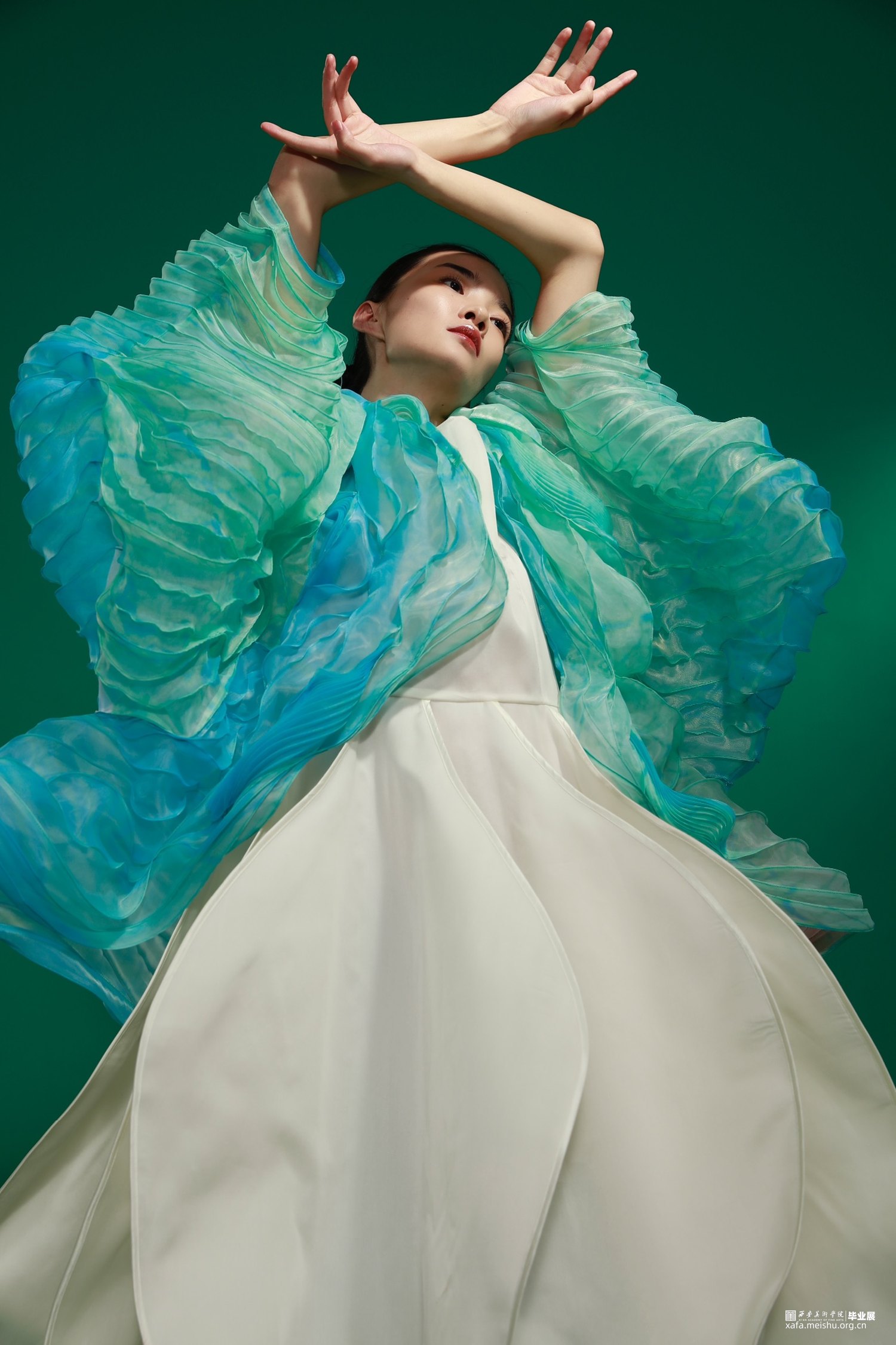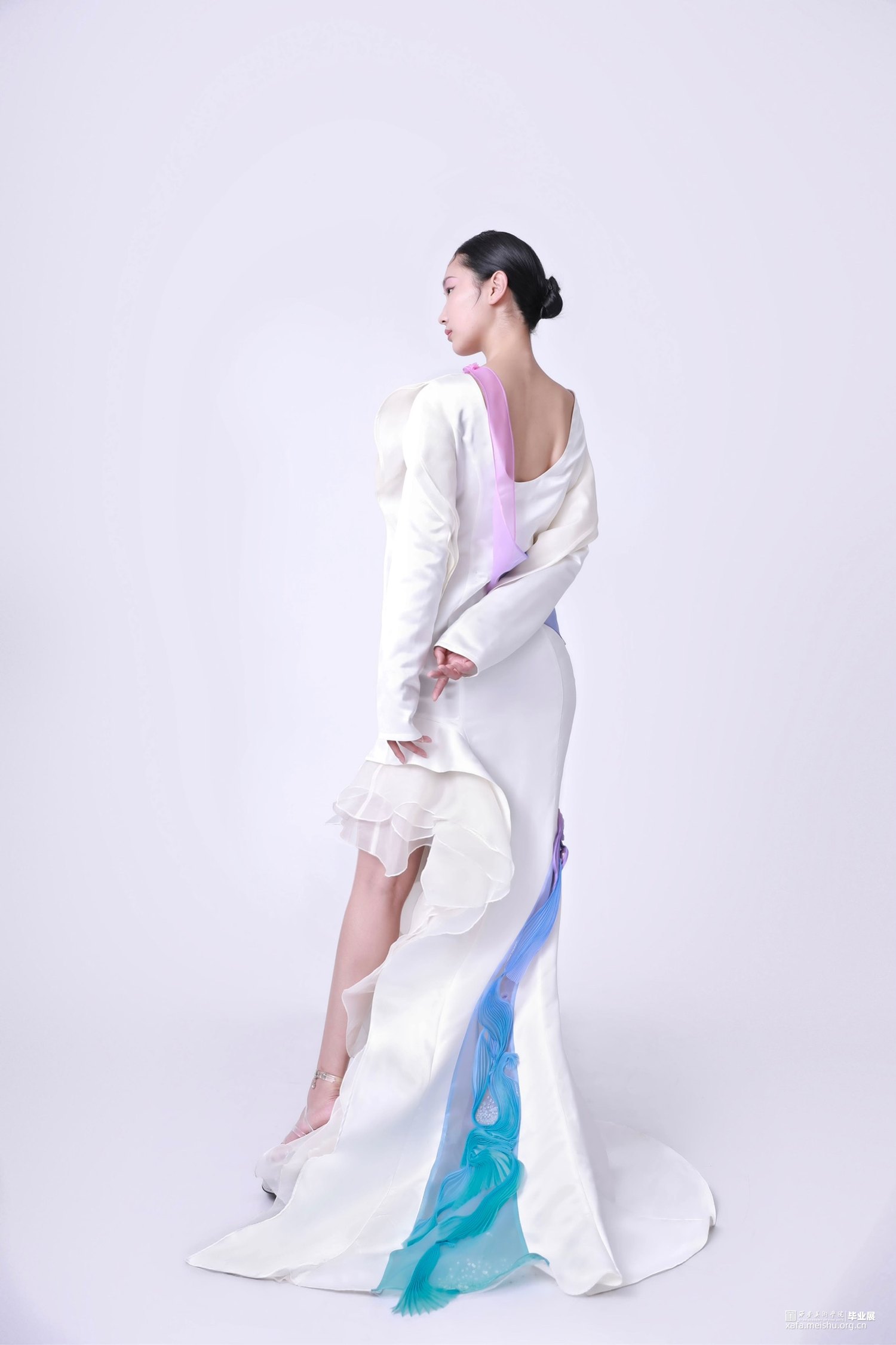 唐的盛世使唐诗成为中华诗歌的最高成就。作品以唐诗《春江花月夜》为灵感。从其关注自然、情感与哲学的思考中获得启发,通过研究与分析,将诗中的审美意象具像化的运用到现代创意服装之中,通过作品传达出传统与时尚相互冲撞、融合的设计理念,再现唐时代的优美与灿烂。