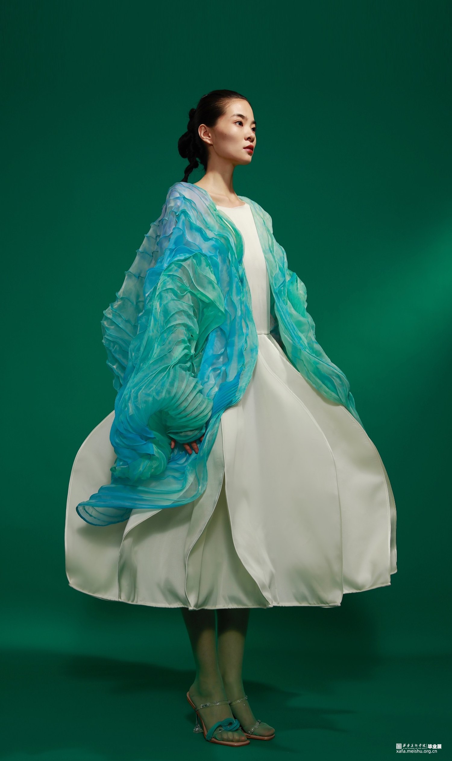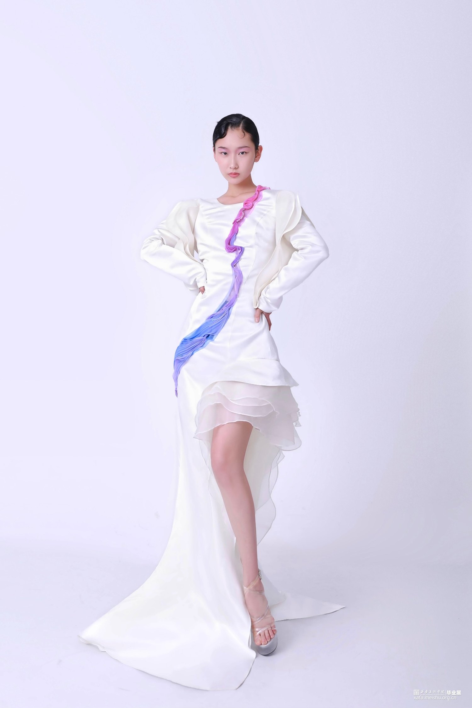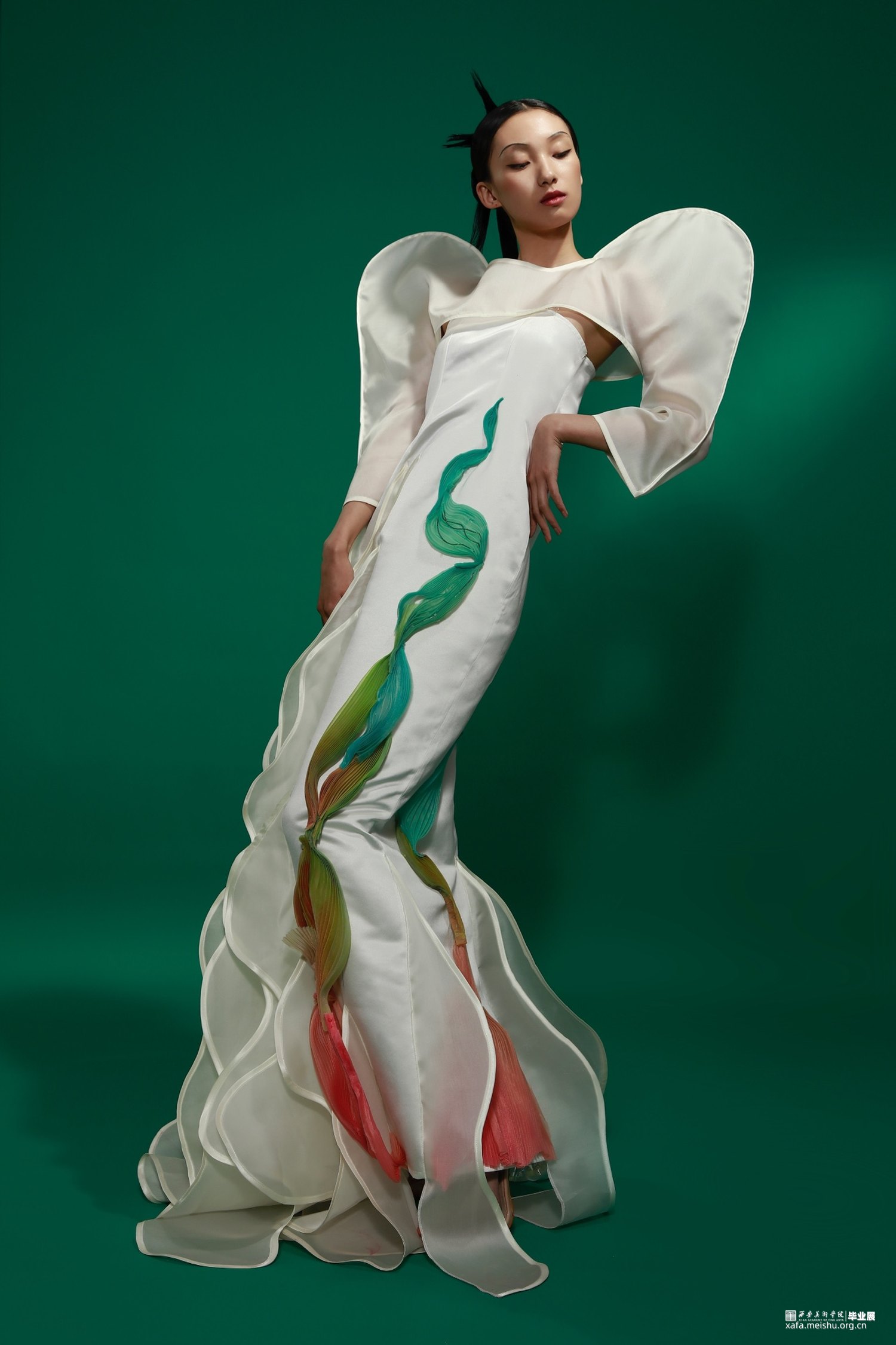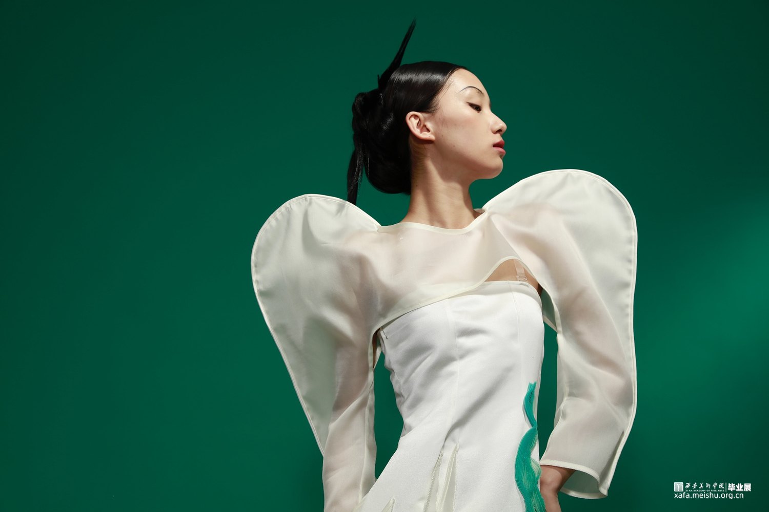 唐的盛世使唐诗成为中华诗歌的最高成就。作品以唐诗《春江花月夜》为灵感。从其关注自然、情感与哲学的思考中获得启发,通过研究与分析,将诗中的审美意象具像化的运用到现代创意服装之中,通过作品传达出传统与时尚相互冲撞、融合的设计理念,再现唐时代的优美与灿烂。