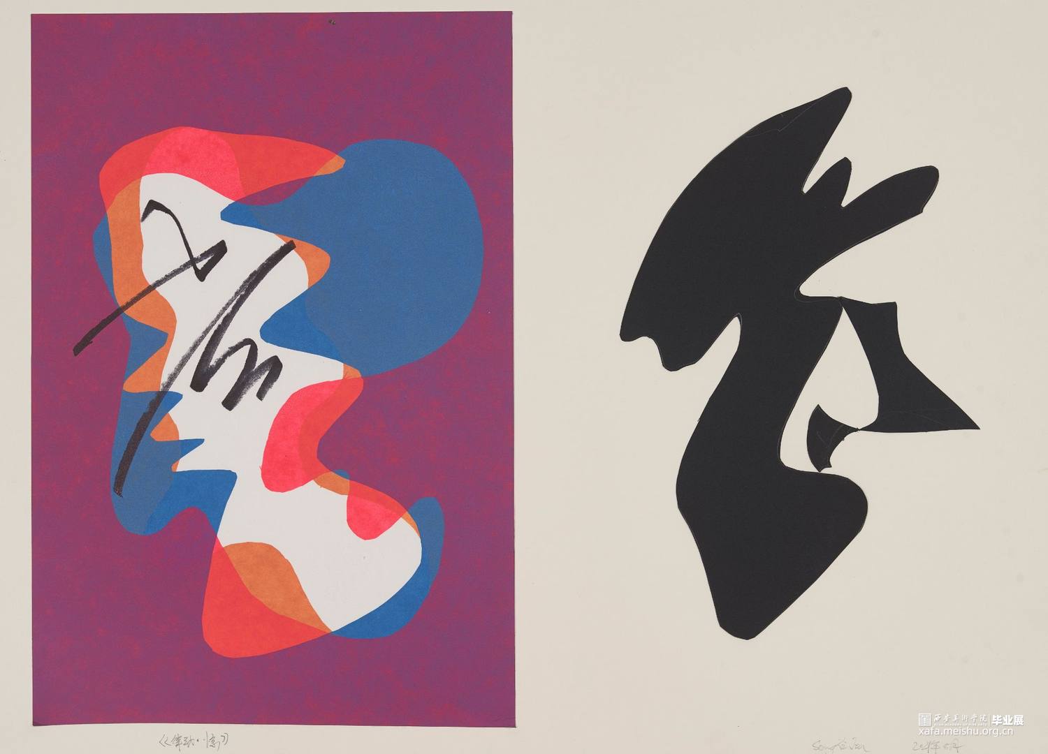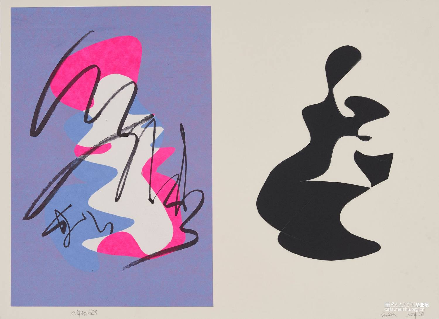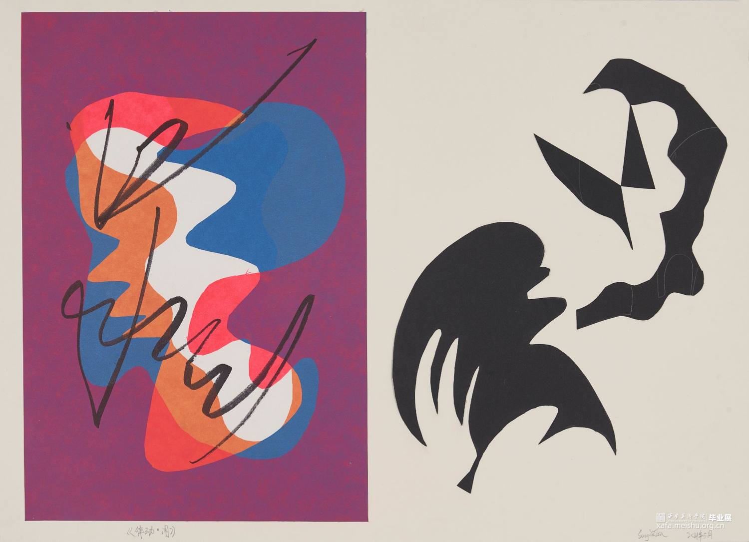 人们常常在无意识的驱动下,无论是线条的描绘或是颜色的选择,都暴露出来每个人自出生以来不断丰富的潜意识,从家庭背景、伦理观念、宗教信仰等等,都在不经意间影响着我们的选择和判断。《律动》通过手绘、丝网印刷、以及通过剪纸拼贴组合的方式来呈现。创作吸收了从广东来到西安后的所见所闻,从随机创作的课堂到文化考察剪纸方式以及对马蒂斯粗浅的研究等形成一个属于自己的体系。创作过程中,通过不断的记录观察,将数据记录下来而后加以利用,看似随机的背后也有一定的规律,在感性和理性之间来回转换,在持续刺激自己对画面的思考的过程中,不断完善自己的画面的同时来完善自己的思考方式。