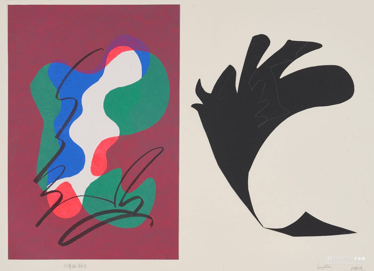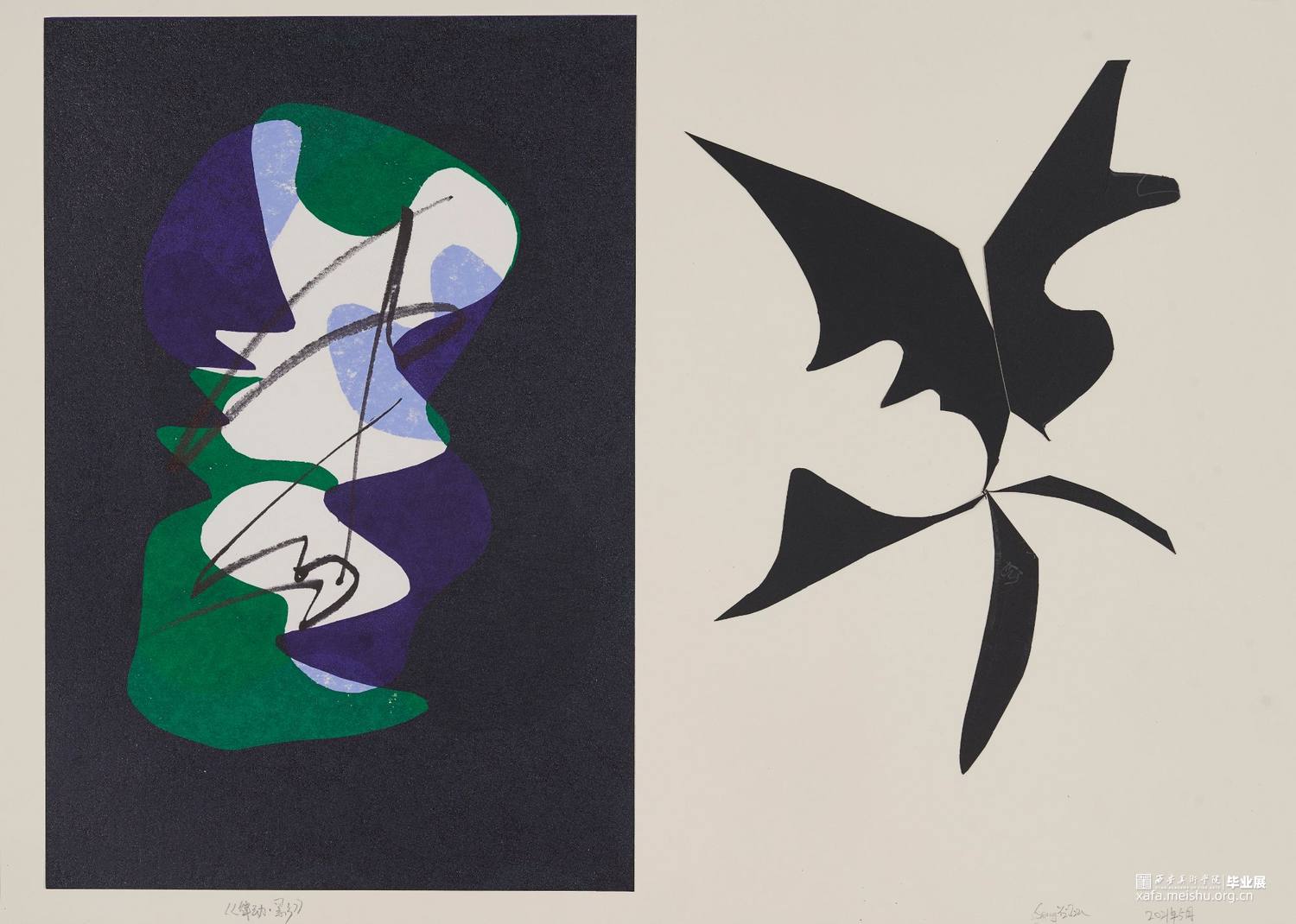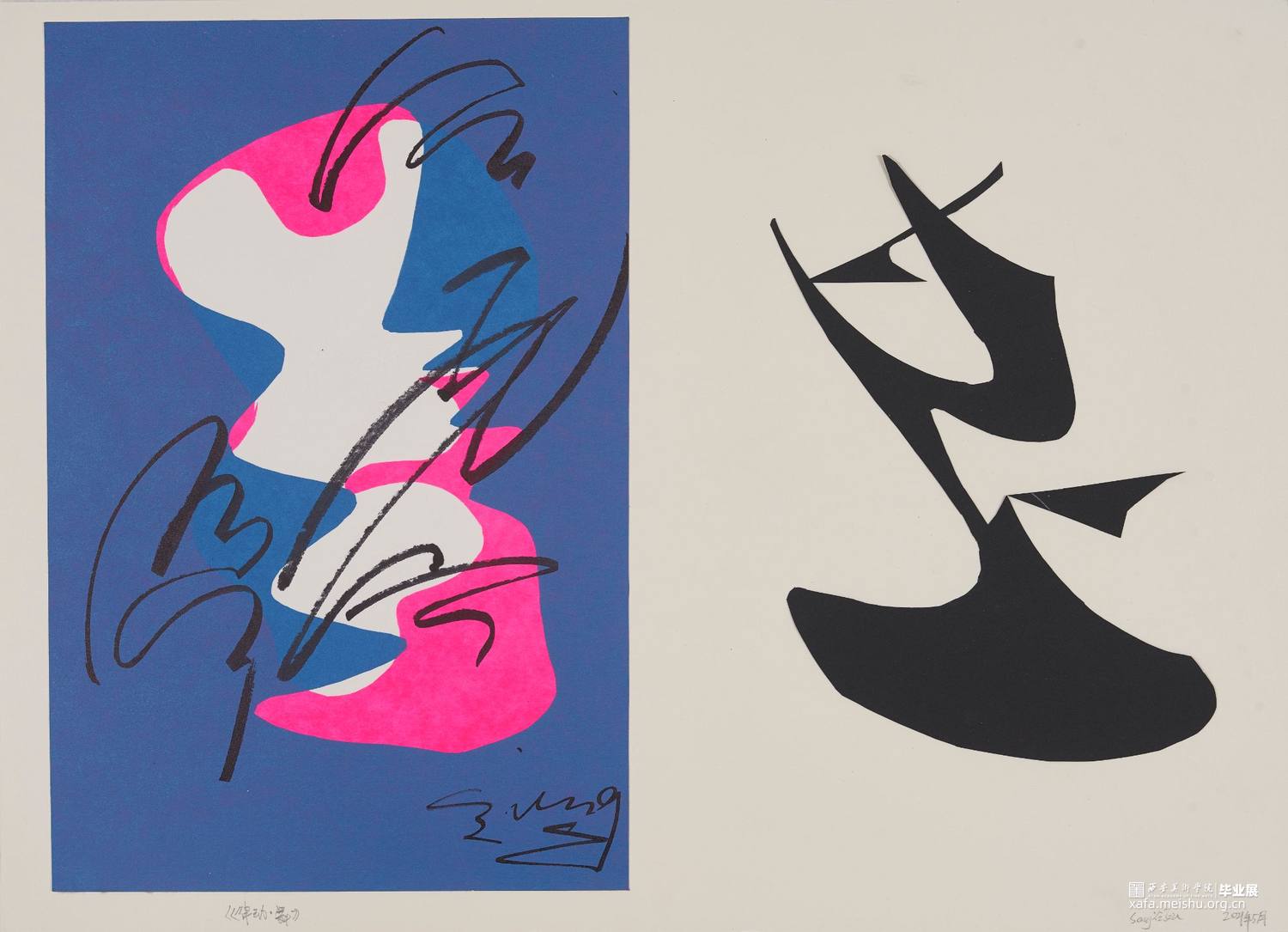 人们常常在无意识的驱动下,无论是线条的描绘或是颜色的选择,都暴露出来每个人自出生以来不断丰富的潜意识,从家庭背景、伦理观念、宗教信仰等等,都在不经意间影响着我们的选择和判断。《律动》通过手绘、丝网印刷、以及通过剪纸拼贴组合的方式来呈现。创作吸收了从广东来到西安后的所见所闻,从随机创作的课堂到文化考察剪纸方式以及对马蒂斯粗浅的研究等形成一个属于自己的体系。创作过程中,通过不断的记录观察,将数据记录下来而后加以利用,看似随机的背后也有一定的规律,在感性和理性之间来回转换,在持续刺激自己对画面的思考的过程中,不断完善自己的画面的同时来完善自己的思考方式。