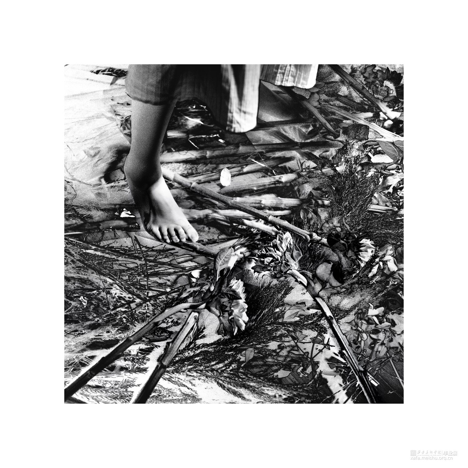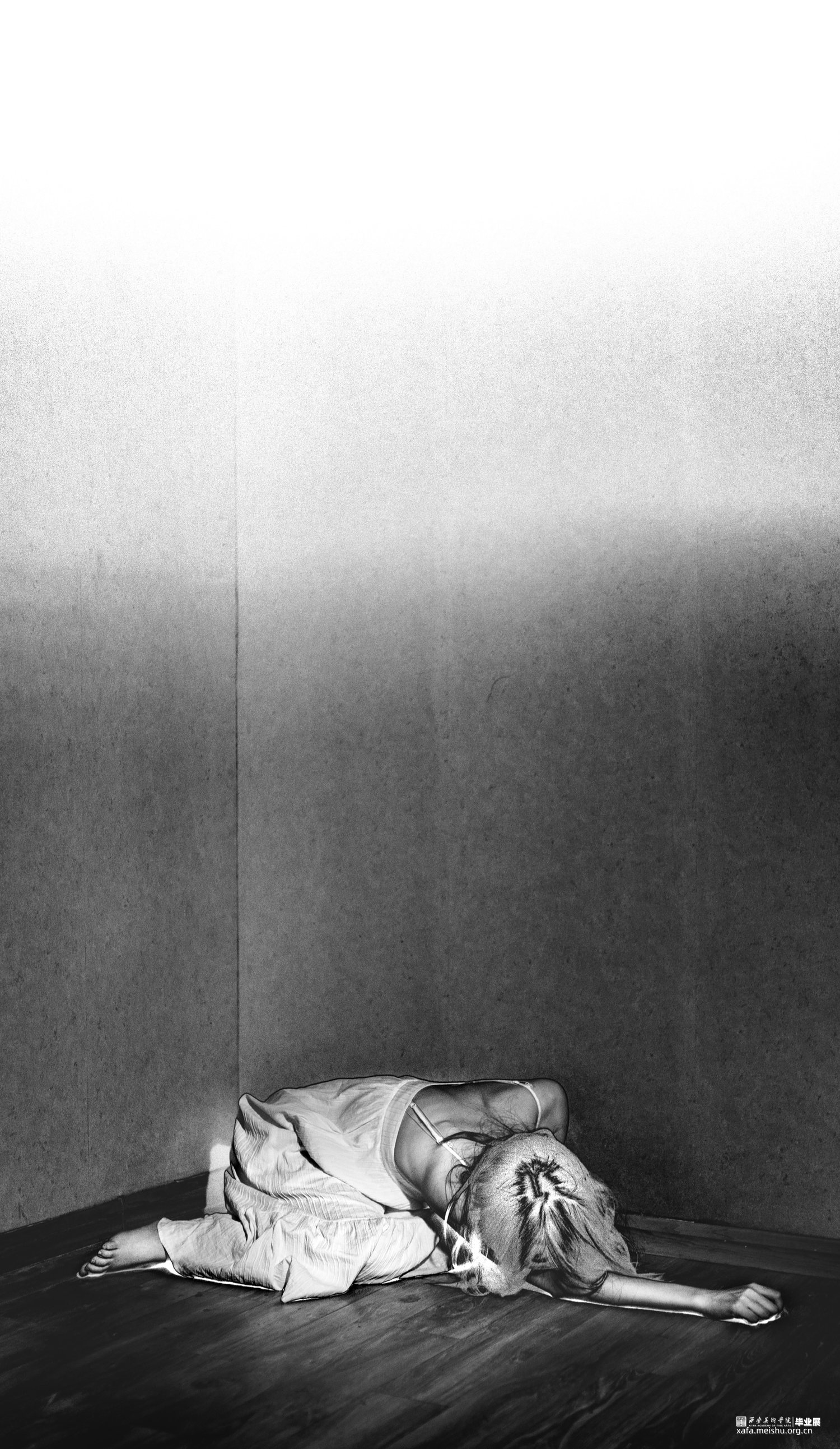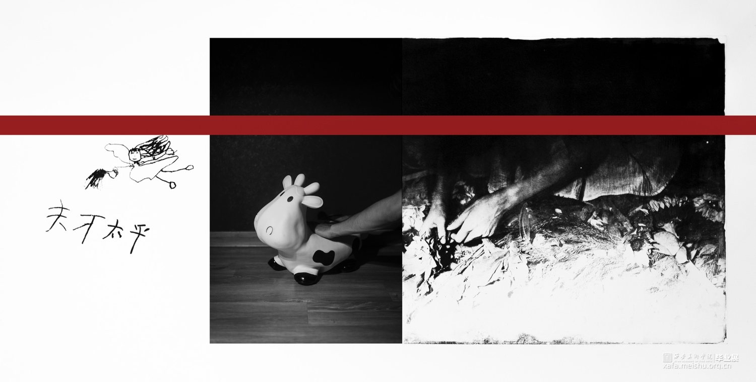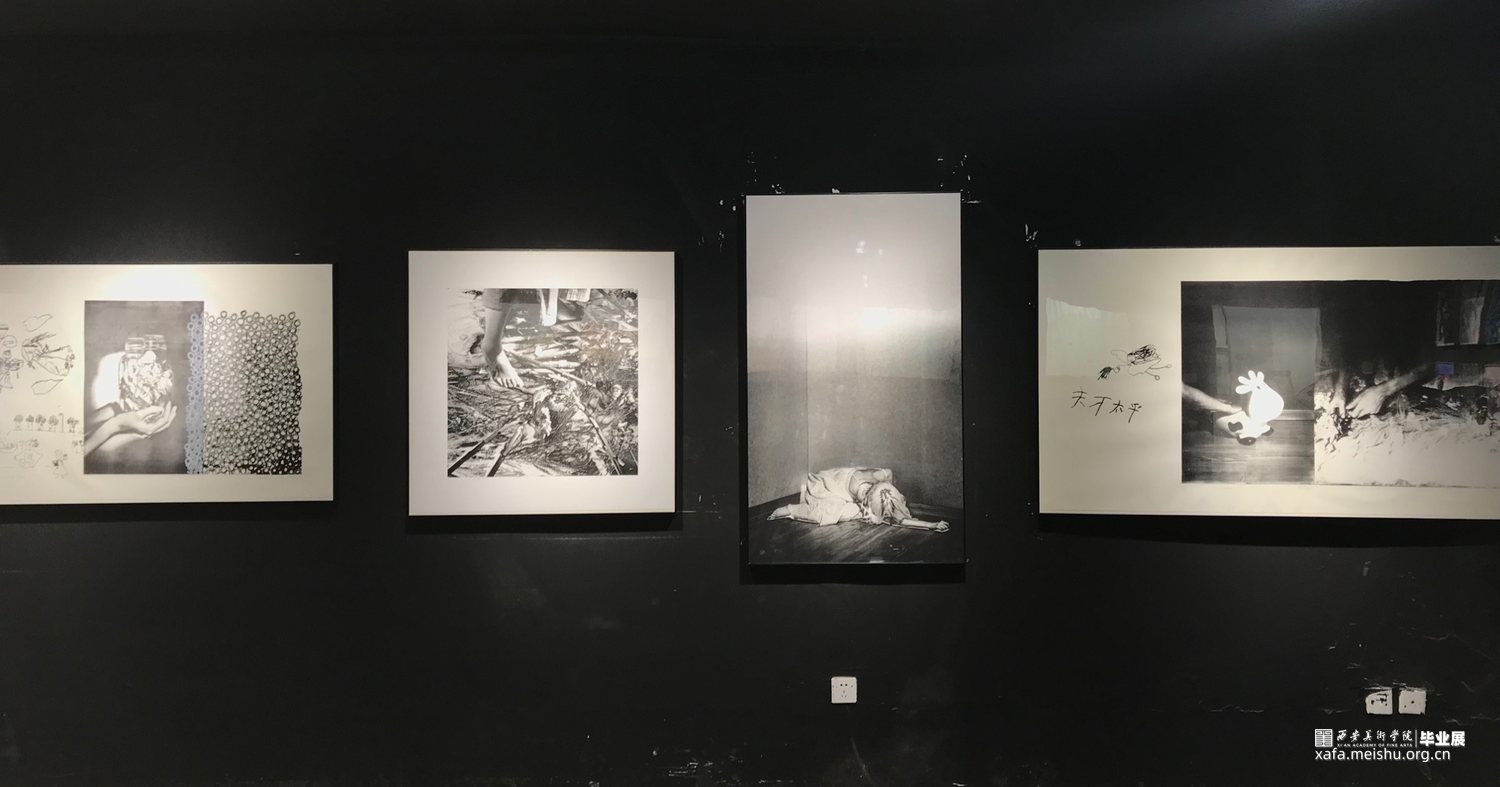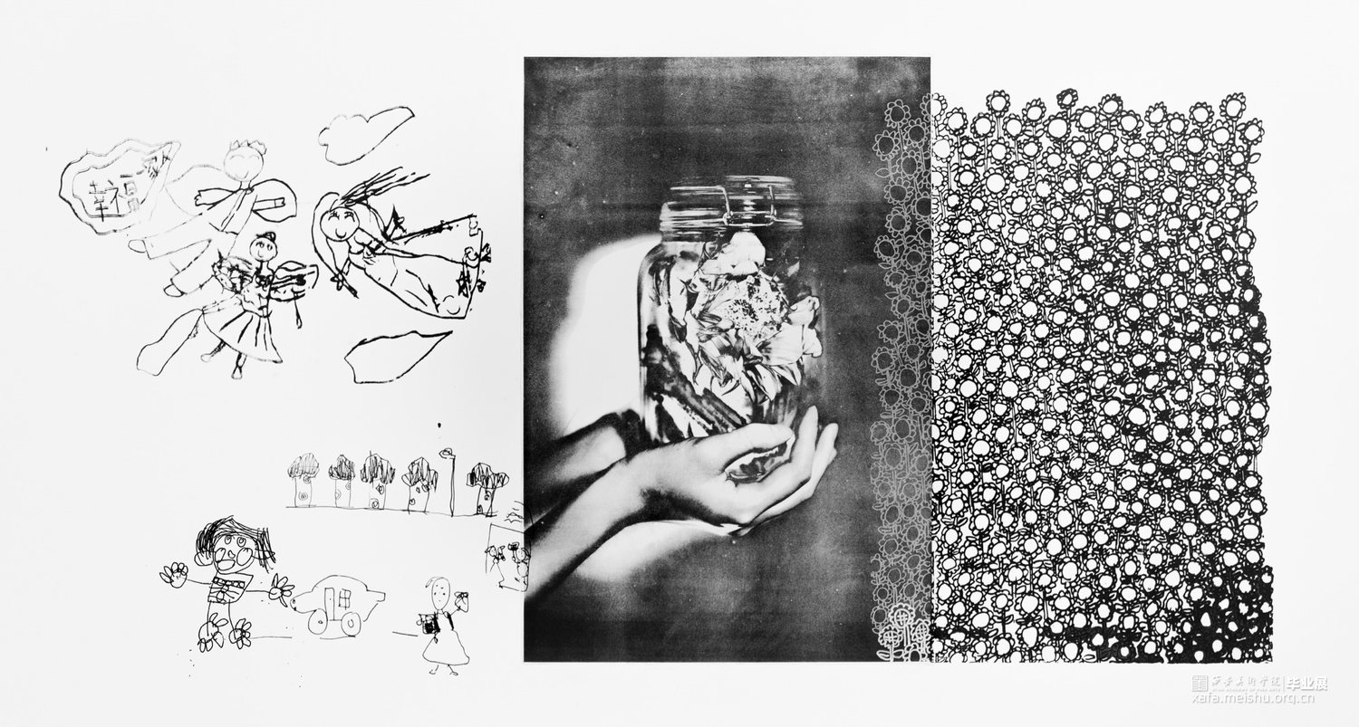 作品来源于身边深受原生家庭和成长环境、经历对成长造成消极影响的人。以珂罗版画、丝网版画和由书籍组成小装置呈现。书表达的是语言对成长的影响,言语对人的影响能大到以至于一生都受影响或者是无法忘却。书中收集的语言来自于我周边有这类经历的人们,白色是积极,黑色是消极,消极的影响足够大,所以一本黑色的书只有一句话的不断不重复,就像这句话不断在我们脑中出现。书是言语的,那么版画就是图像的,我用这两种方式把信息传达给观者。画中的向日葵象征成长,我没有让我的作品中完全充满负面情绪,我想以凄美的画传递成长受到消极影响的的人的心境。