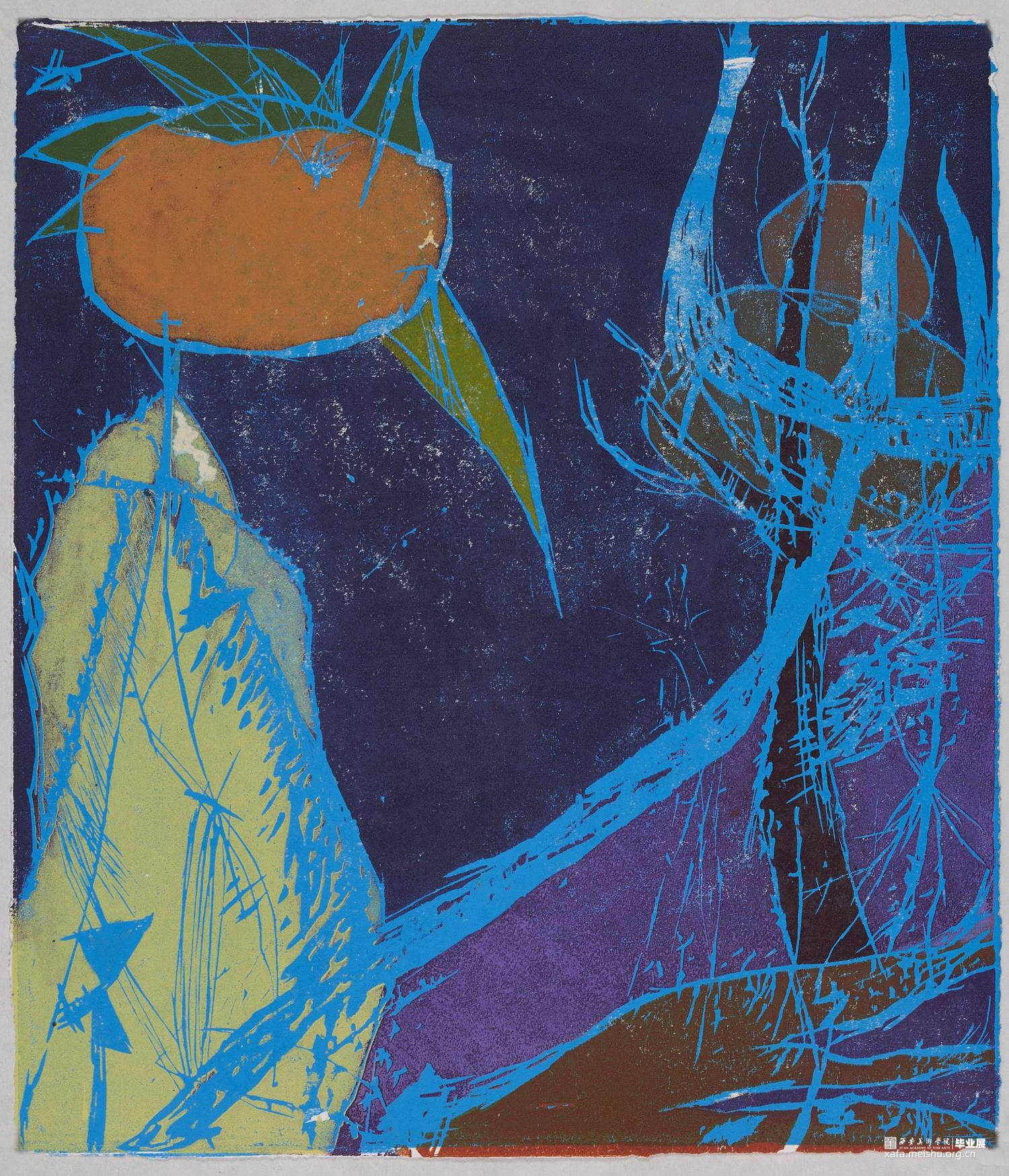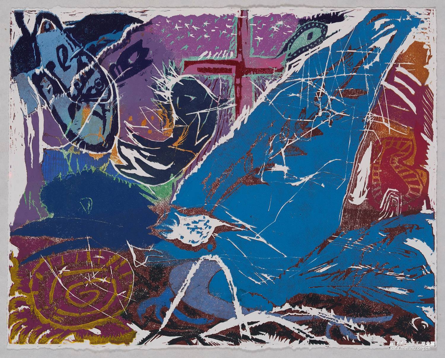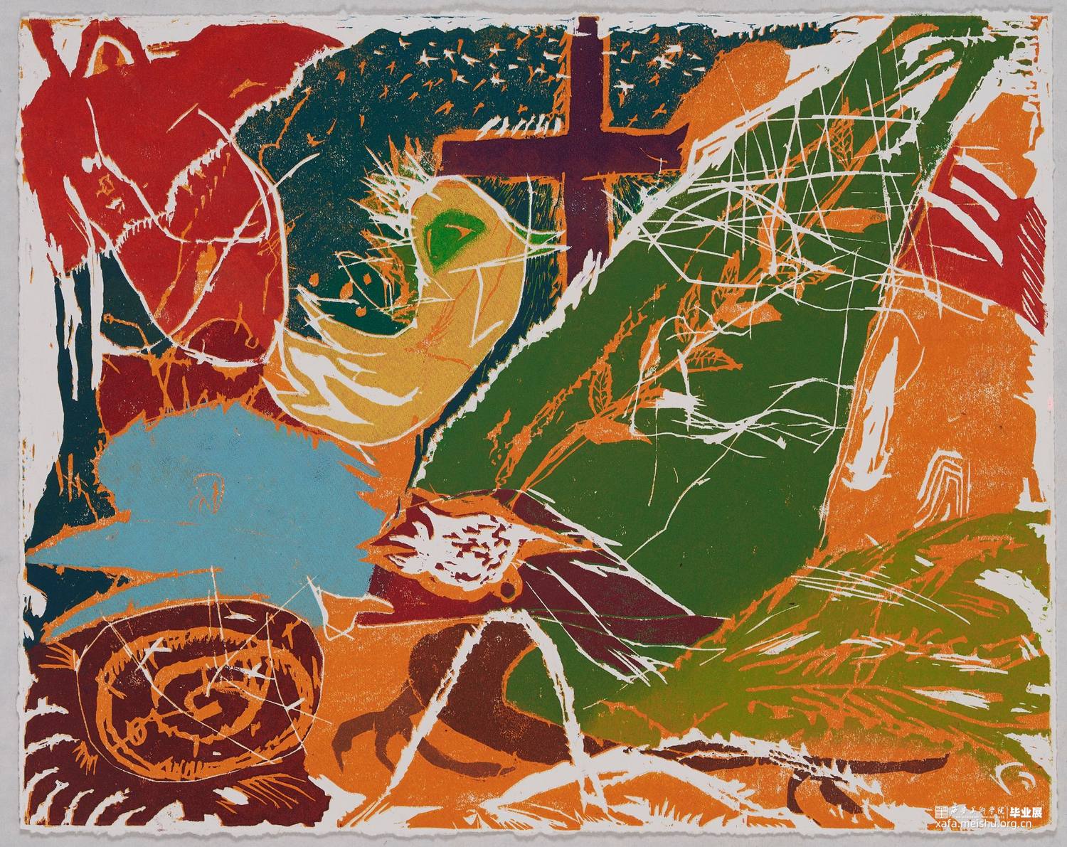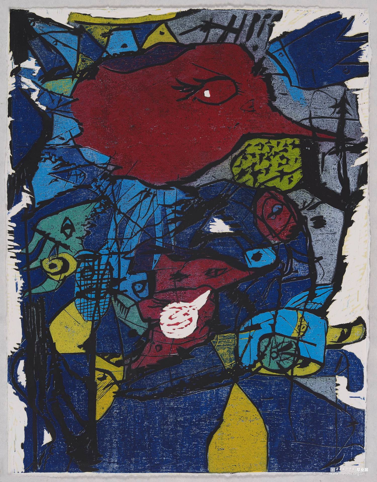 对原生艺术风格的学习与尝试,从画面题材、构成和题名都体现了无序,无限定与无意义。画面是纯粹的对形与色安排组合的探究。