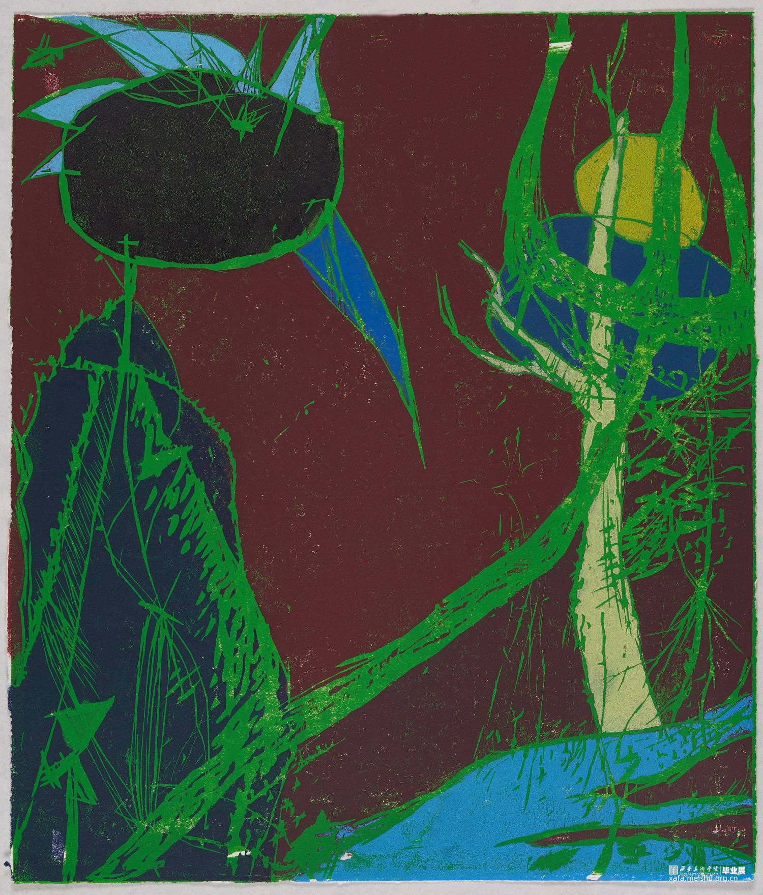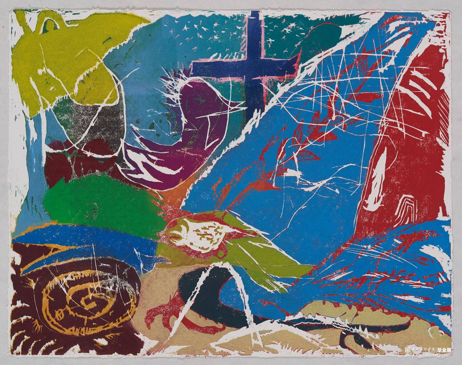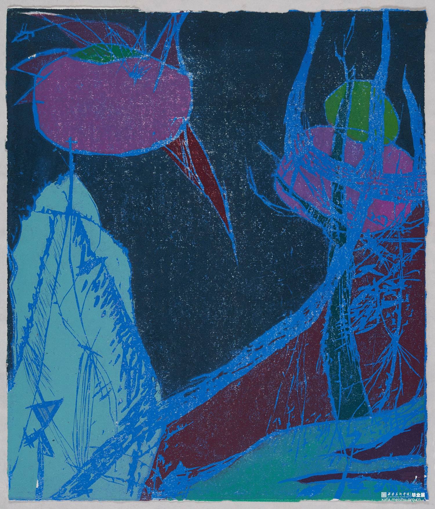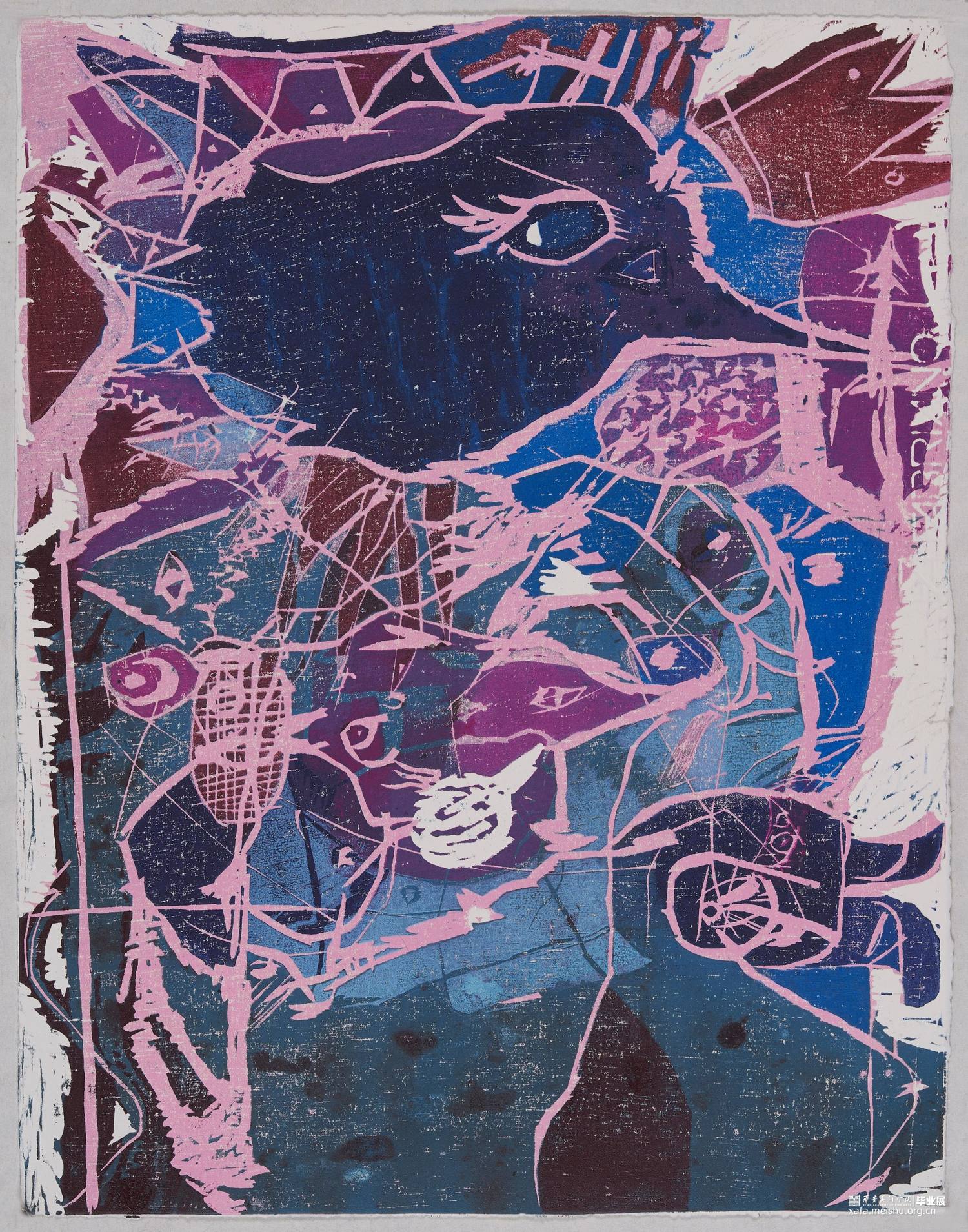 对原生艺术风格的学习与尝试,从画面题材、构成和题名都体现了无序,无限定与无意义。画面是纯粹的对形与色安排组合的探究。