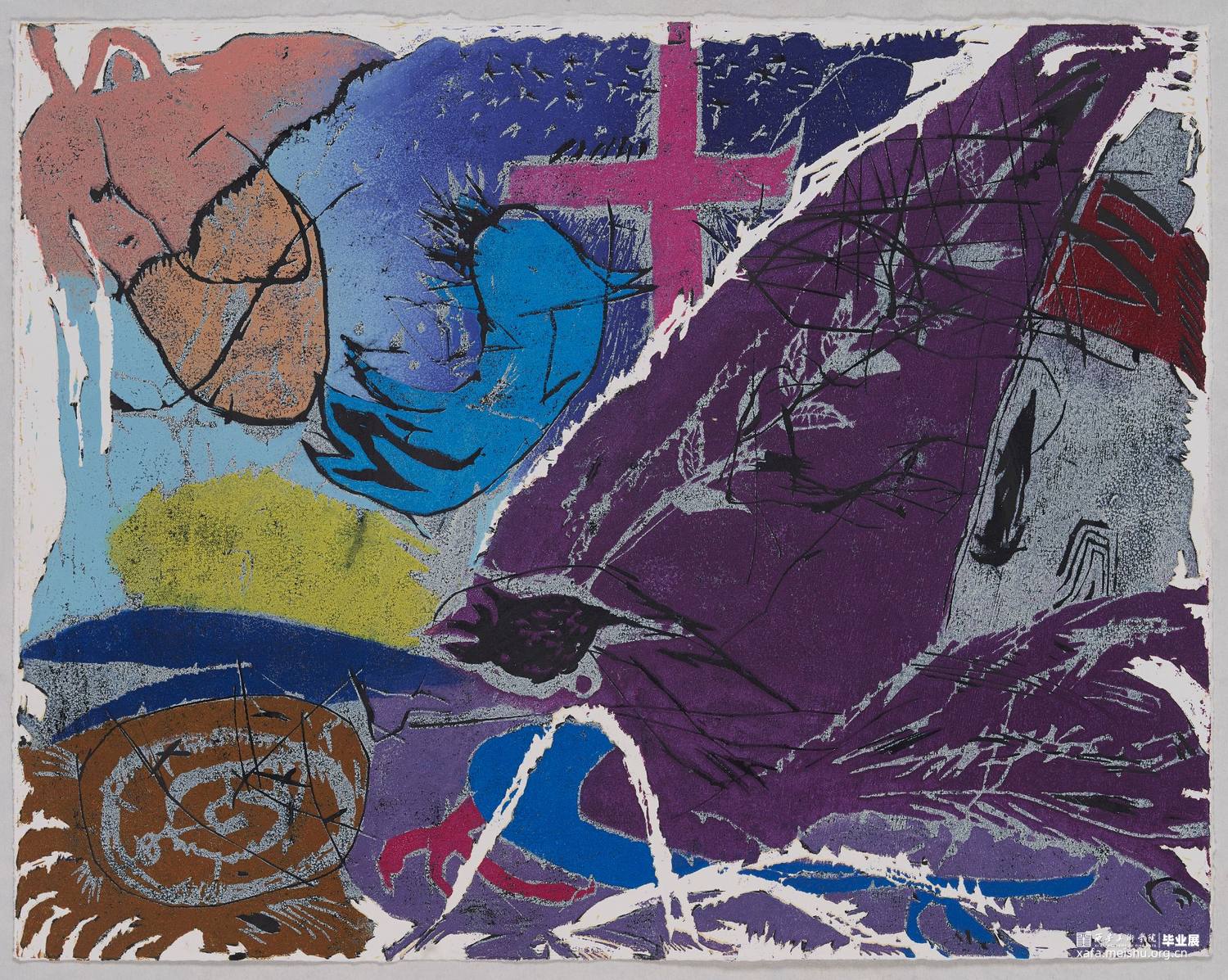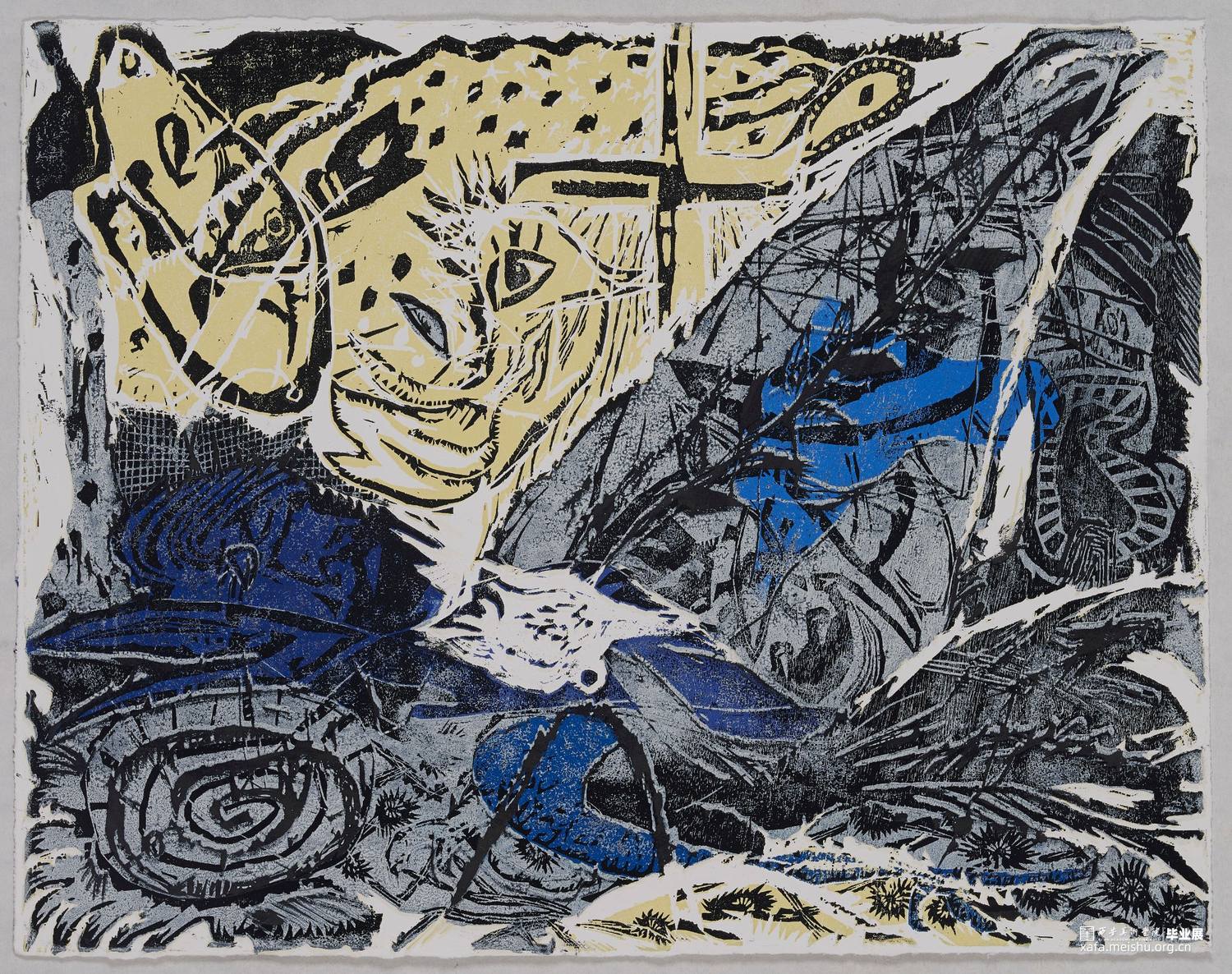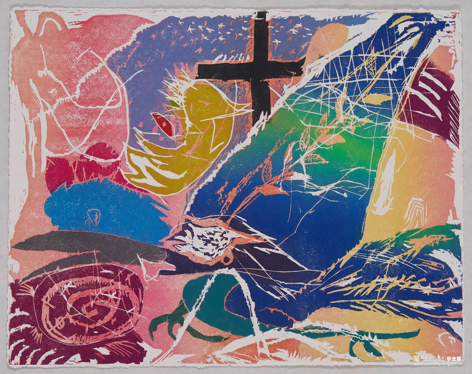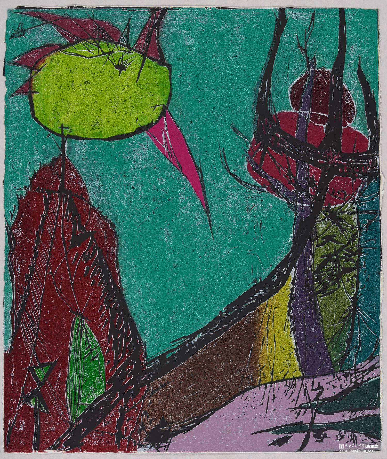对原生艺术风格的学习与尝试,从画面题材、构成和题名都体现了无序,无限定与无意义。画面是纯粹的对形与色安排组合的探究。